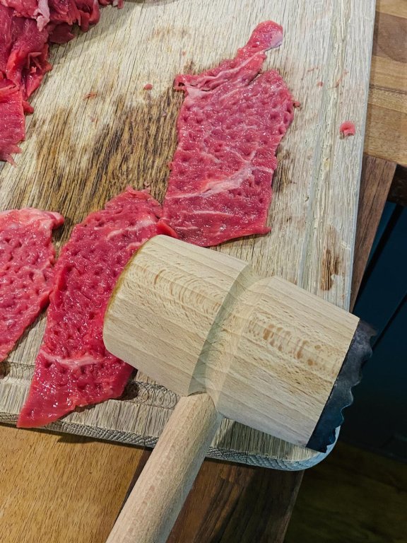 You'll need thin slices of veal - as you can see in my photos I couldn't find large slices so had a larger number of small pieces. In the event that lead to more and smaller parcels, and I quite like that; they leap into your mouth even more readily.