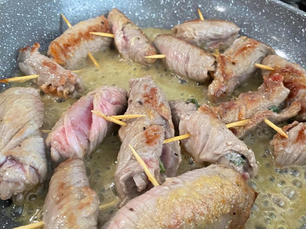 Roll each slice of veal with the prosciutto and sage on the inside, and hold it closed with a toothpick. There are those who then dust the parcels with flour - I don't, but it can make the little sauce a little richer.
