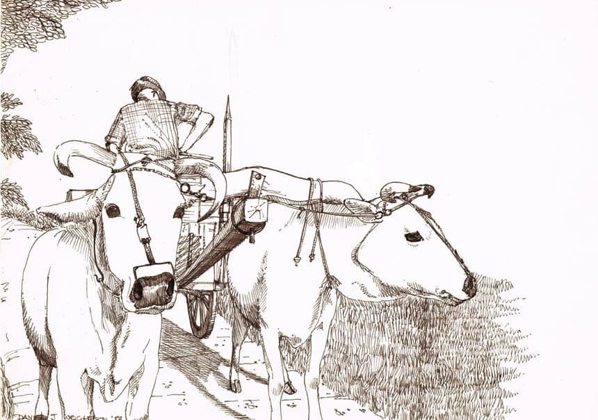 When we moved to Tuscany in the early 70s there were still farmers living under the mezzadria system. I made this sketch of our neighbour who still used his white oxen to get around (when he wasn't ploughing with them). He would occasionally give me sister and me a lift to school on the beautiful cart.