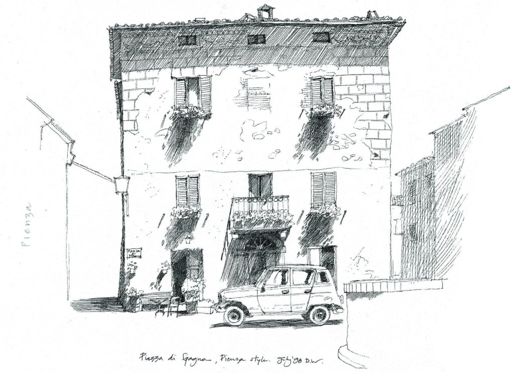 Pienza was once called Corsignano and in 1405 was the birth place of Enea Piccolomini who later became Pope Pius II. During a trip north from Rome in 1459 Pope Pius passed through his birthplace and found it in a dire state, degraded and with buildings in ruins. He was travelling with Leon Battista Alberti and his student Bernardo Rossellino and, after discussion with them, Pope Pius II decided to remodel Pienza, and to do so according to his humanist beliefs, attempting to create the Ideal City, a Renaissance idea whereby one could attempt to mirror the perfection of heavenly proportions and layouts here, and thus also create a better society on earth. He charged Bernardo Rossellino with this quite daunting task and the architect Bernardo started work, under instruction to respect the existing quirks and angles of the existing town.