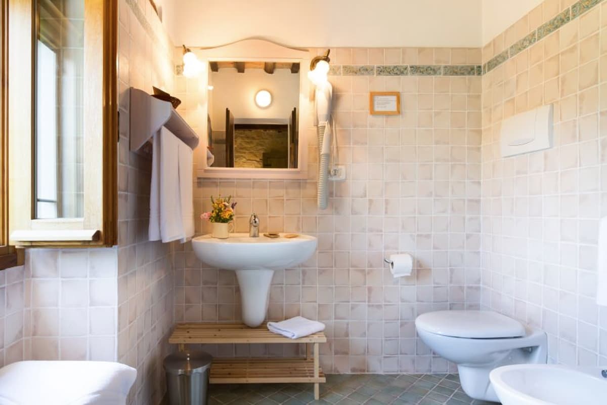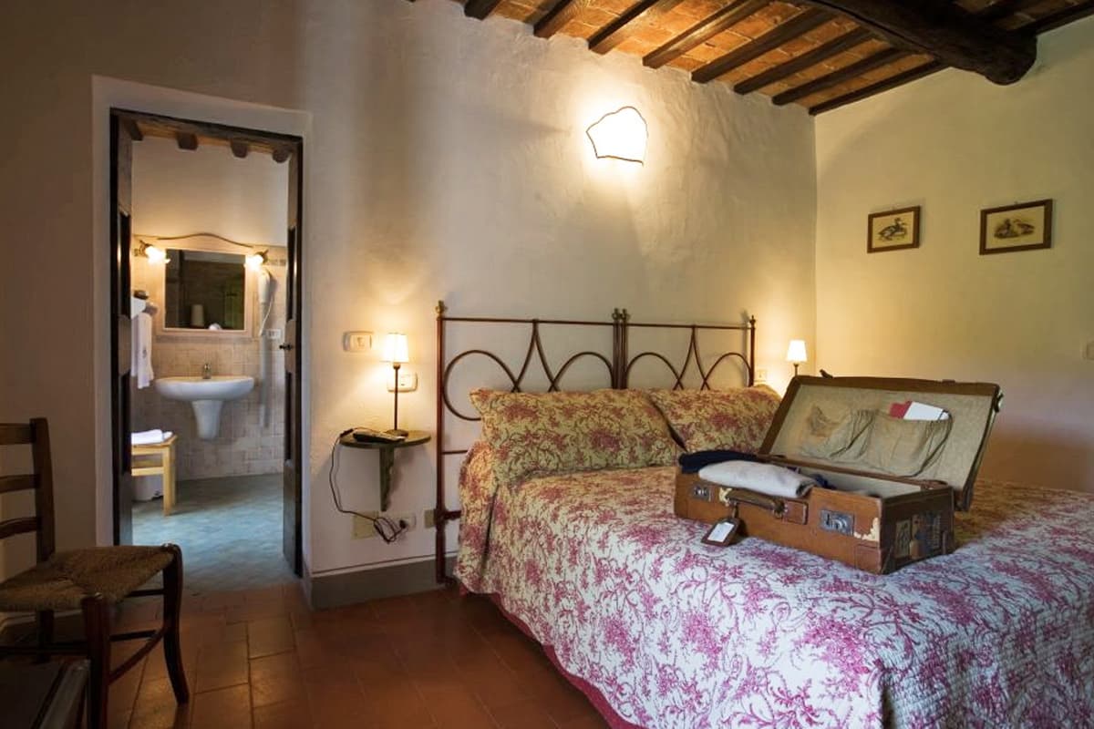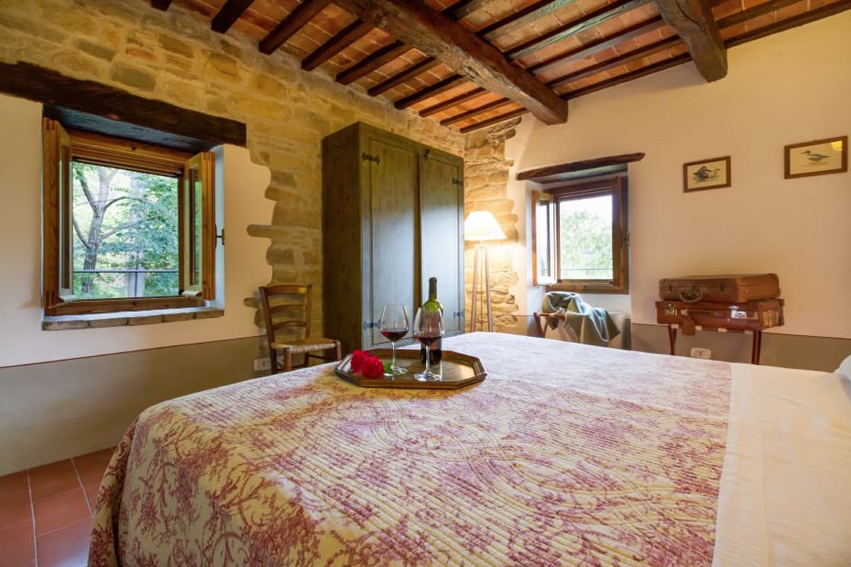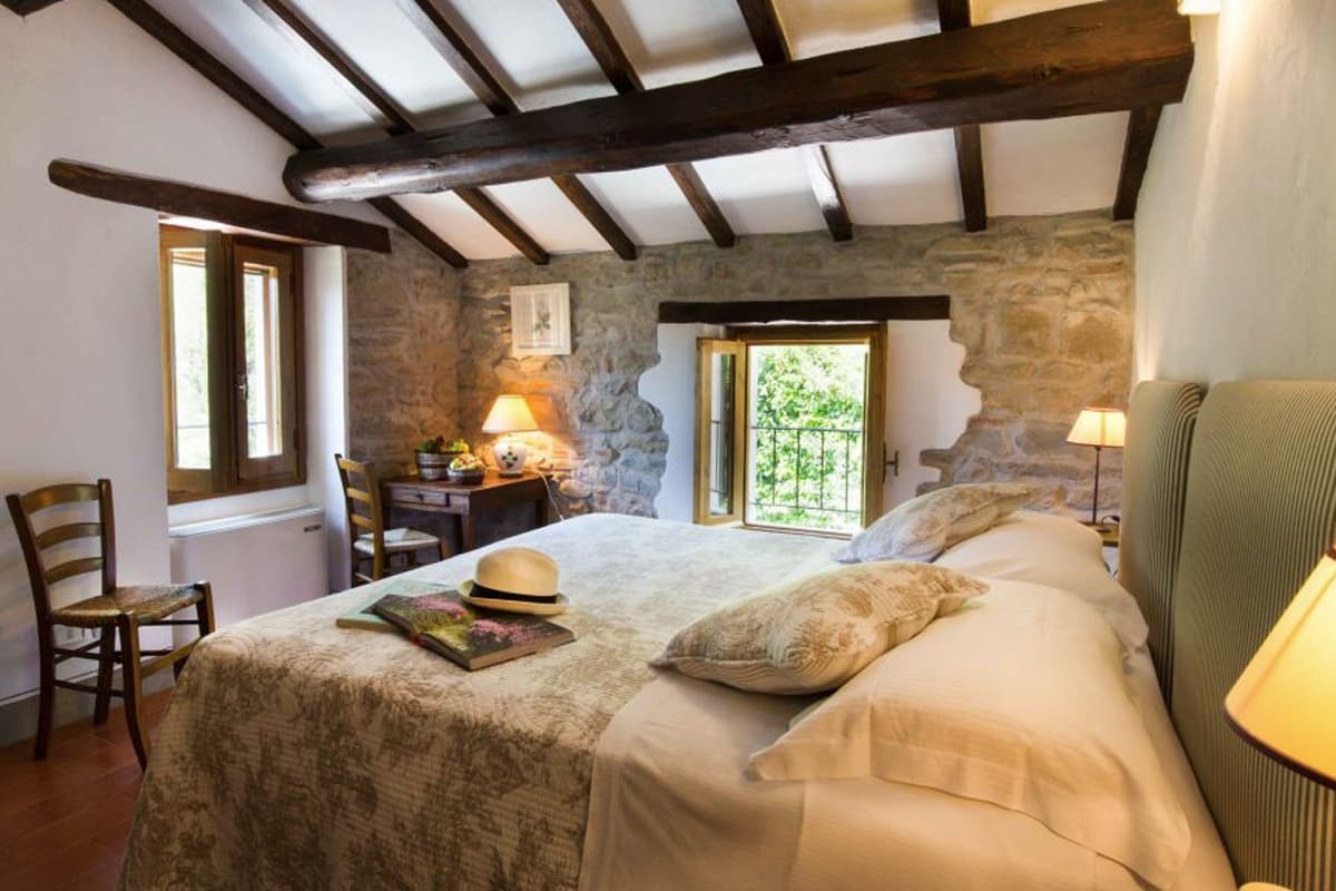 Sleeping accommodations are on the upper floors, the first floor of which is reached via the external staircase at the side of the house. Off the entrance hall is a study with satellite TV and a sofa-bed that can be requested should an extra guest join the group. Also on this level is a lovely double bedroom with an ensuite shower room. As in all the Torretta bedrooms, the rustic charm of its beamed ceilings and exposed stonework blends beautifully with country antiques and attractive soft furnishings. And internal staircase leads from the first to the second floor where two further bedrooms, each which an ensuite shower room, can be set up as either doubles or twins on request.