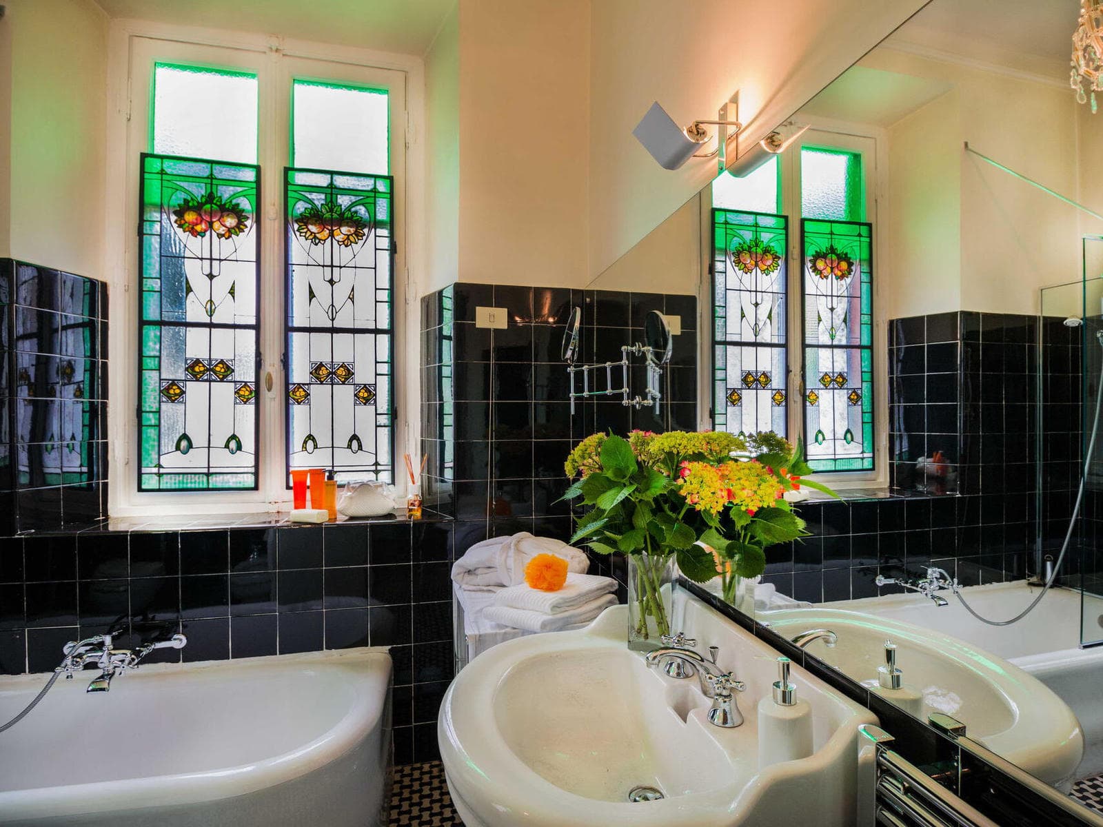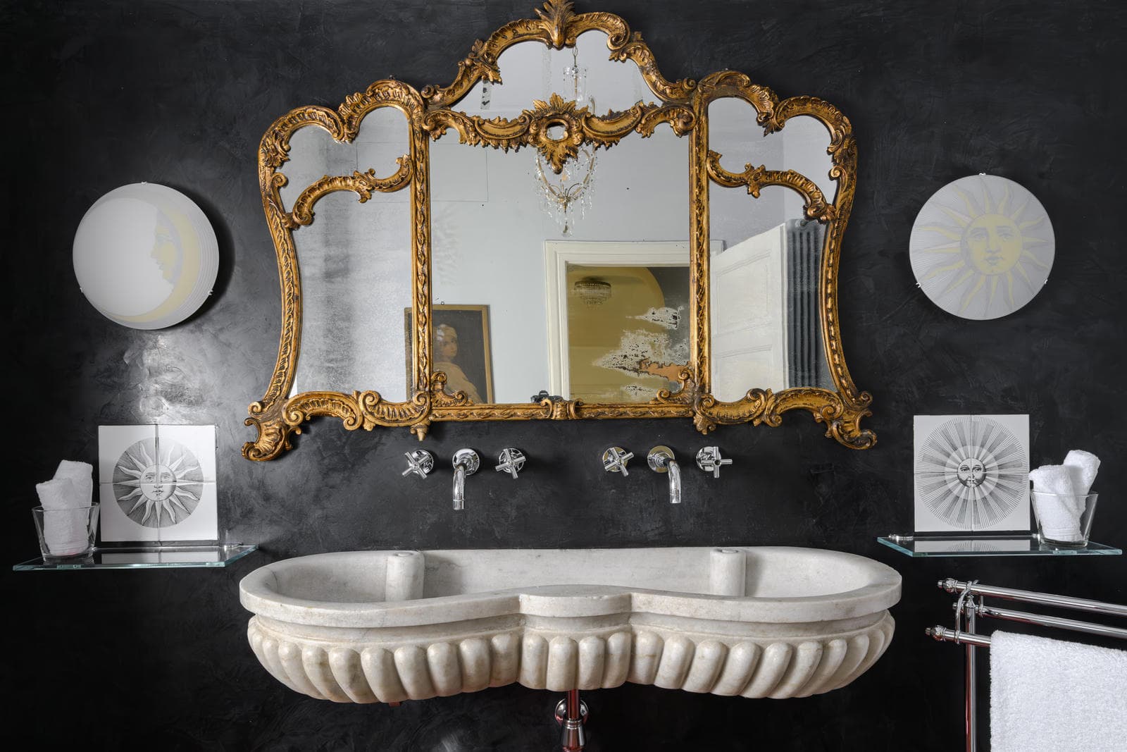 The third floor hosts the enchanting Room Fornasetti, a twin bedroom with two beds (90 cm x 200 cm each) that can be joined to form a double bed. This room also boasts memory foam mats and pillows, along with a luxurious bathroom featuring a marble basin and a large Jacuzzi shower with Chromotherapy.