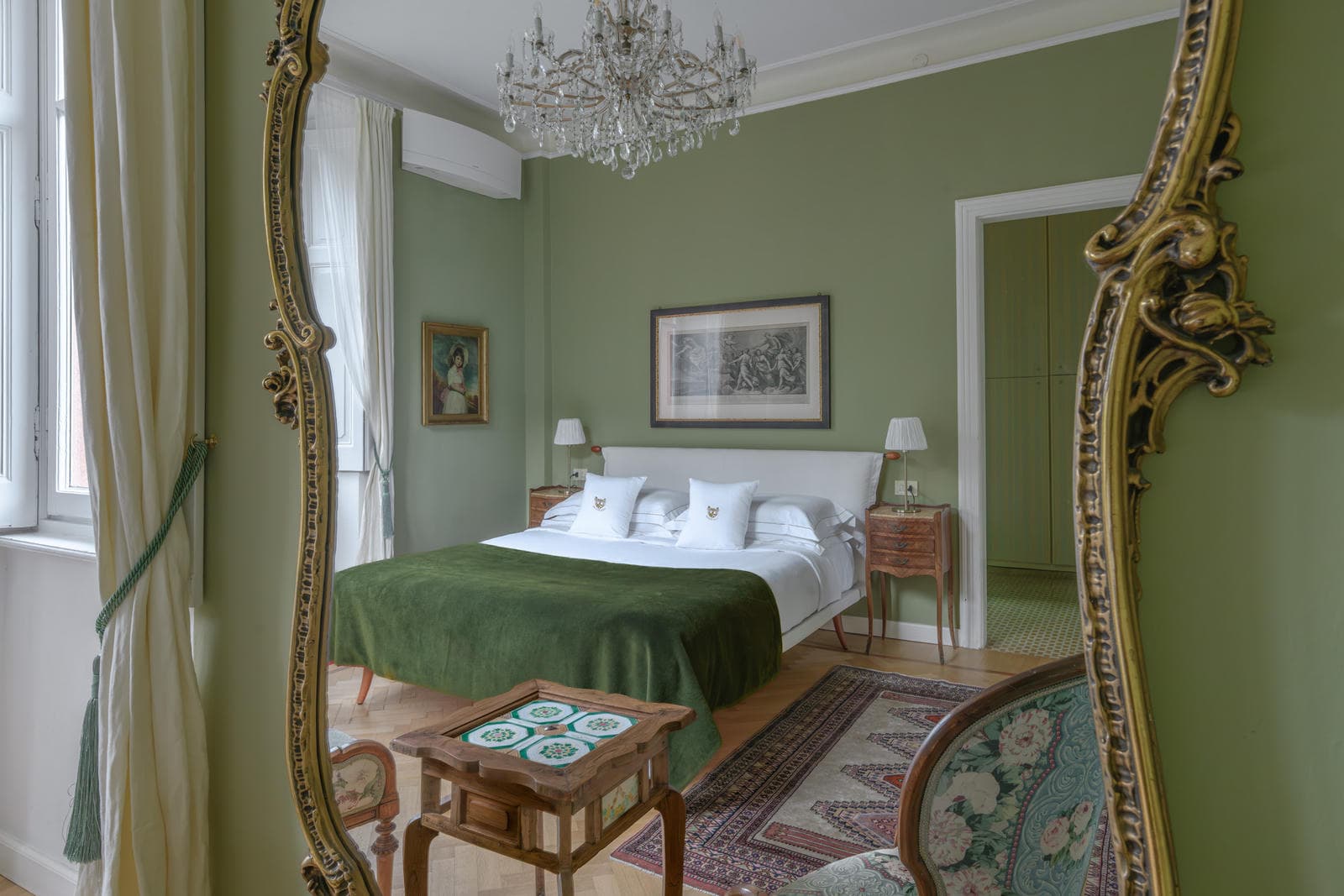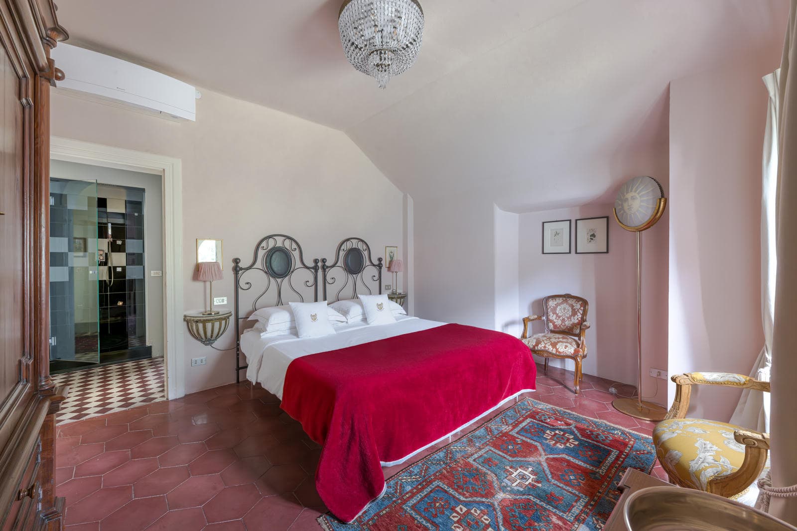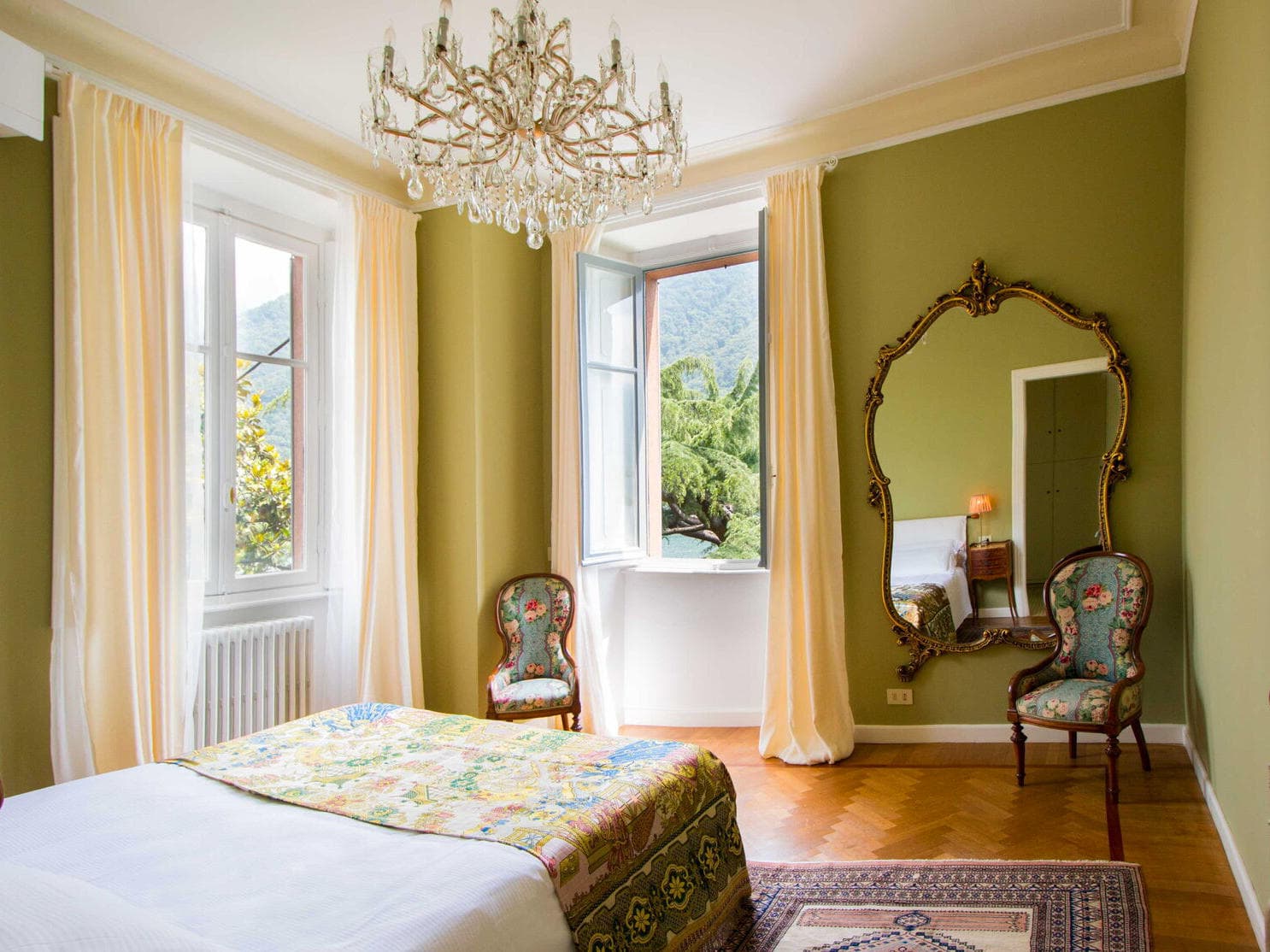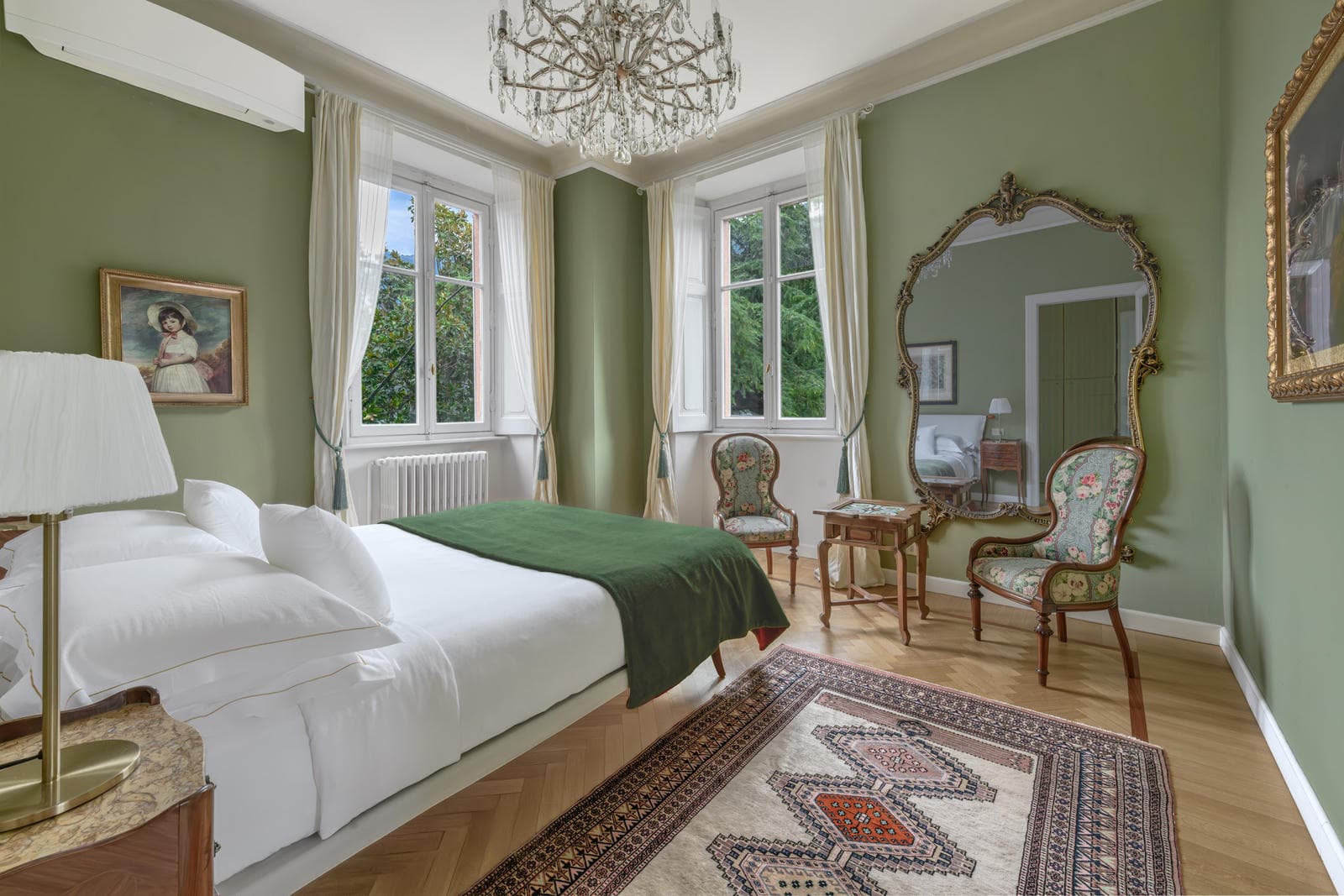 The second floor houses three elegantly appointed bedrooms, all offering air conditioning and breathtaking views of Lake Como. The Green bedroom features a luxurious double bed (180 cm x 200 cm) with memory foam mats and pillows, as well as a Liberty-style bathroom with a tub and a safe for valuables.