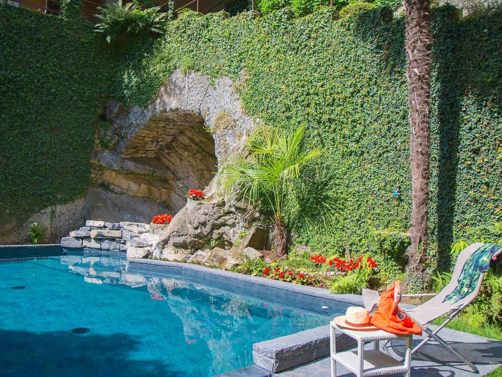 The lower level and garden area feature an Infinity pool (8m x 4m x 1.4m) with a Jacuzzi, chaise lounges, and garden furniture, providing an oasis for relaxation.