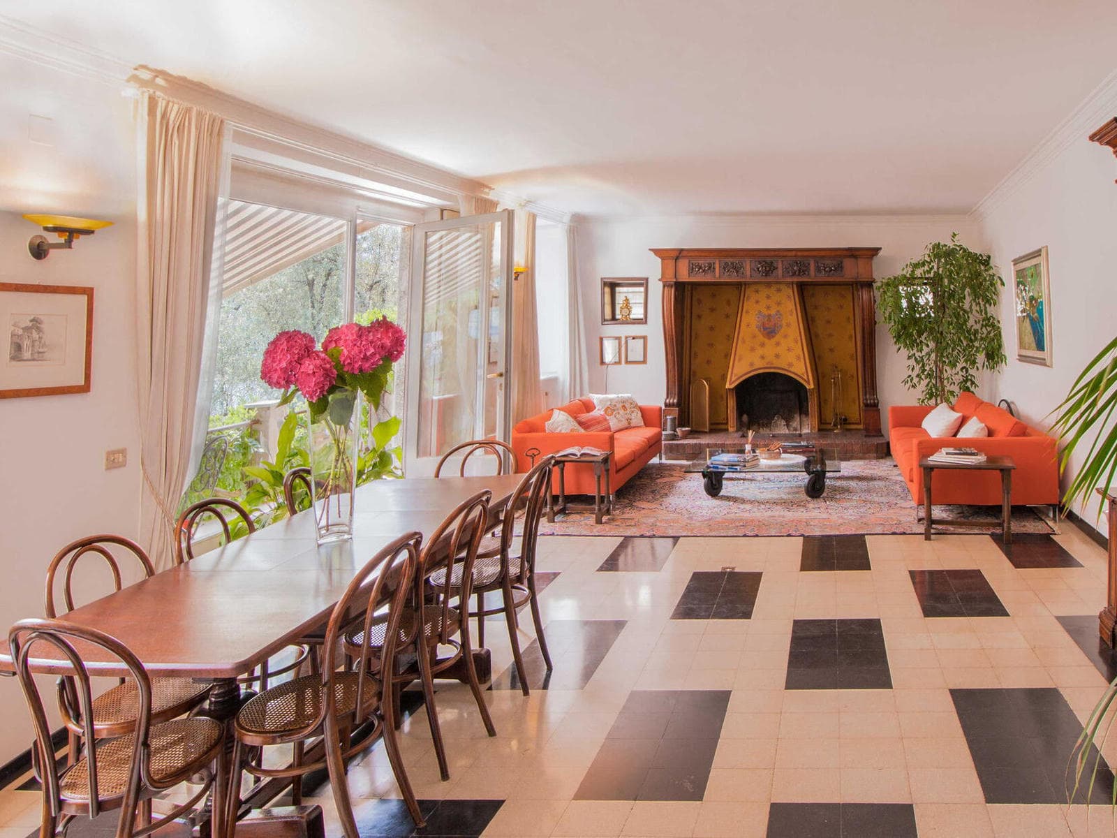 On the first floor, upon entering, guests are greeted by a spacious living room adorned with a working fireplace, two sofas, and a dining area that opens onto a furnished terrace, ideal for al fresco dining.