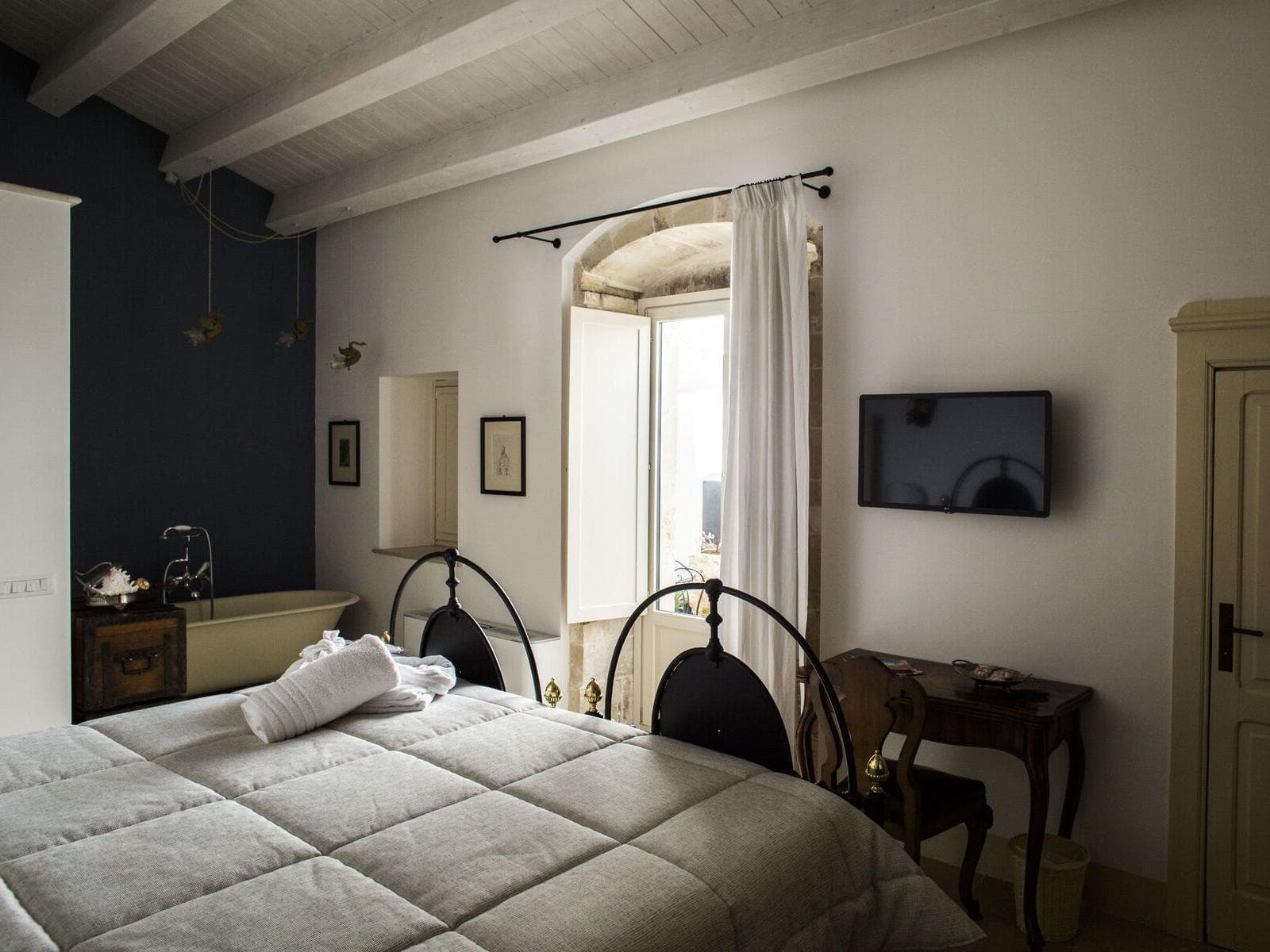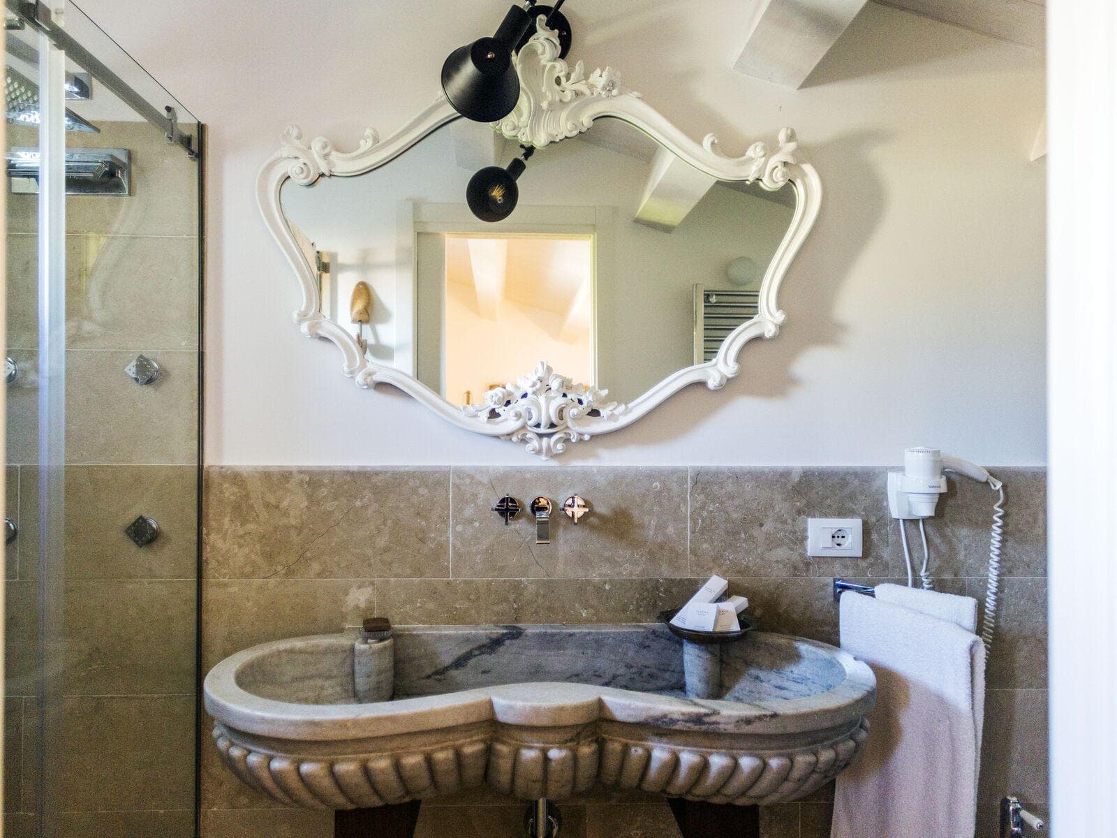 Suite Clo (25 m²) features a king-size bed (200x200) and is equipped with an antique scenic stone bath in the room, in addition to a shower. It includes a private winter garden furnished with table and chairs.