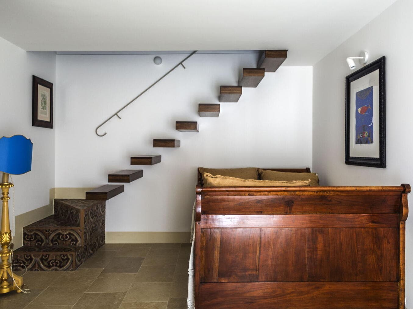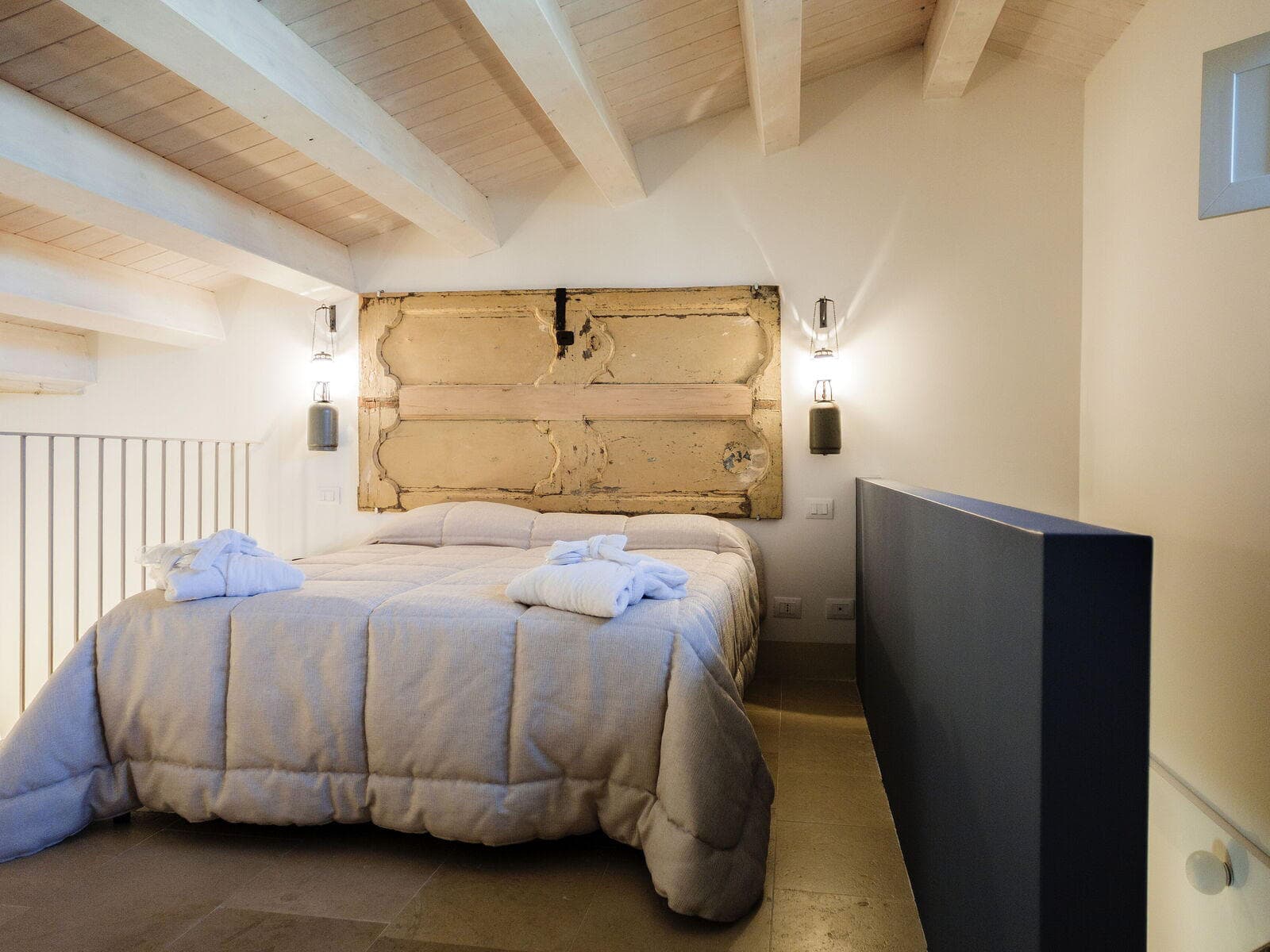 Suite Corn (35 m²) is a spacious loft bedroom that can accommodate up to four guests. It features a double bed on the ground floor (French size, 140x200) and another double bed on the loft (queen size, 180x200), has a private terrace of approximately 15 square meters and furnished with table and chairs, offering views of the inner courtyard.
