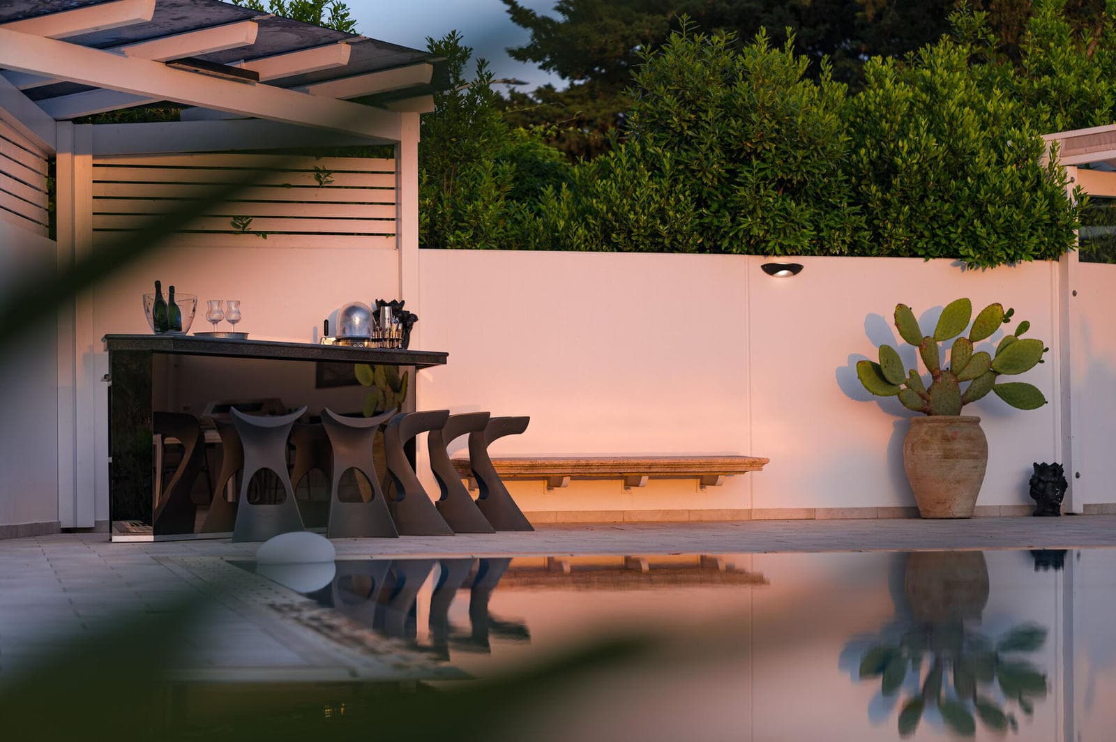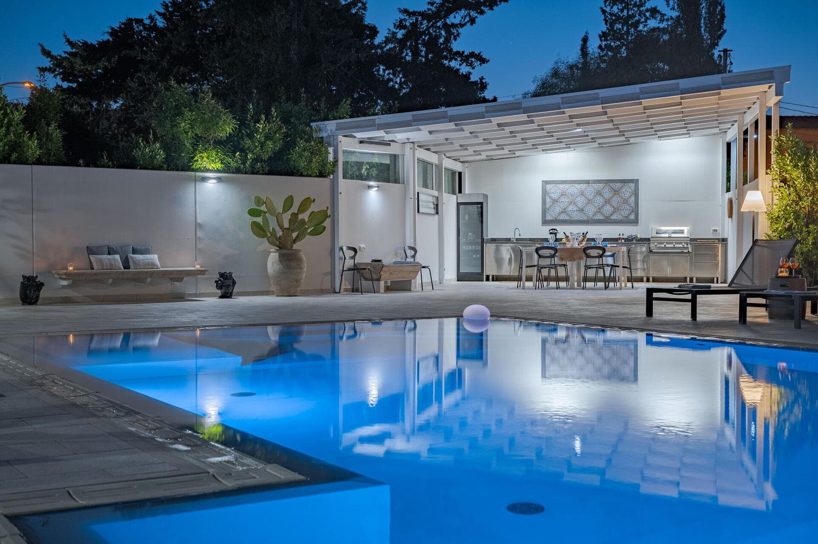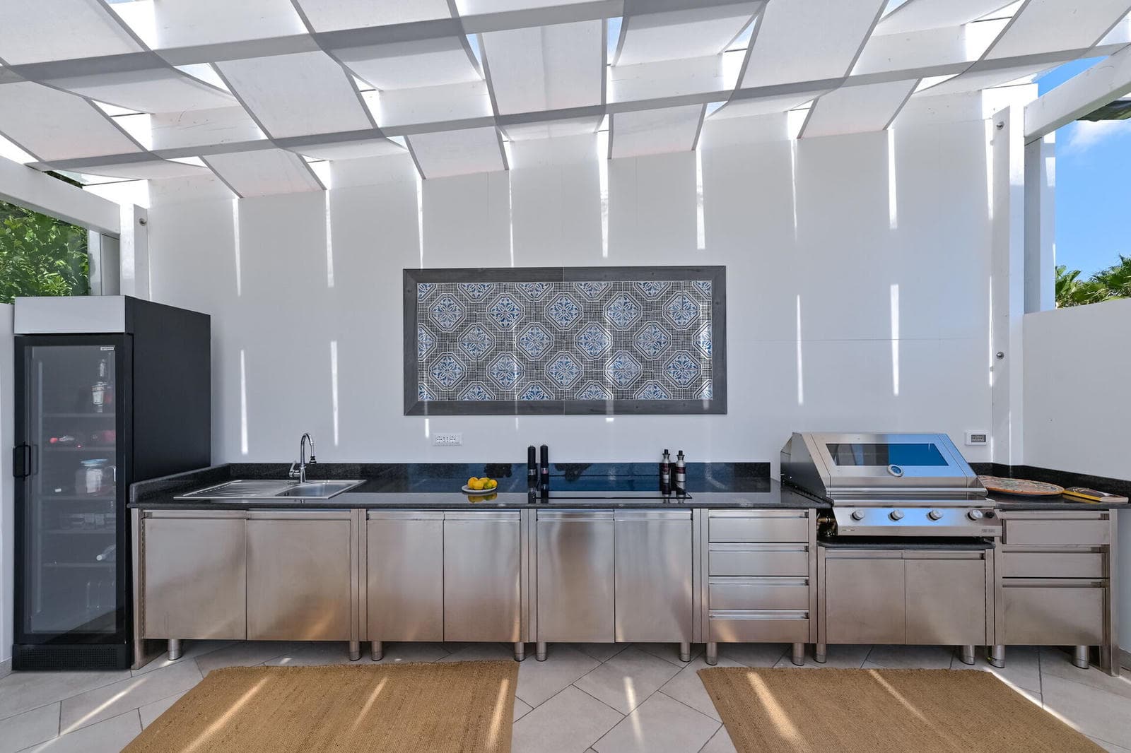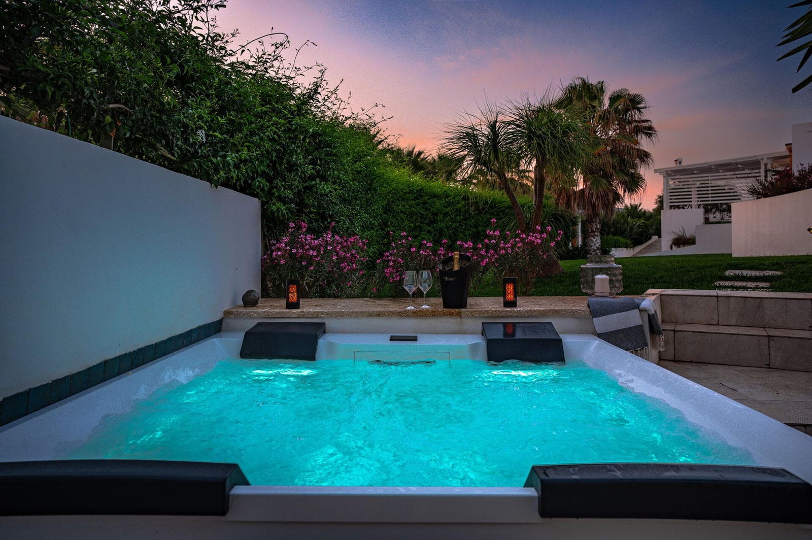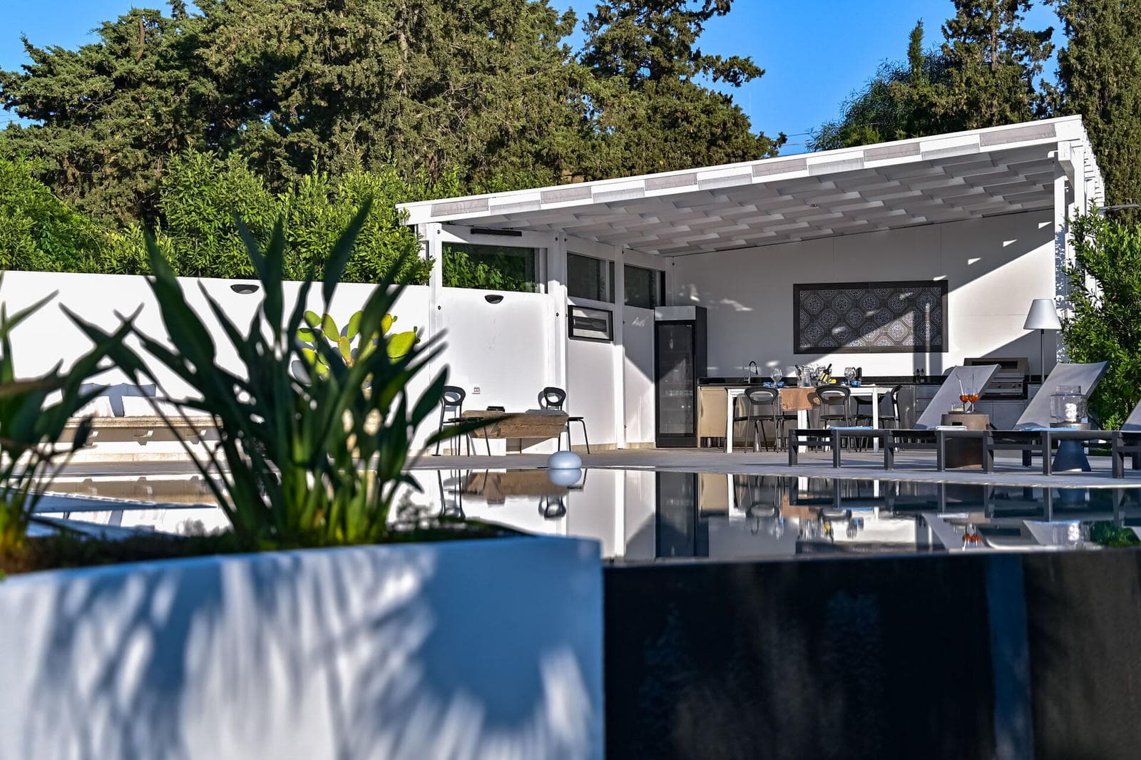 On this floor there is also a fully professional kitchen with a central island and skylight, a laundry area with a washing machine and bathroom. Additionally, a double bedroom featuring a queen bed (160 x180 m) and a spacious ensuite bathroom with shower provides garden view and direct access to the front terrace and. A second double bedroom with a queen bed (160 x180 m) and a spacious ensuite bathroom with shower offers pool view and direct access to the garden.
