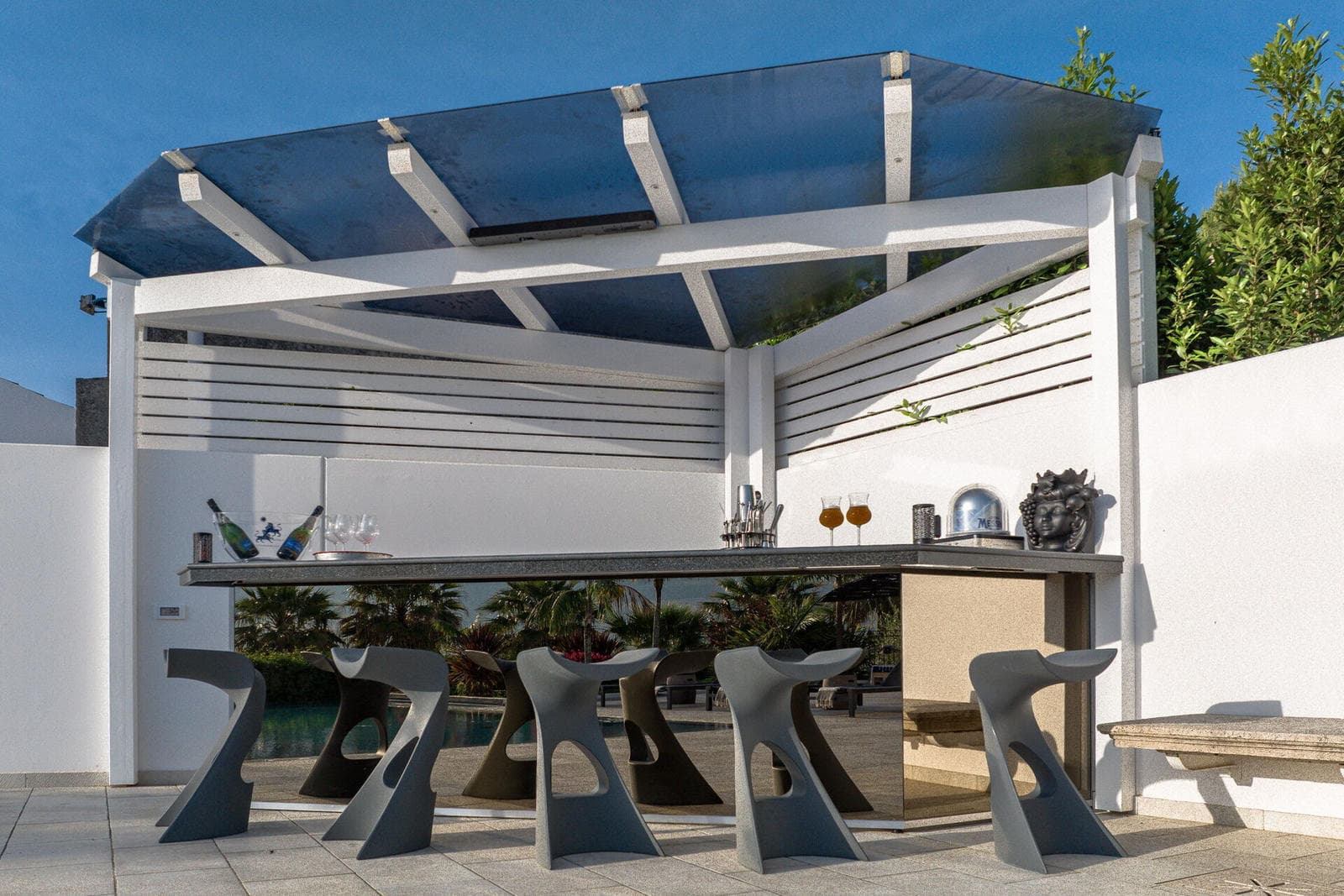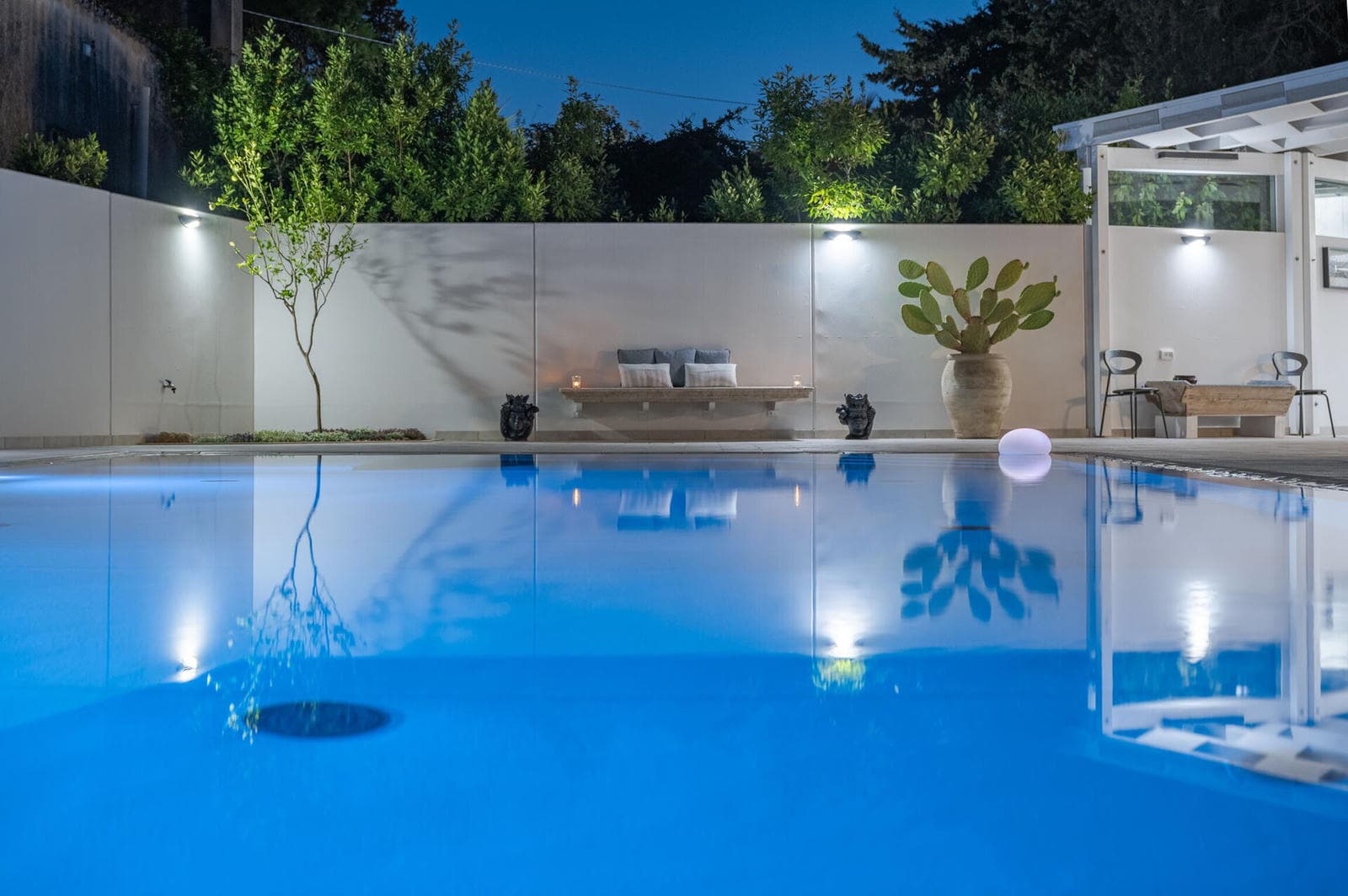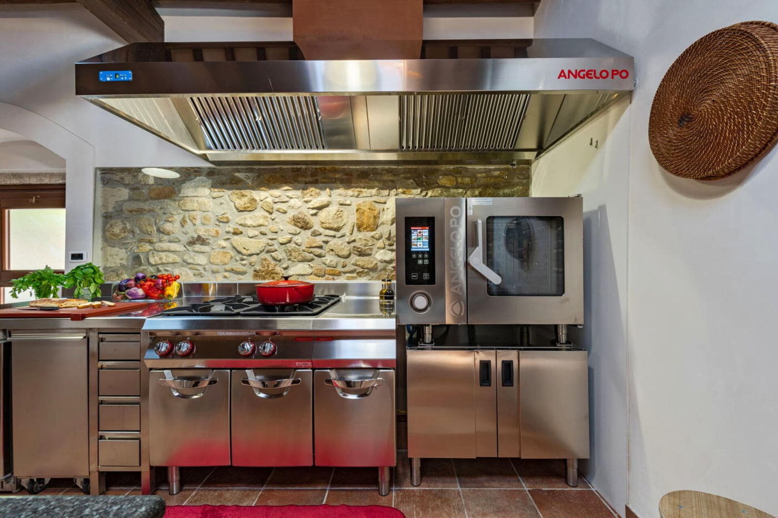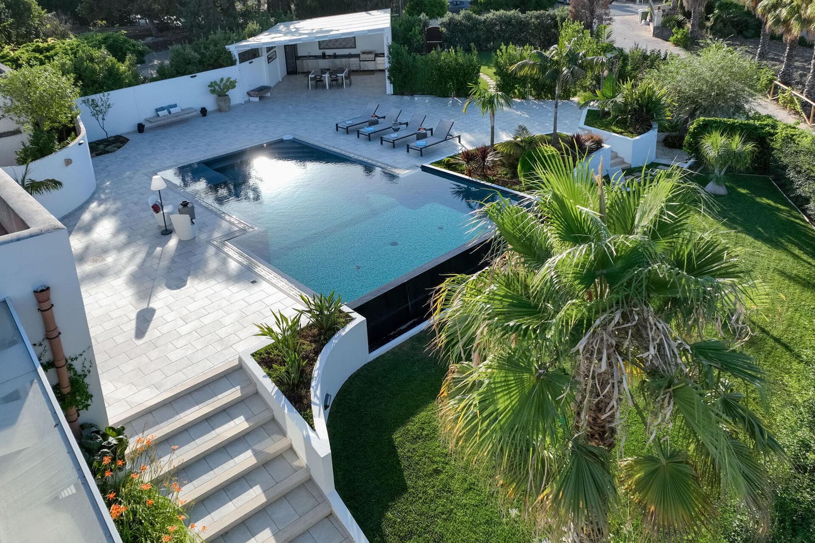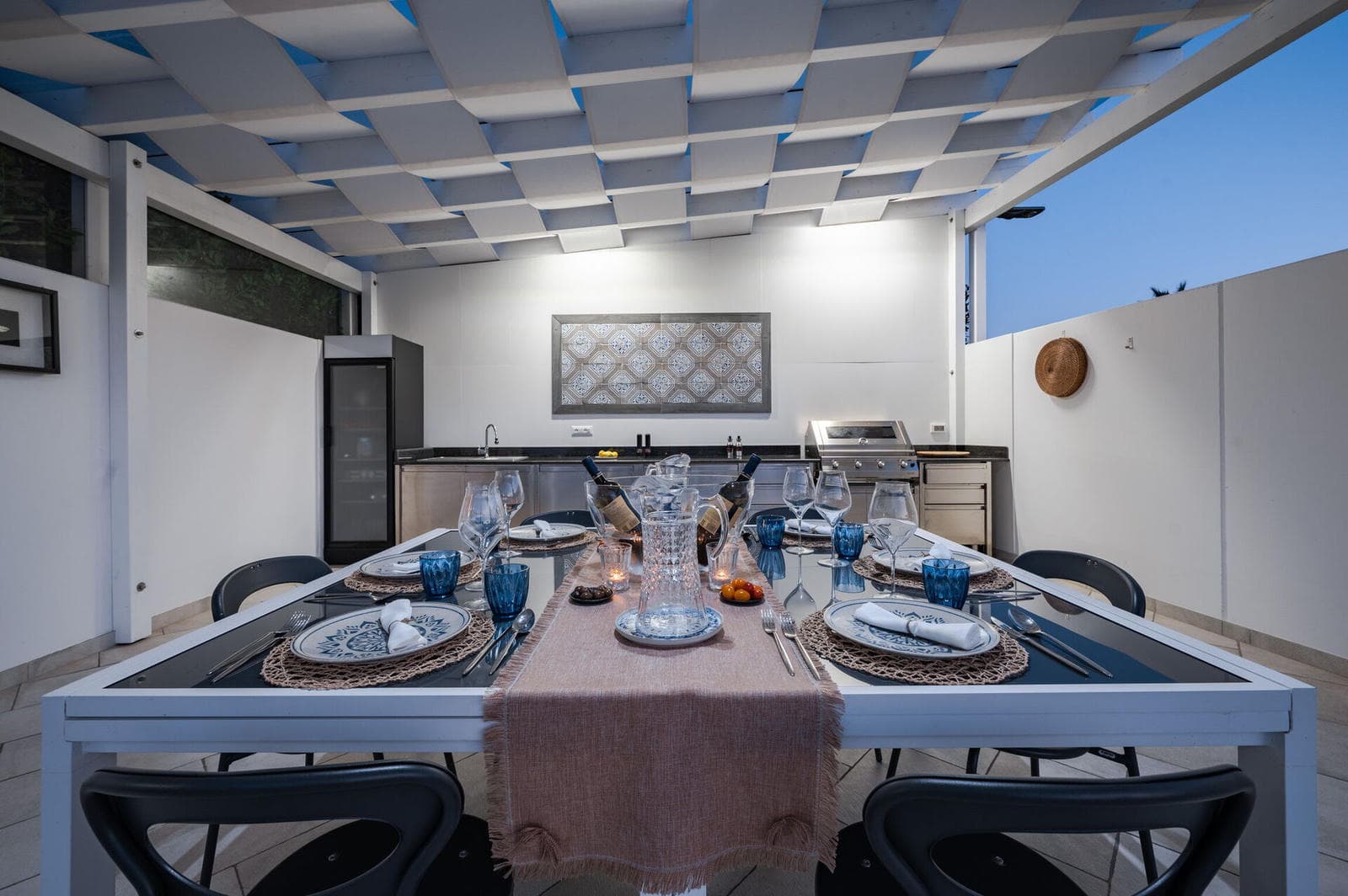 On this floor there is also a fully professional kitchen with a central island and skylight, a laundry area with a washing machine and bathroom. Additionally, a double bedroom featuring a queen bed (160 x180 m) and a spacious ensuite bathroom with shower provides garden view and direct access to the front terrace and. A second double bedroom with a queen bed (160 x180 m) and a spacious ensuite bathroom with shower offers pool view and direct access to the garden.