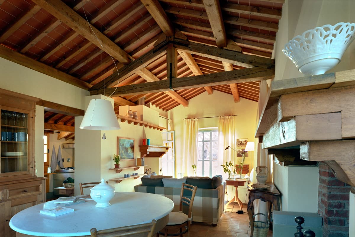 A stairway from the entry hall leads up to the kitchen, whose clean lines and modern appliances blend well with the beams and original flooring which frame it. A spacious sitting/dining room spans the width of the house. At one end there is a round marble-topped dining table for four near French doors that open to a balcony overlooking the garden; at the other end, two sofas are bathed in light from two French doors leading to a generous wrap-around balcony overlooking the estate’s central piazza. The balcony extends and gently follows the path leading down to the garden.