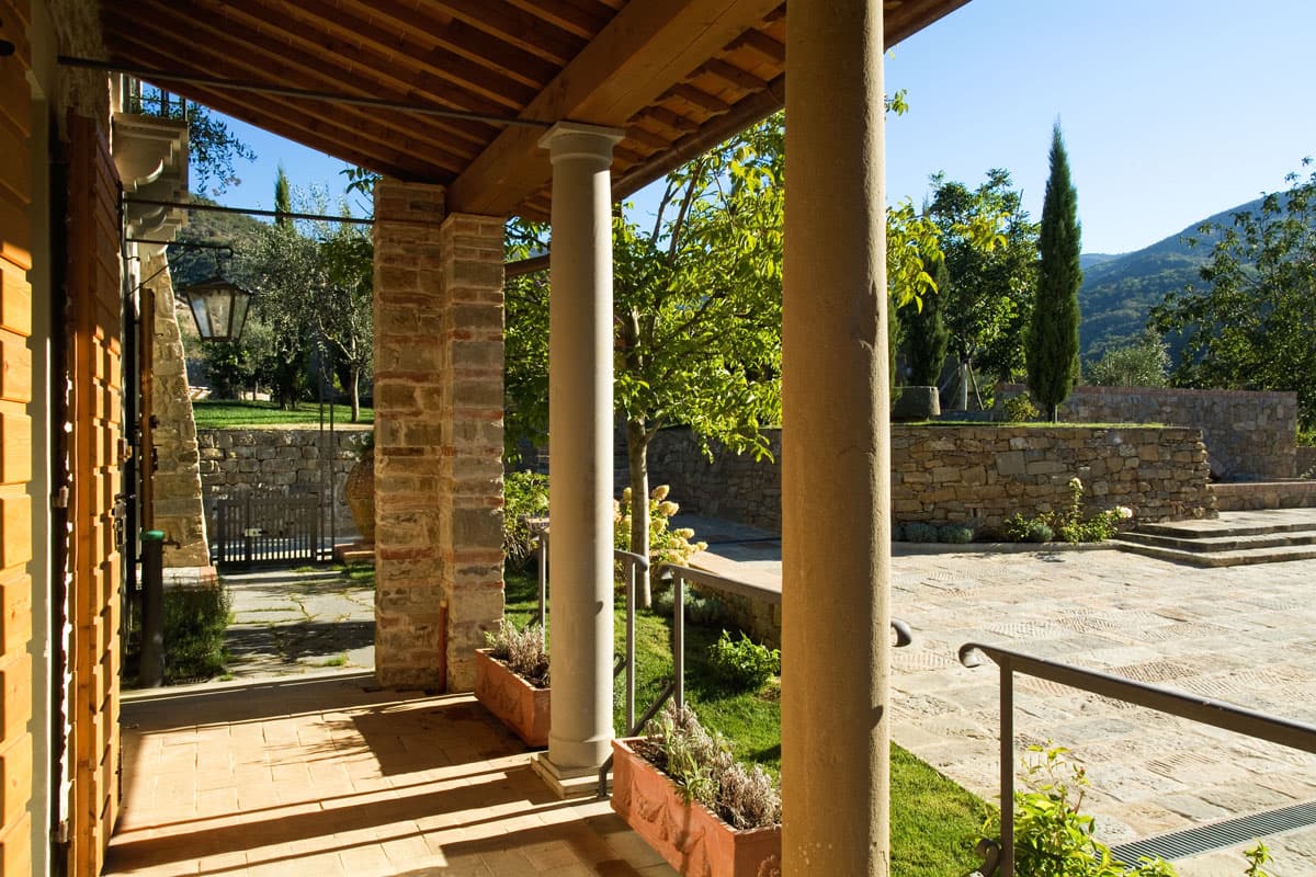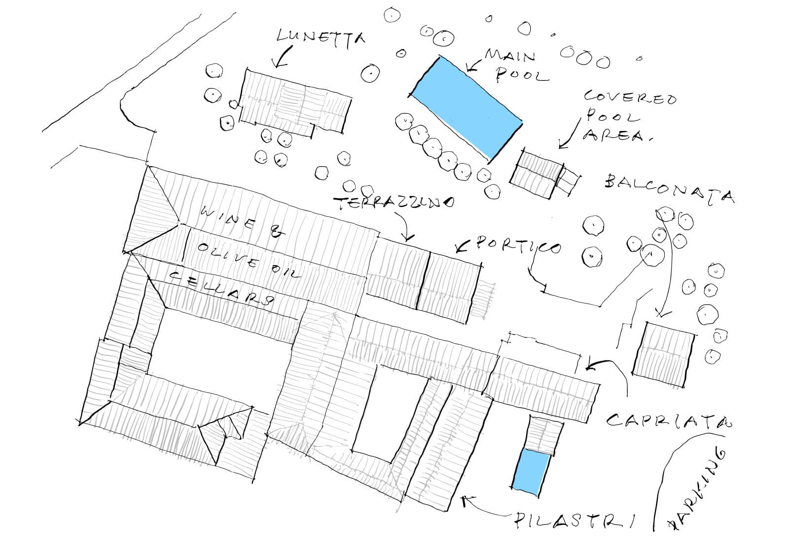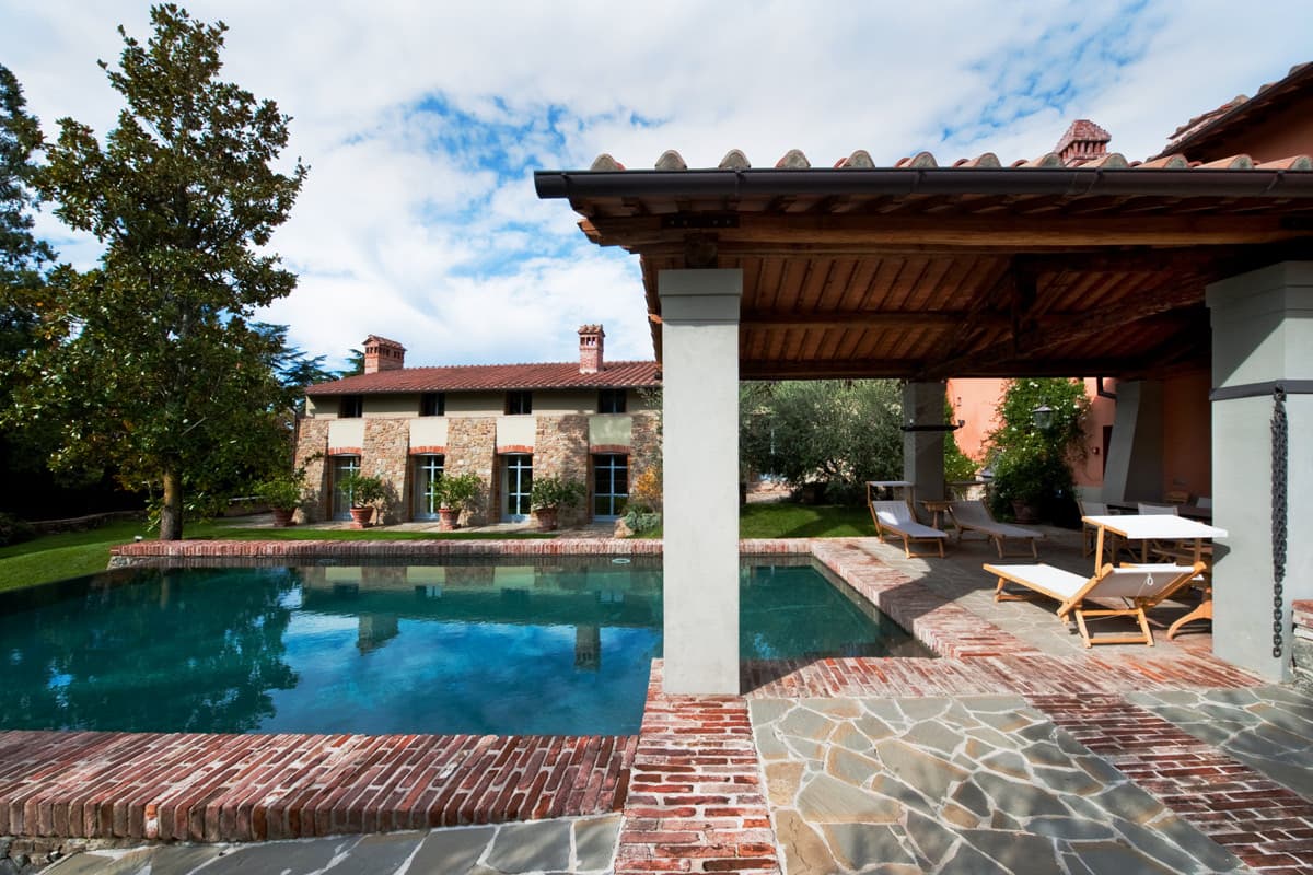 Entrance to the property is via a gate into the large private garden with Pilastri’s private swimming pool with a columned portico at one end, and furnished with sun beds.