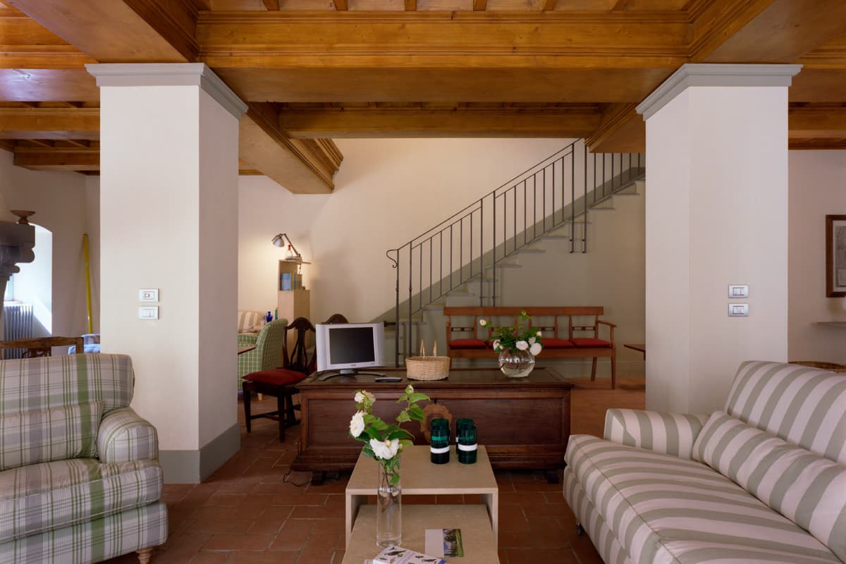 A stairway mid-corridor leads up to a very spacious living room with a sofa, armchairs and satellite TV, as well as double wide French doors opening to a furnished balcony terrace from which to enjoy views of the woodlands that rise towards the Pratomagno mountains. Flagstone paths around the house lead to a table situated for private outdoor dining.