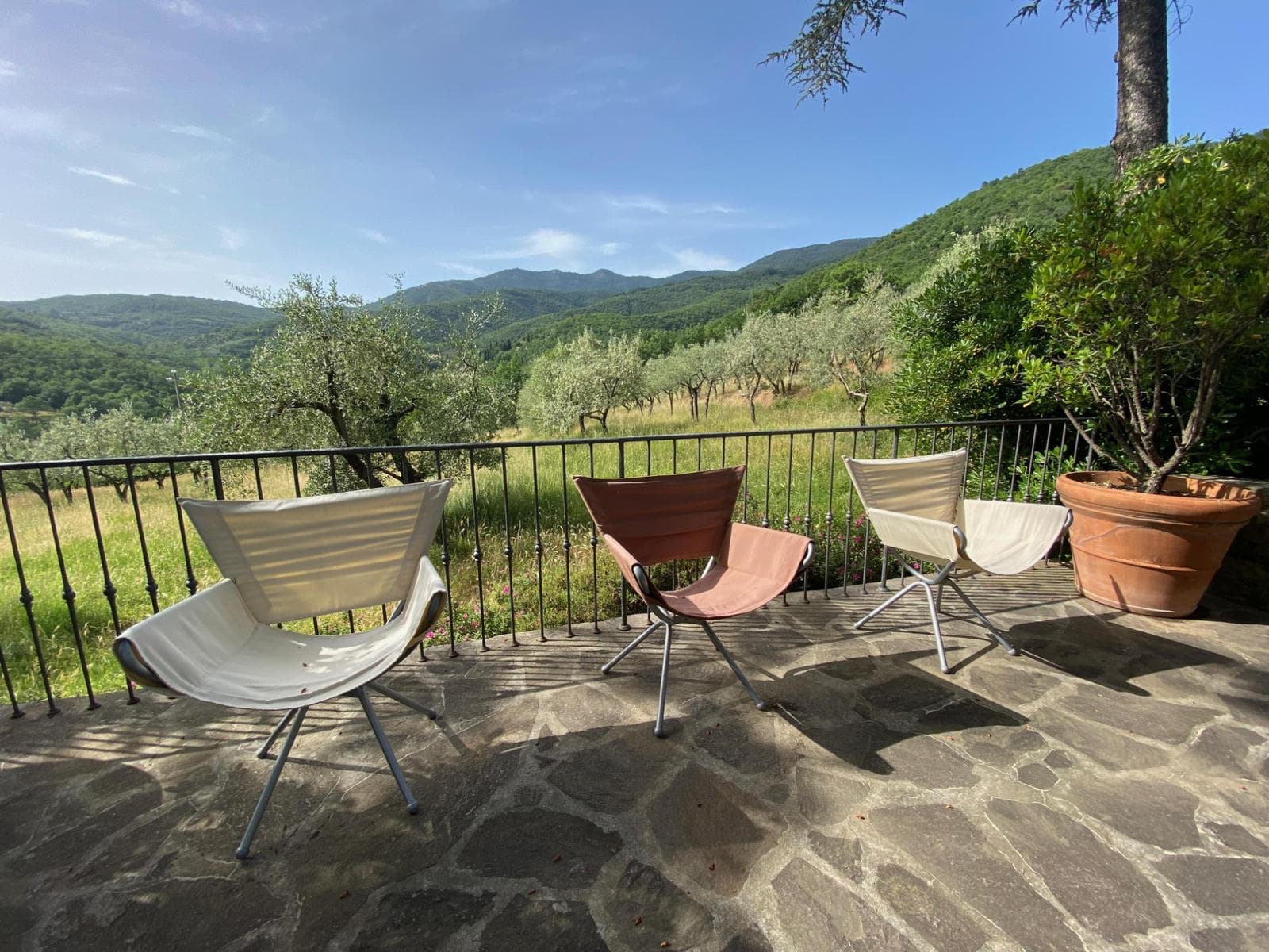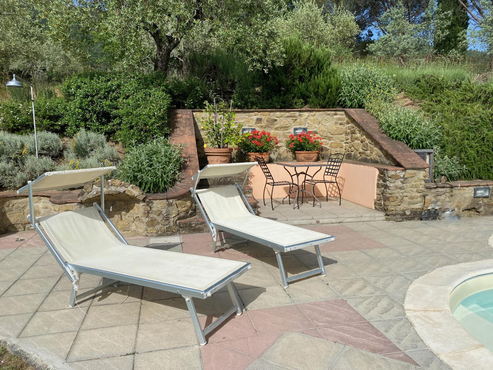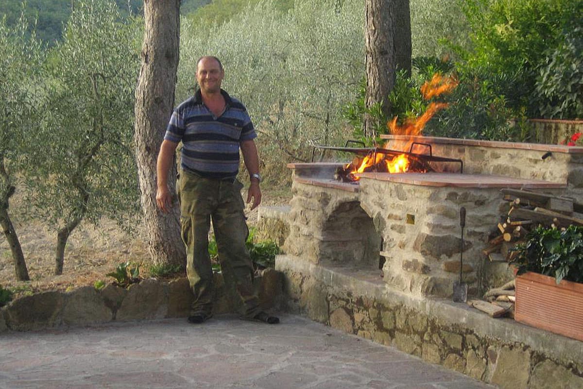 There is a lovely terrace on the front side of the house with a generous BBQ station from which you can look at the ample olive grove and the Pratomagno with its heights and woods and another place where to eat and dine under magnificent old oaks looking to the other side, the hills and fields of the Arno valley. Not to forget the sumptuous pool area with enough space to be able to play crocket or KUP (our passion). All this is beautifully arranged with lots of flowerbeds gradually ascending versus the woods.