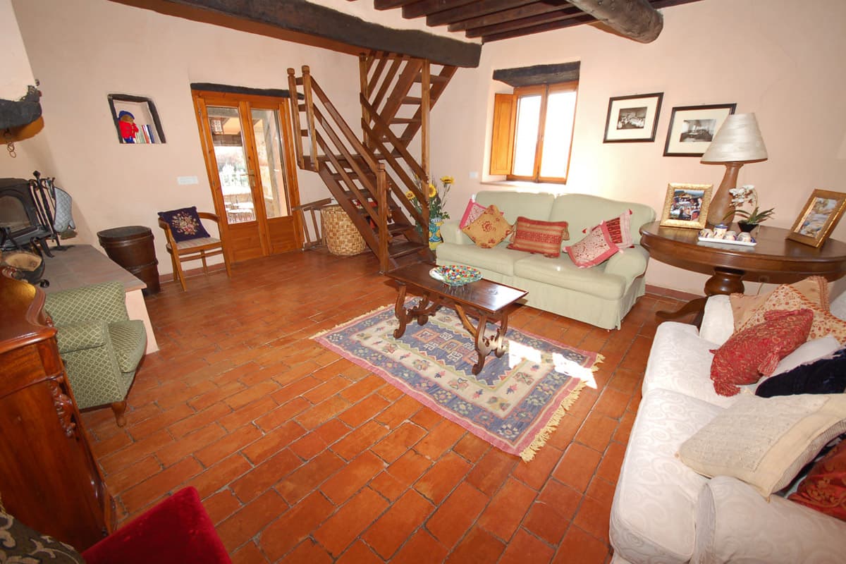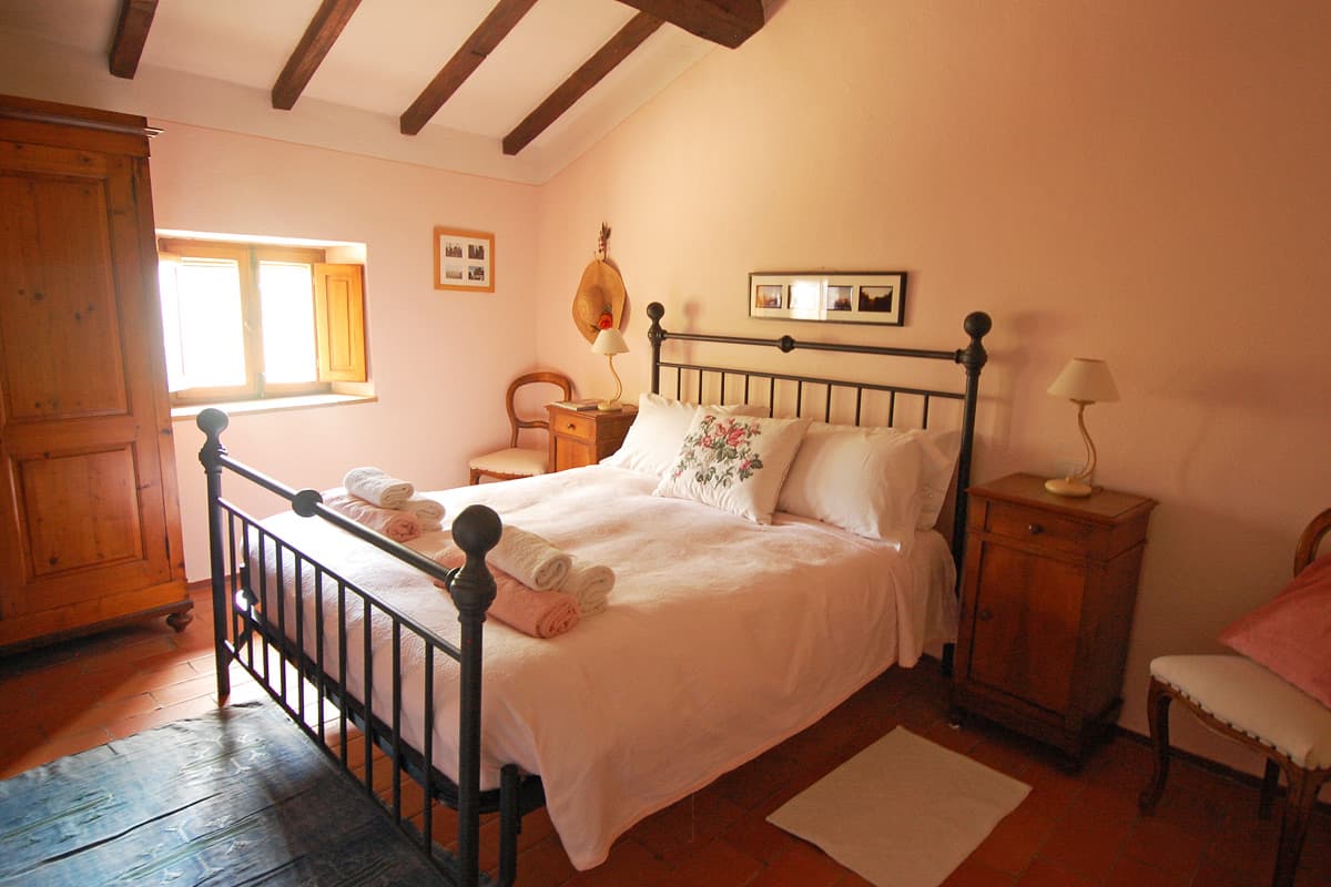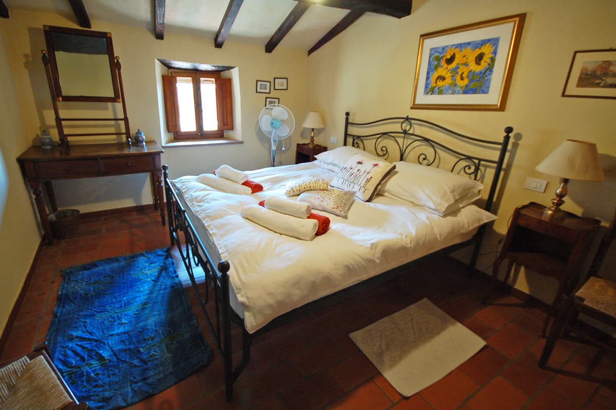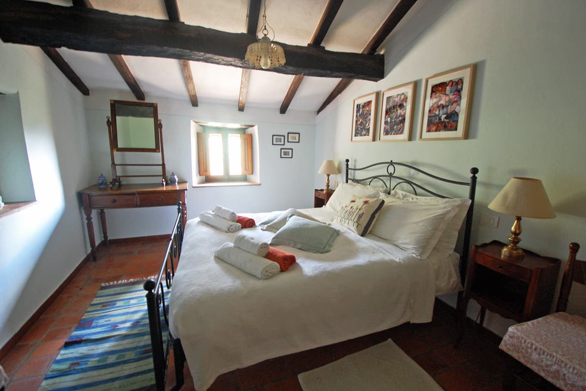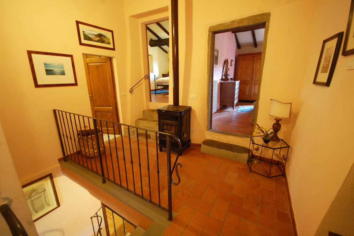The upper floor is reached via an artisan-designed open stairway from the entry hall. The first storey landing, equipped with a free-standing wood stove, has doors to three additional bedrooms, two doubles and one twin or double as requested, and a shower room. All bedrooms in Pietrina are furnished with the wrought iron beds and country antique furniture that blend perfectly with the beamed ceilings and terracotta floors that frame them.