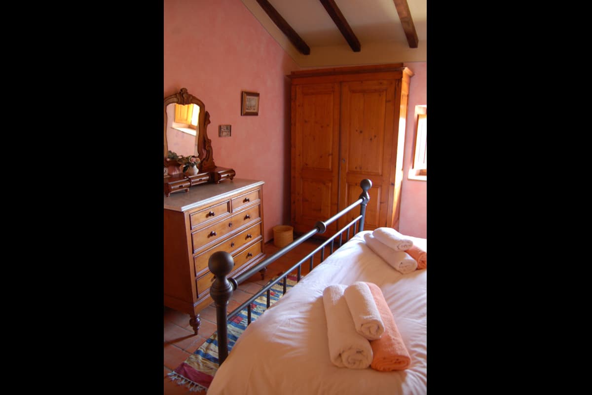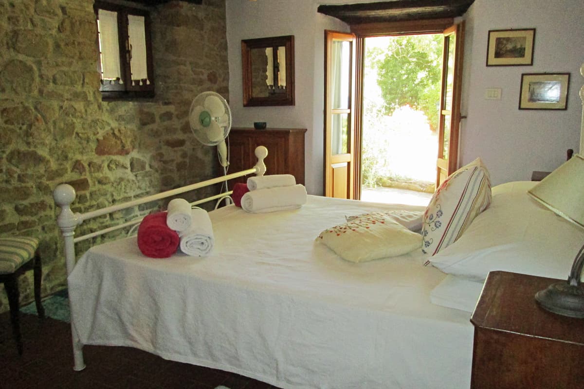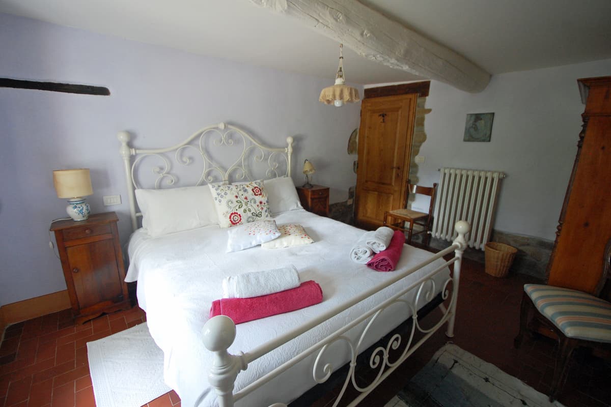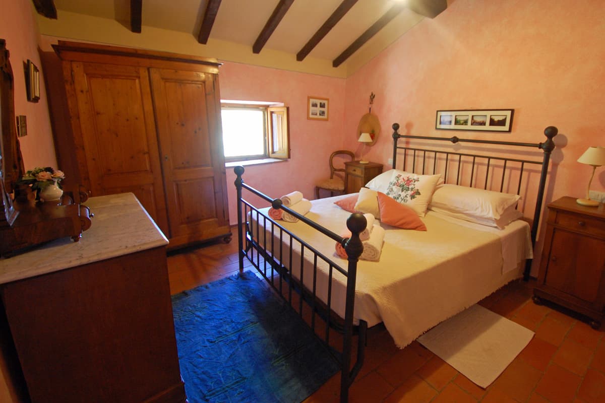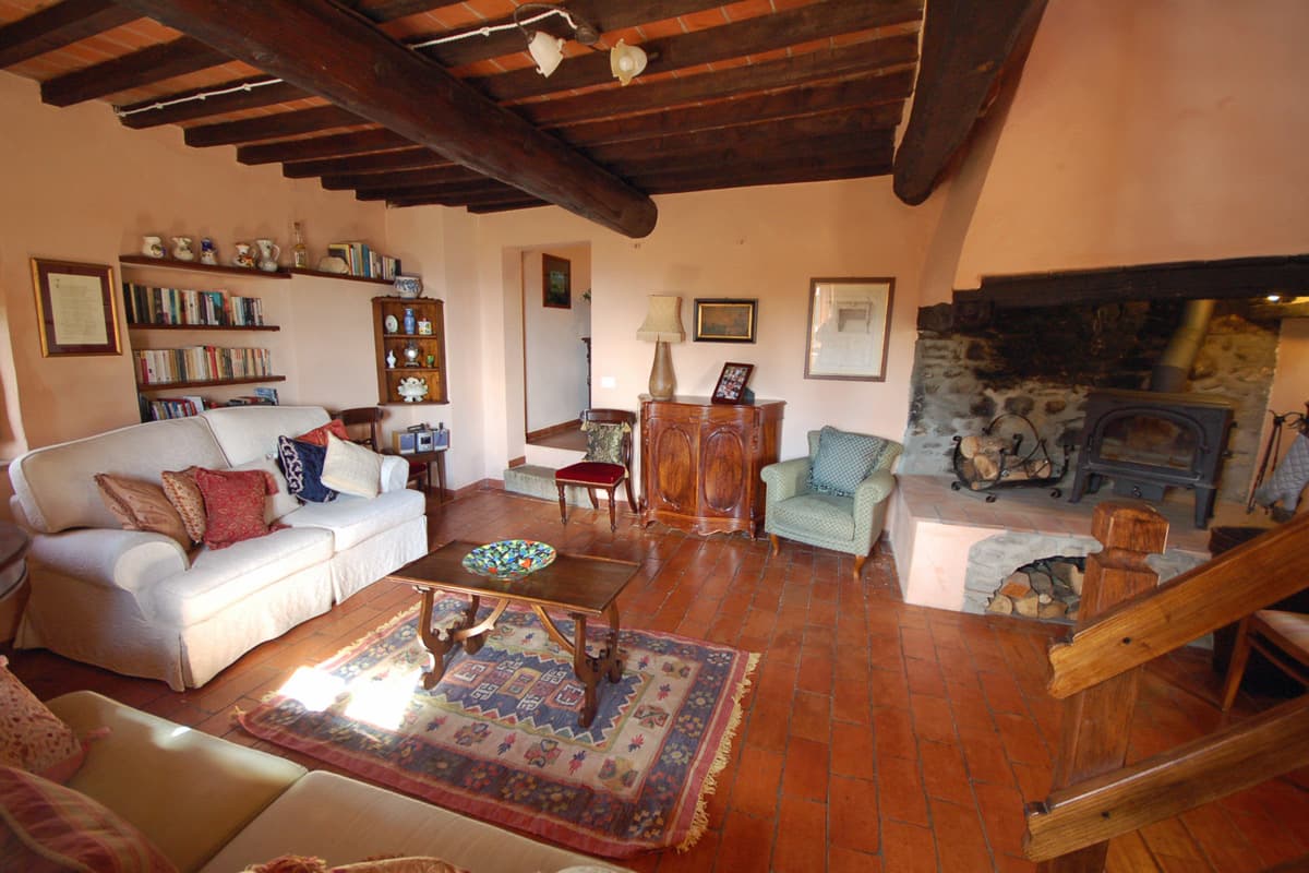 The upper floor is reached via an artisan-designed open stairway from the entry hall. The first storey landing, equipped with a free-standing wood stove, has doors to three additional bedrooms, two doubles and one twin or double as requested, and a shower room. All bedrooms in Pietrina are furnished with the wrought iron beds and country antique furniture that blend perfectly with the beamed ceilings and terracotta floors that frame them.