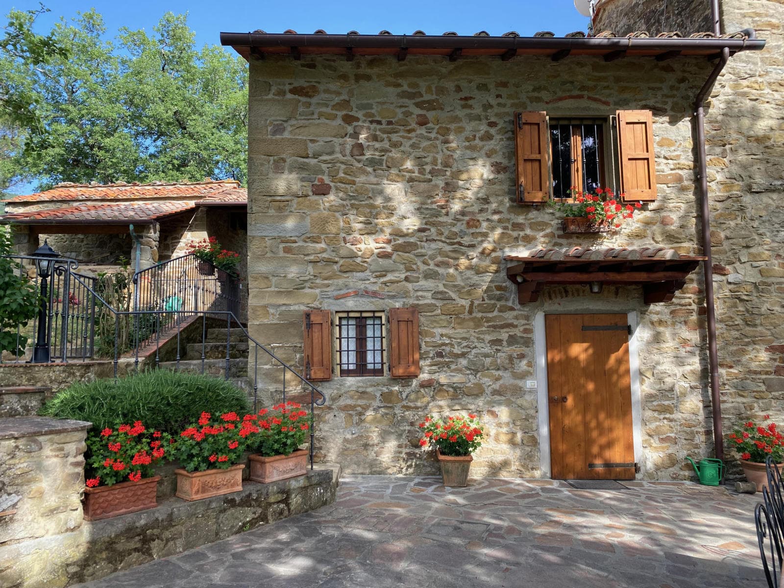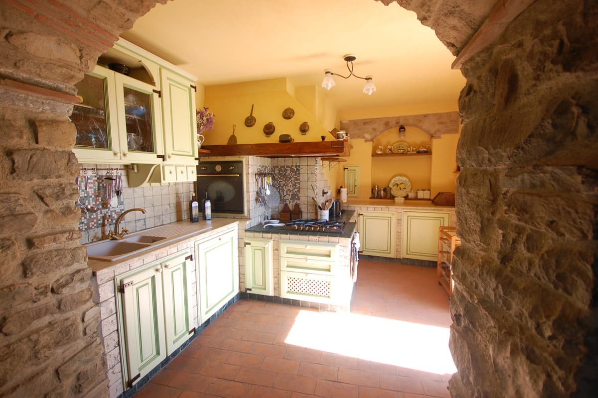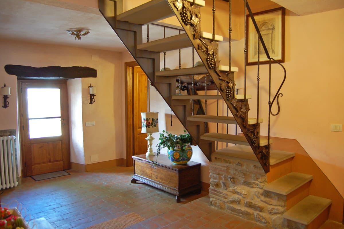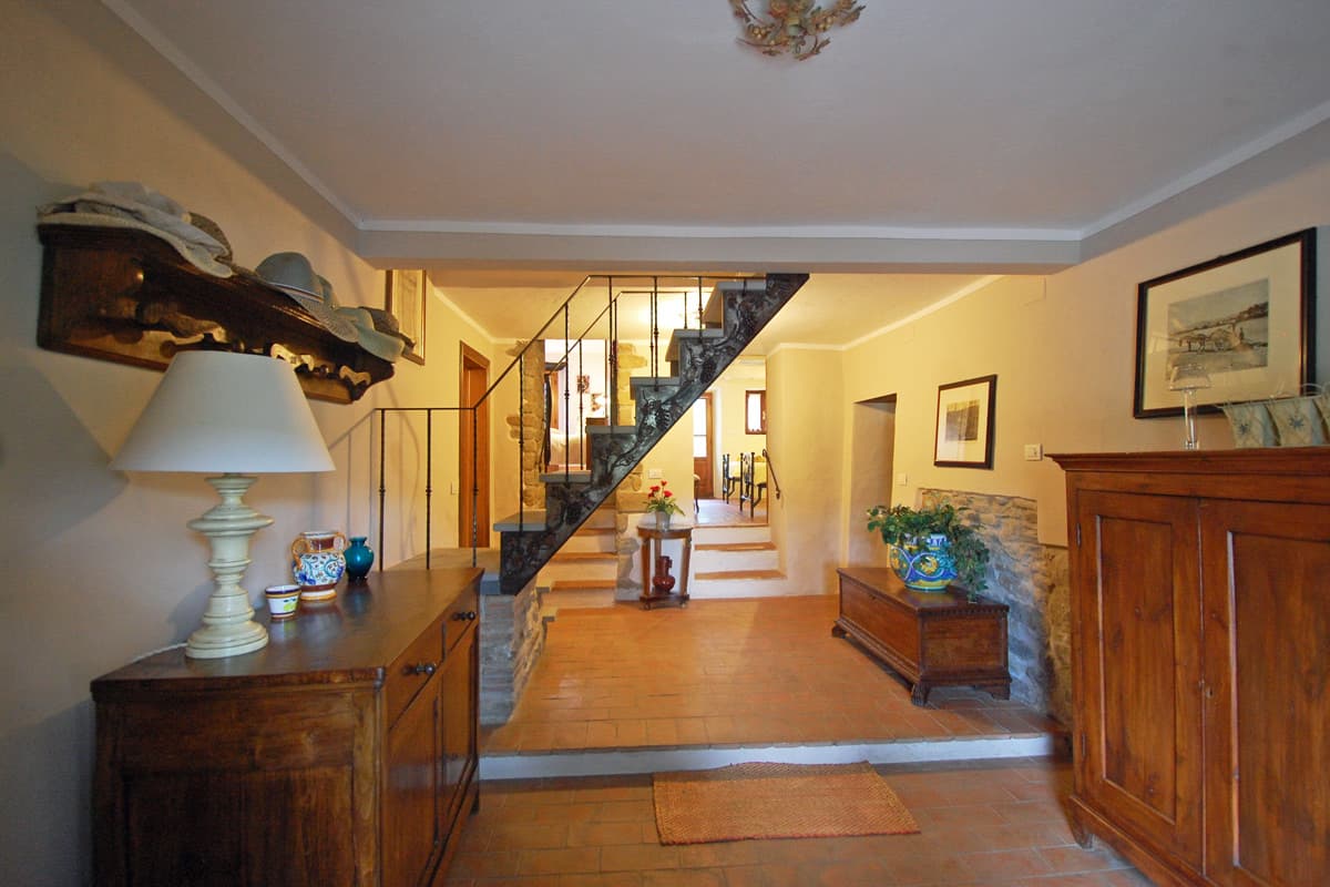 The upper floor is reached via an artisan-designed open stairway from the entry hall. The first storey landing, equipped with a free-standing wood stove, has doors to three additional bedrooms, two doubles and one twin or double as requested, and a shower room. All bedrooms in Pietrina are furnished with the wrought iron beds and country antique furniture that blend perfectly with the beamed ceilings and terracotta floors that frame them.