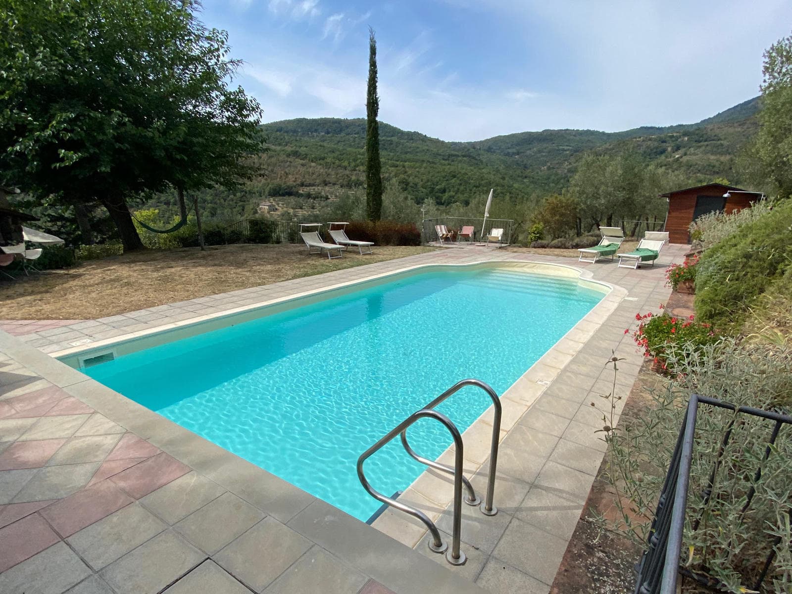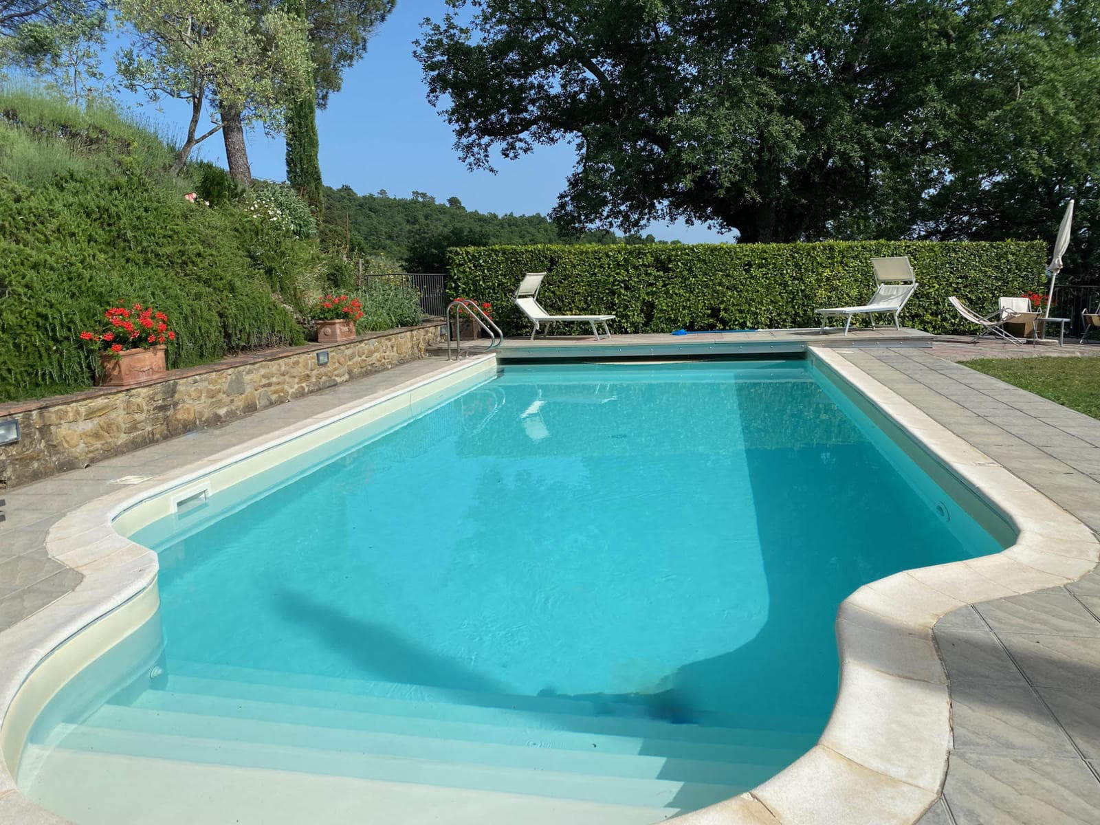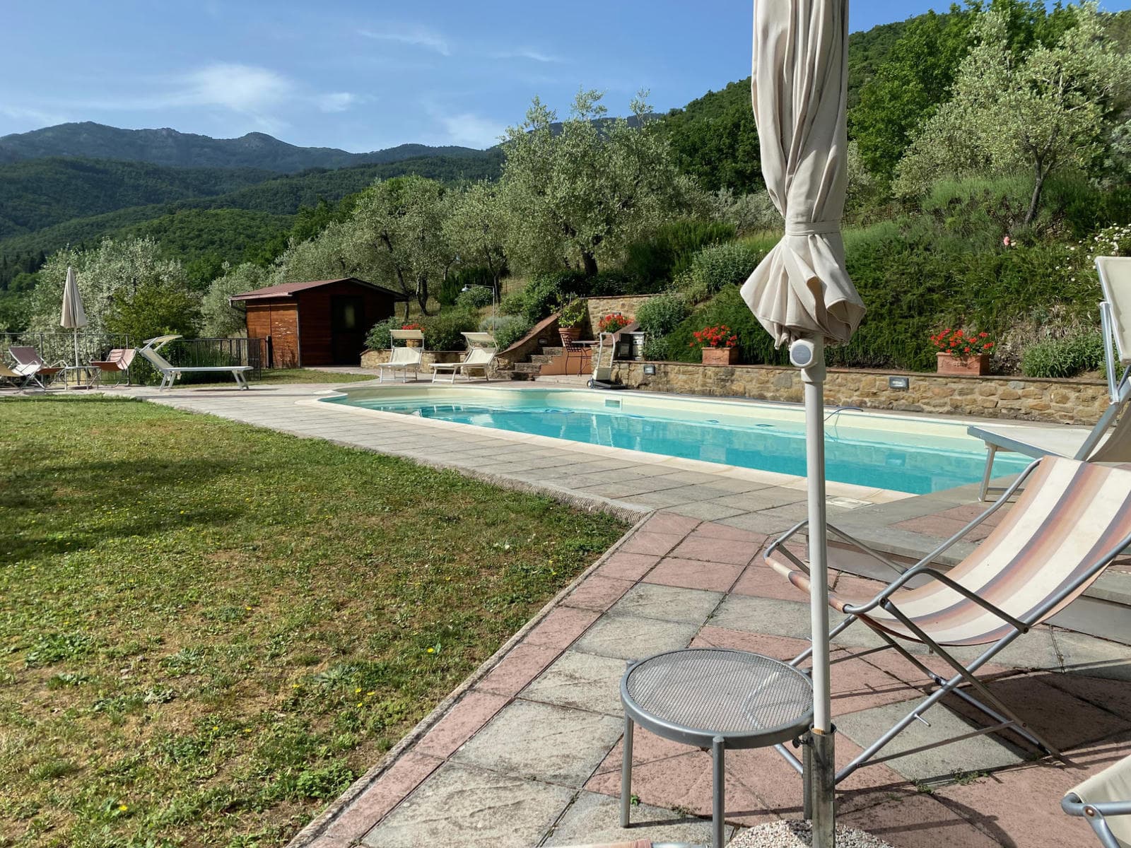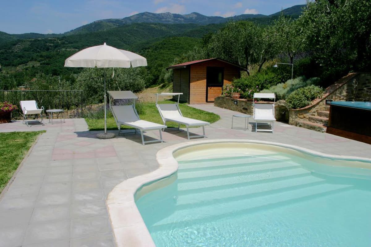 While the house is surrounded by 20 acres of woodland and olive groves, the immediate garden area has been beautifully planted with lavender, roses and flowering shrubs. There are hammocks strung from the trunks of sheltering oak trees and outdoor tables and chairs under the shade of their branches. A charming pool set in the upper lawn has sun beds, lounge chairs and umbrellas set to take in views of the Tuscan countryside and the forested Pratomagno mountains.