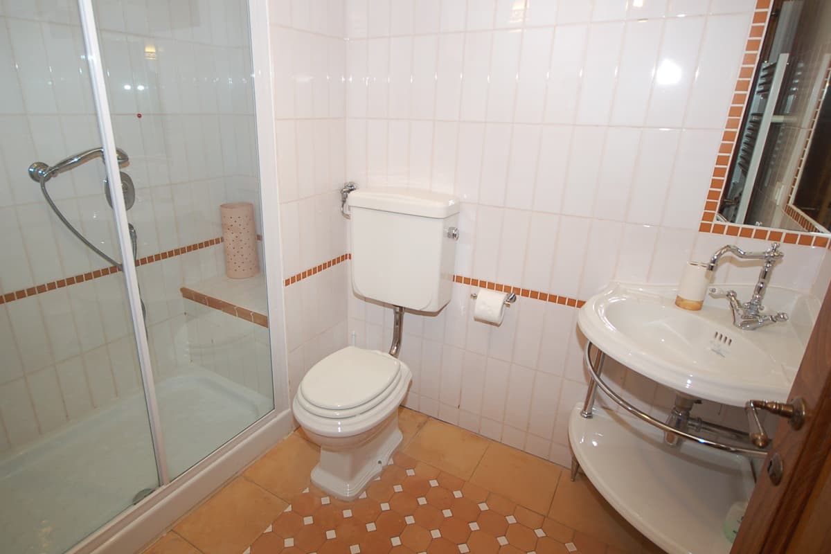 Also on the first floor is a large sitting room with comfortable sofas, which, in addition to the woodstove set in the corner fireplace and a small library, has a wooden staircase that leads up to a television area. Here one of the three sofas in front of the Sat. TV is a sofa-bed, offering additional accommodation to an extra guest.