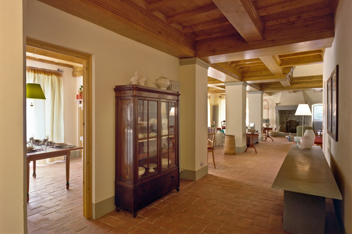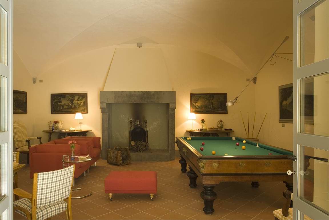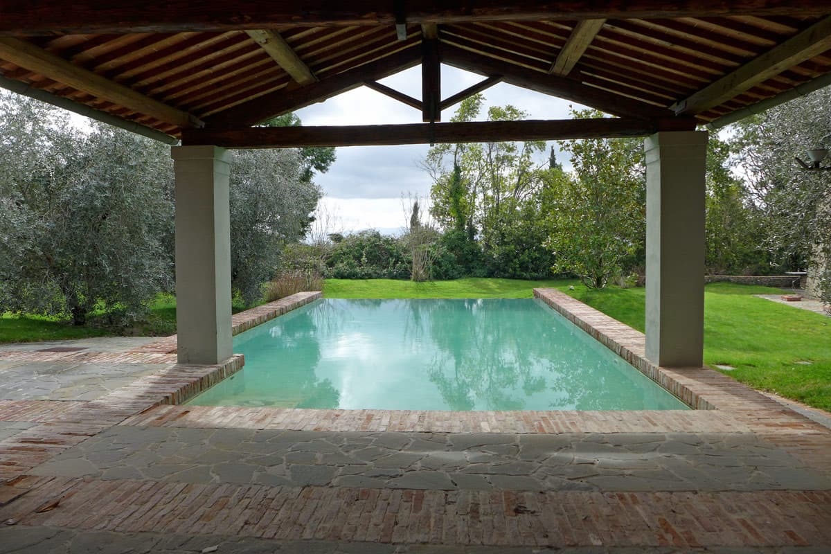 Entrance to the property is via a gate into the large private garden with wide lawns which enjoys a wonderful panorama and curves around two sides of the house. While in one area there is a stone-topped table suitable for meals al fresco, at the heart of the garden is Pilastri’s private swimming pool with a columned portico at one end furnished with sun beds that can be moved to take in more or less of the sun’s rays.