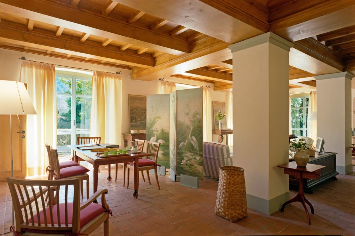 Looking onto the pool area are five sets of French doors that provide entrance and light into the whole of the ground floor. There is access to an eat-in kitchen with a table for 8 and a large room with a beautifully coffered ceiling whose living and dining areas are separated by a painted screen. The dining area has a table for 8, while the living area has sofas, armchairs and a round table for cards or board games all set near easy access to the garden.