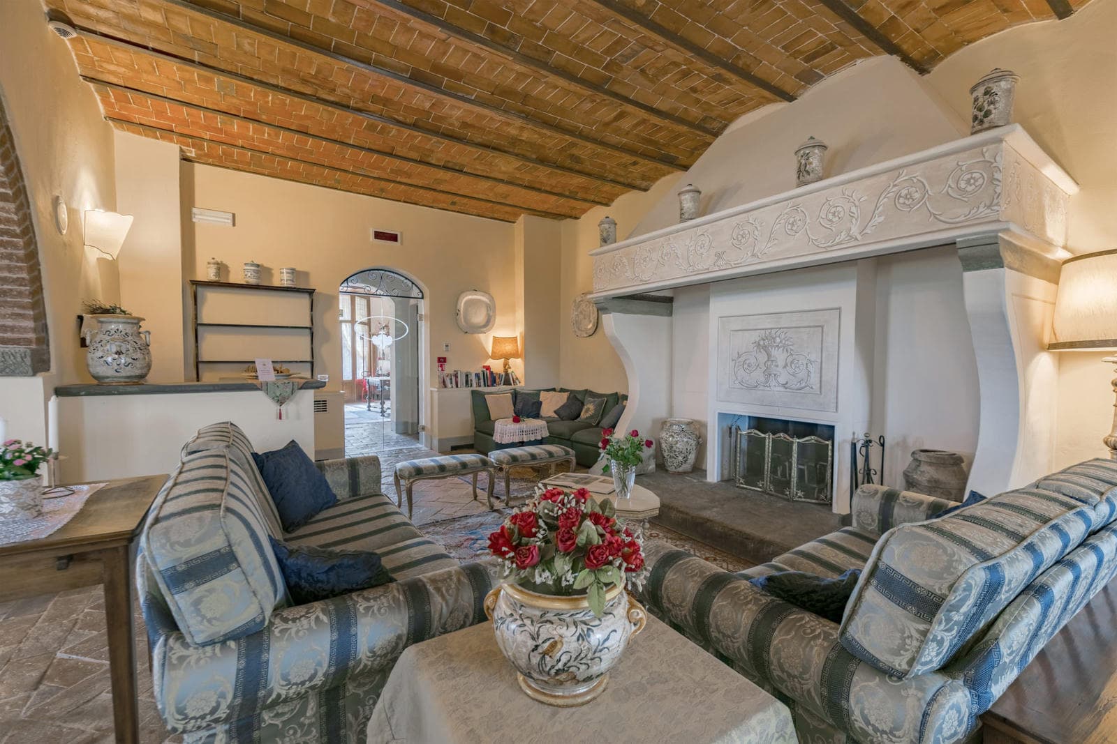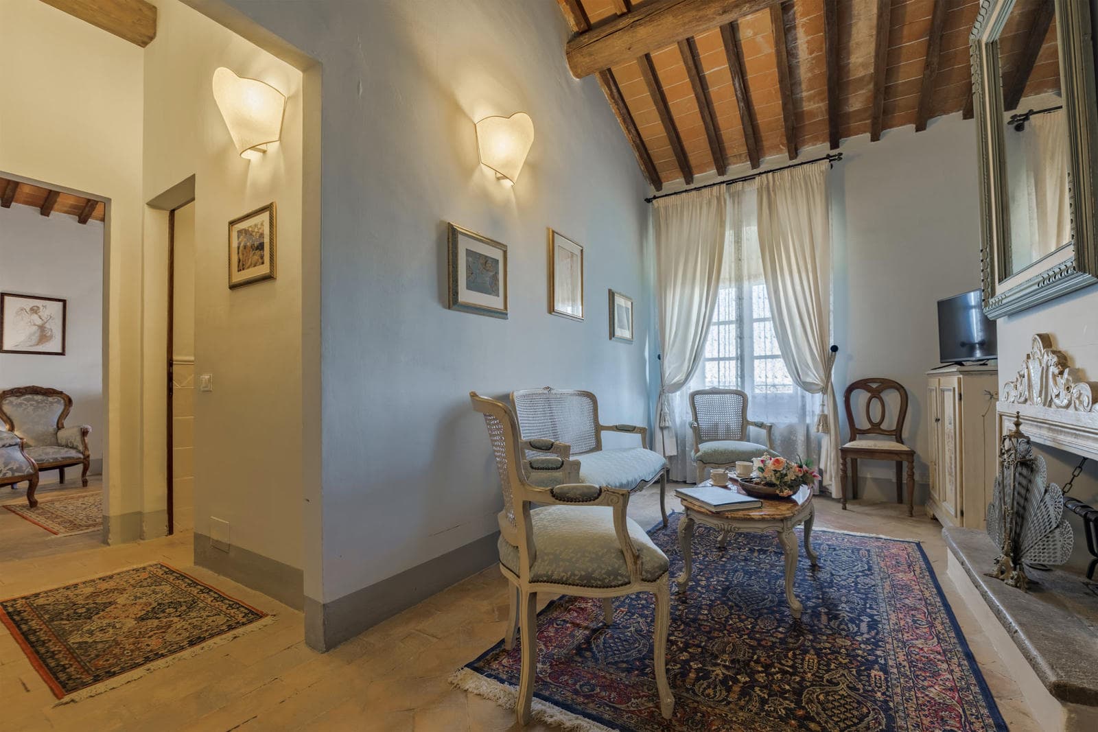 Access to this area can be obtained either via an internal staircase or by using the elevator. On this floor, there are two suites, each consisting of a double bedroom, a cozy sitting room with a fireplace, and an attached ensuite bathroom featuring a relaxing hydromassage bath. Additionally, there is one double bedroom with its sitting room, fireplace, and ensuite bathroom equipped with a shower. Furthermore, there are four double bedrooms, each with its ensuite bathroom featuring a shower.