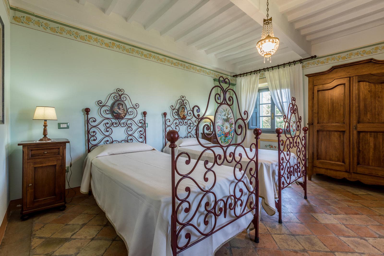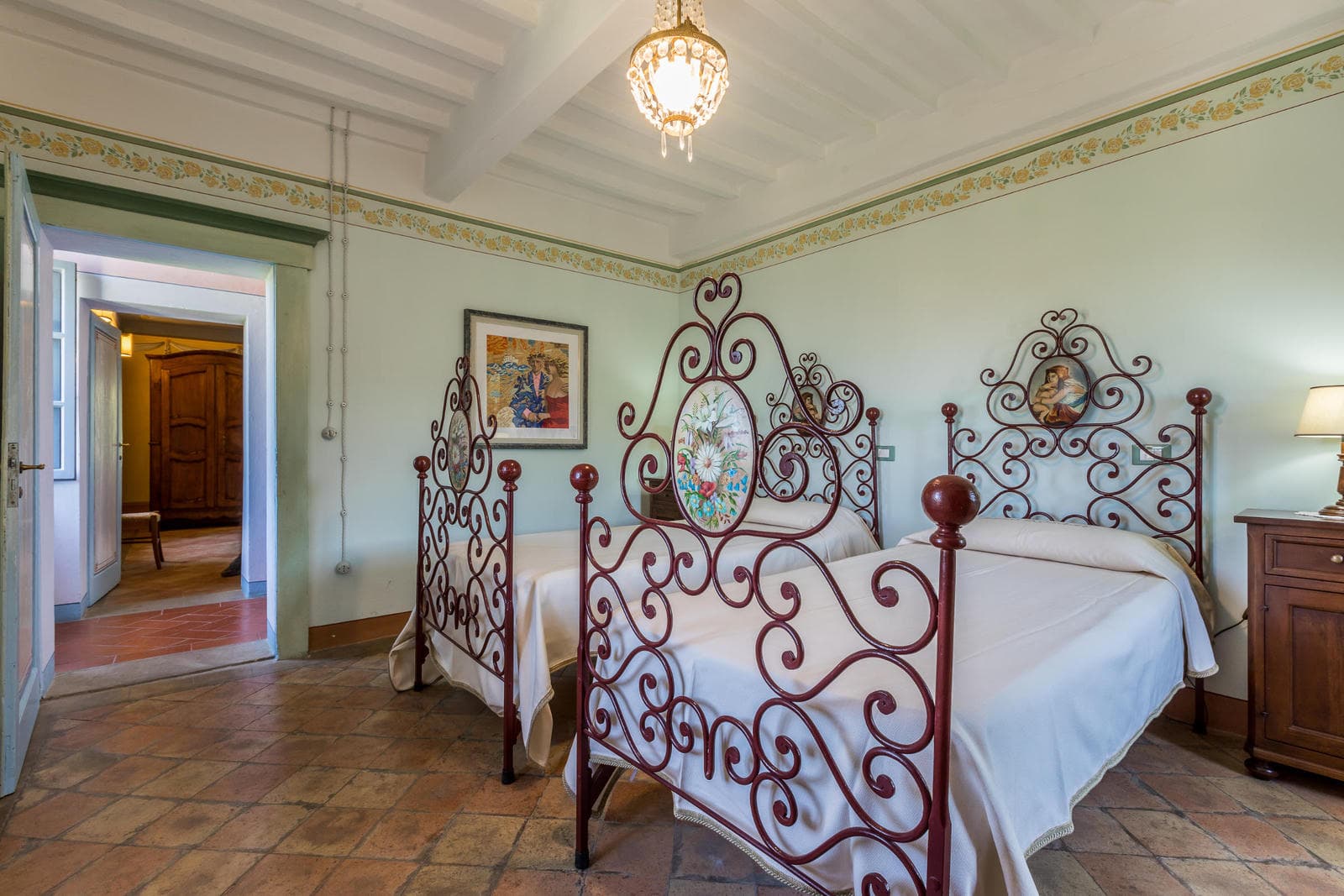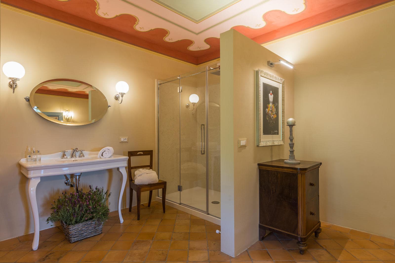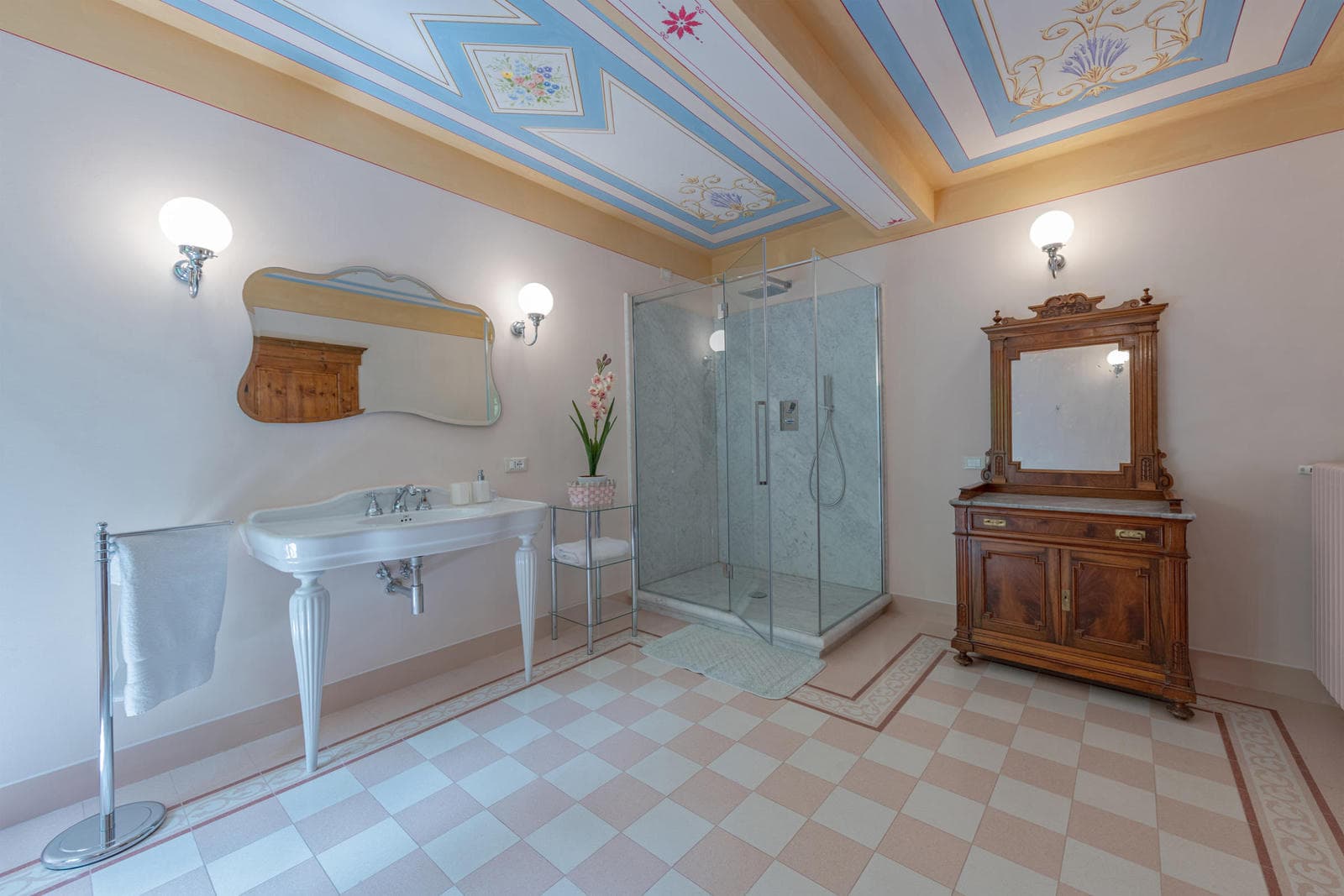 Villa di Monterchi is 500 sq mt. In some areas the tradition of visible beams have been mantained, while in others the frescoes have been restored. Most bedrooms are frescoed, and three bathrooms feature marble showers and thermostatic mixers, where you can find a mix between traditional and modern.