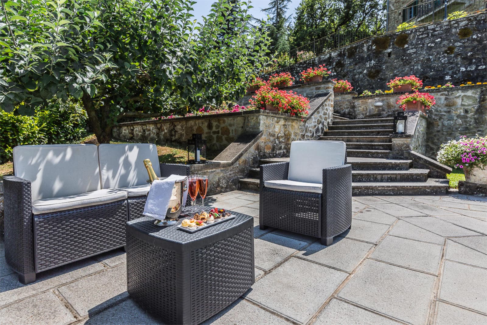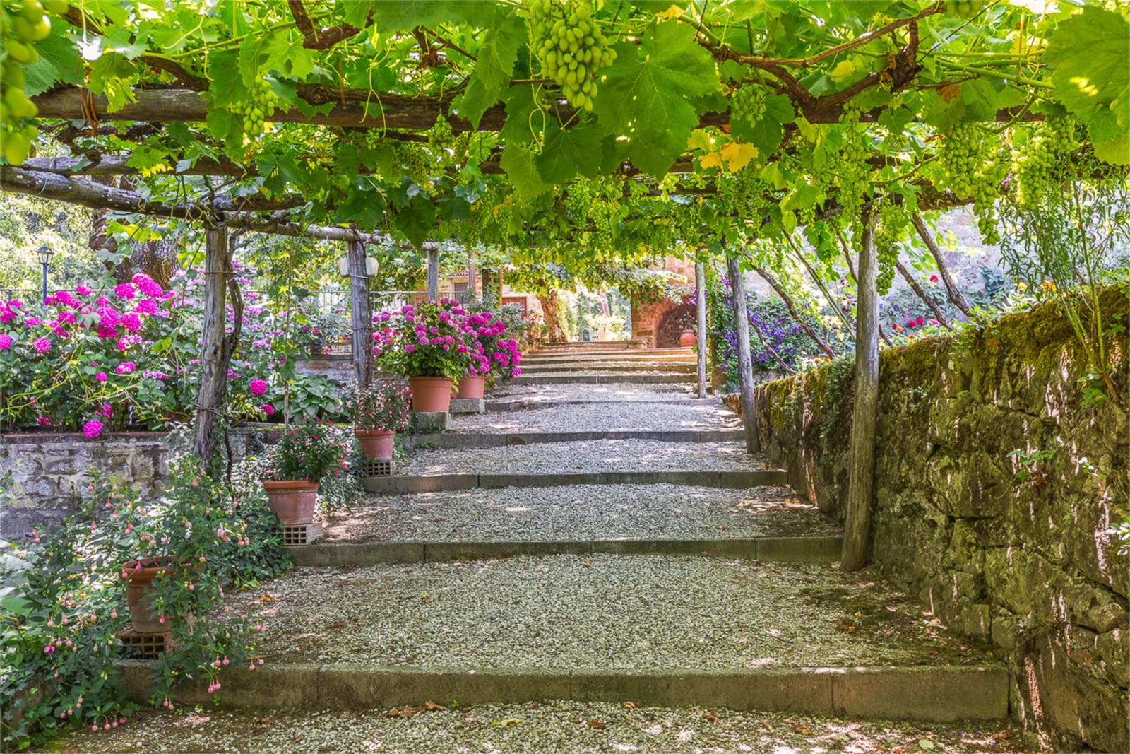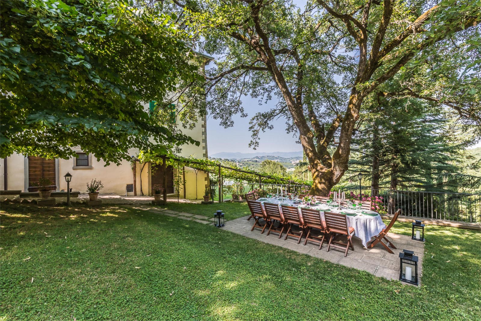 A one hectare rose garden surrounds the villa. On one side there is a pergola with fragrant moscatello and canaiolo grapes used in the production of holy wine. The gardens and the swimming pool have a magnificient panoramic view and are lit up at night, ideal for spending summer evenings, perhaps tasting a good glass of local wine.