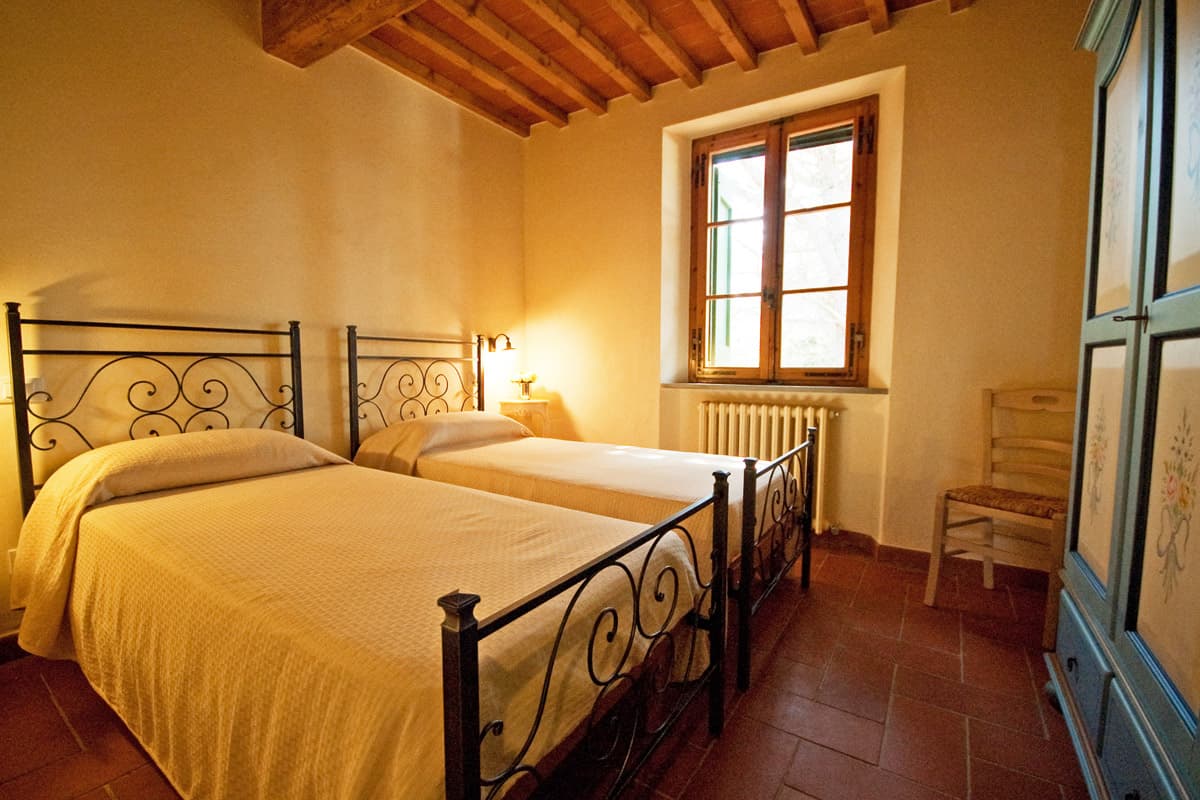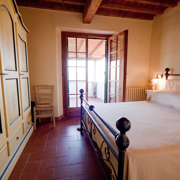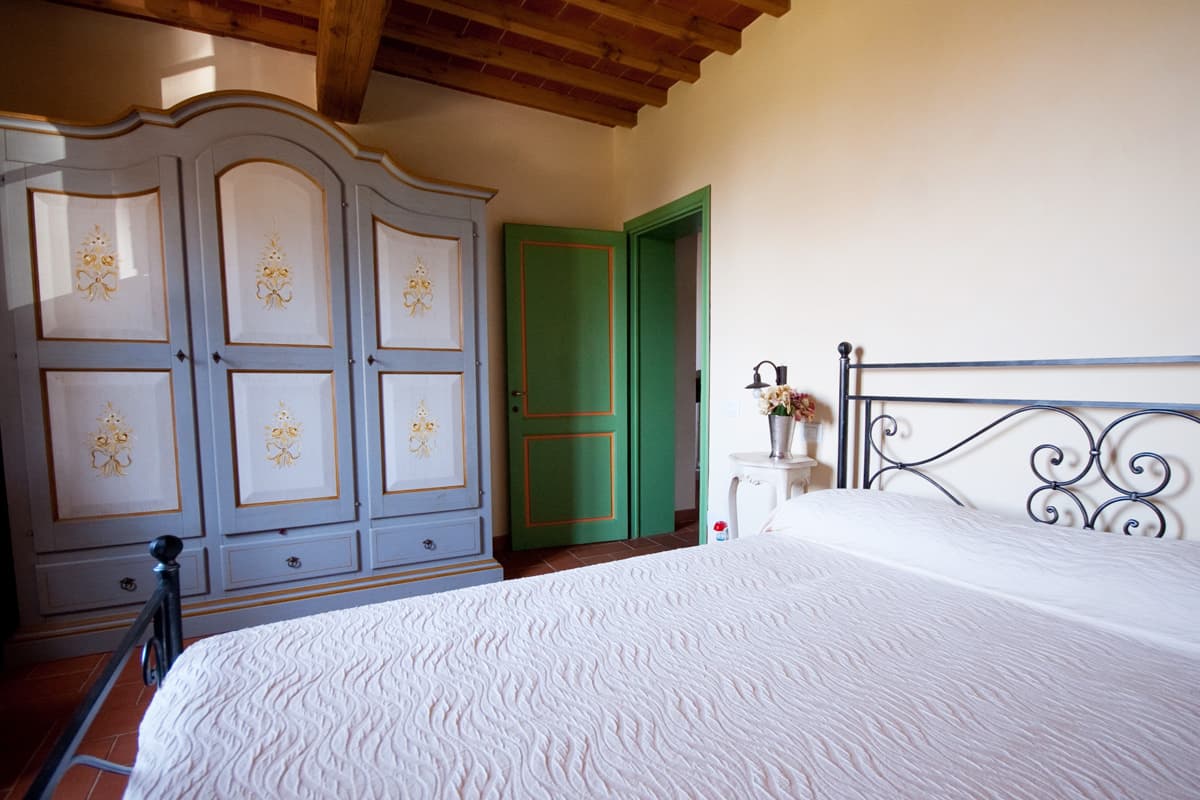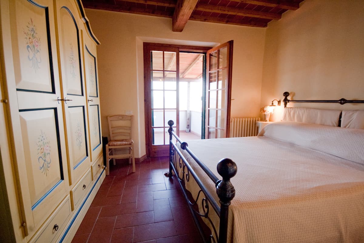 The top floor has two shower rooms with carved stone sinks and stylish fixtures, each serving two bedrooms. To the right of one shower room is a twin/ double bedroom and a double bedroom, while to the left of the other shower room are two double bedrooms, one with a door to a large furnished balcony that enjoys the view of the Casentino hills. All bedrooms have wrought-iron bedsteads and charming hand-painted wardrobes and look out at the spacious grounds, whose lawns and shady areas with high trees are ideal for children at play.