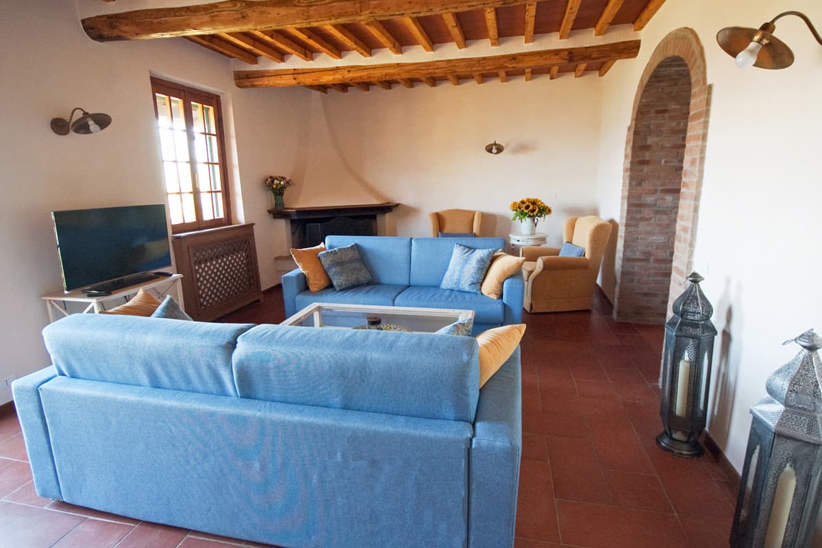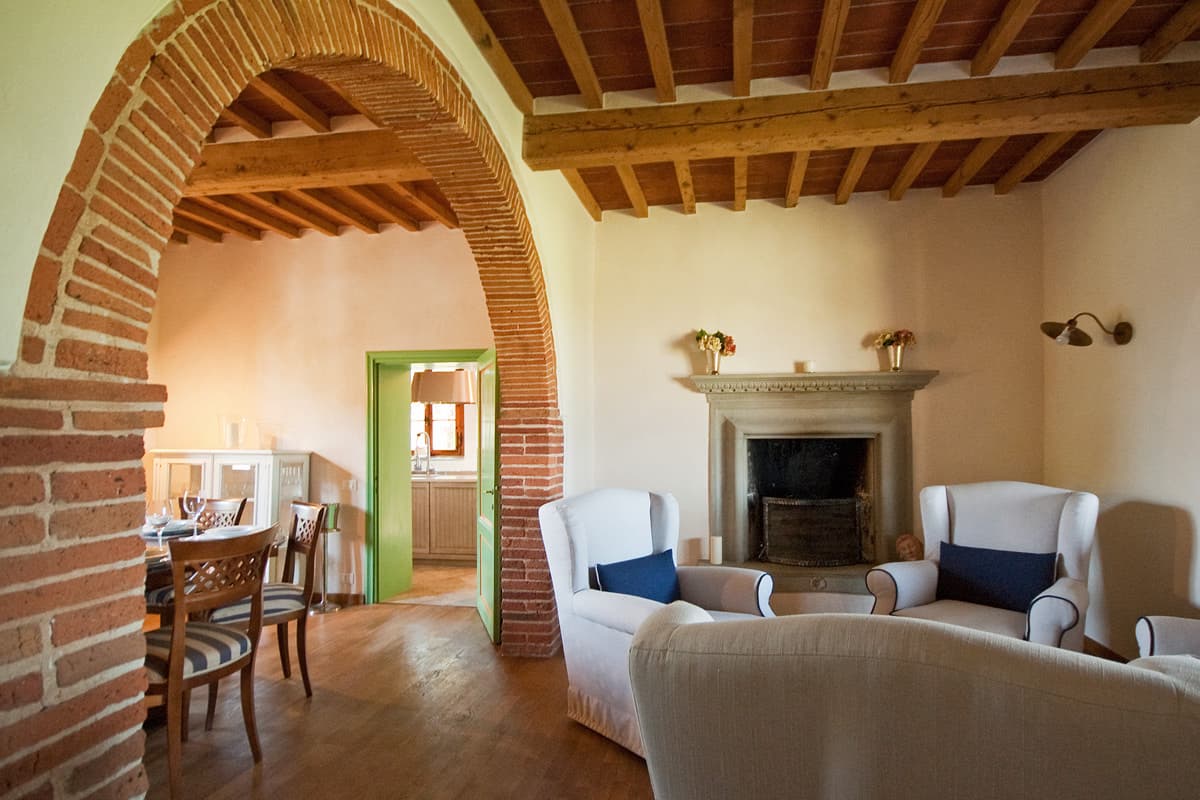 A shrubbery-lined drive leads links the property gate to the two-story stone house whose sheltering portico, furnished with arm chairs and divans, runs the width of the facade. Entry is into a bright hallway with a pietra serena stairway leading up to the first floor and doorways to living quarters on either side. To the left is a large sitting room with sofas and armchairs, a corner fireplace, a door to a small furnished patio, and a large archway with sliding doors leading into a double bedroom and shower room suite. The stylish shower room with large rainfall shower and twin carved stone sinks also has a doorway to the back garden, with easy access to the pool and large travertine table for 12. To the right of the entrance hall is a small sitting room with four large armchairs in front of a pietra serena fireplace, next to a dining room with large wooden table that can seat all guests. The adjacent kitchen, outfitted with pale clean cabinetry and stone countertops, cleverly hides all the appliances and equipment a good cook will need and has two large refrigerator/freezers and a traditional kitchen fireplace.