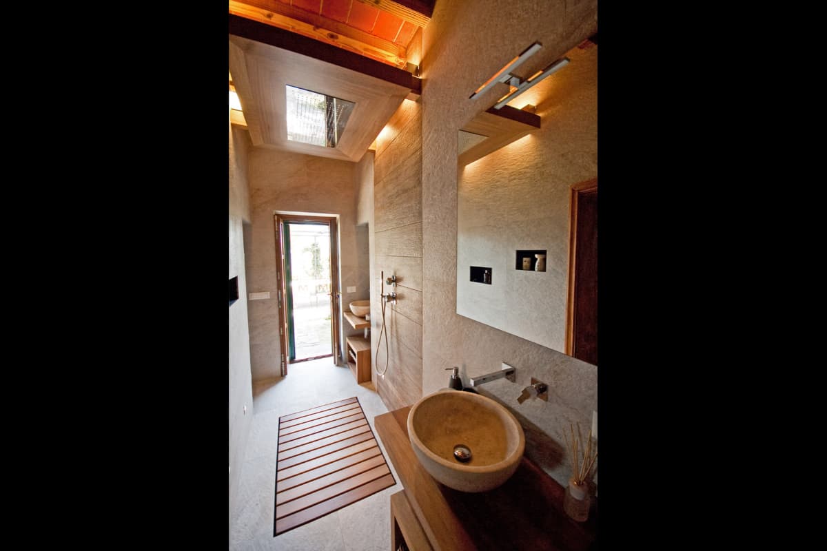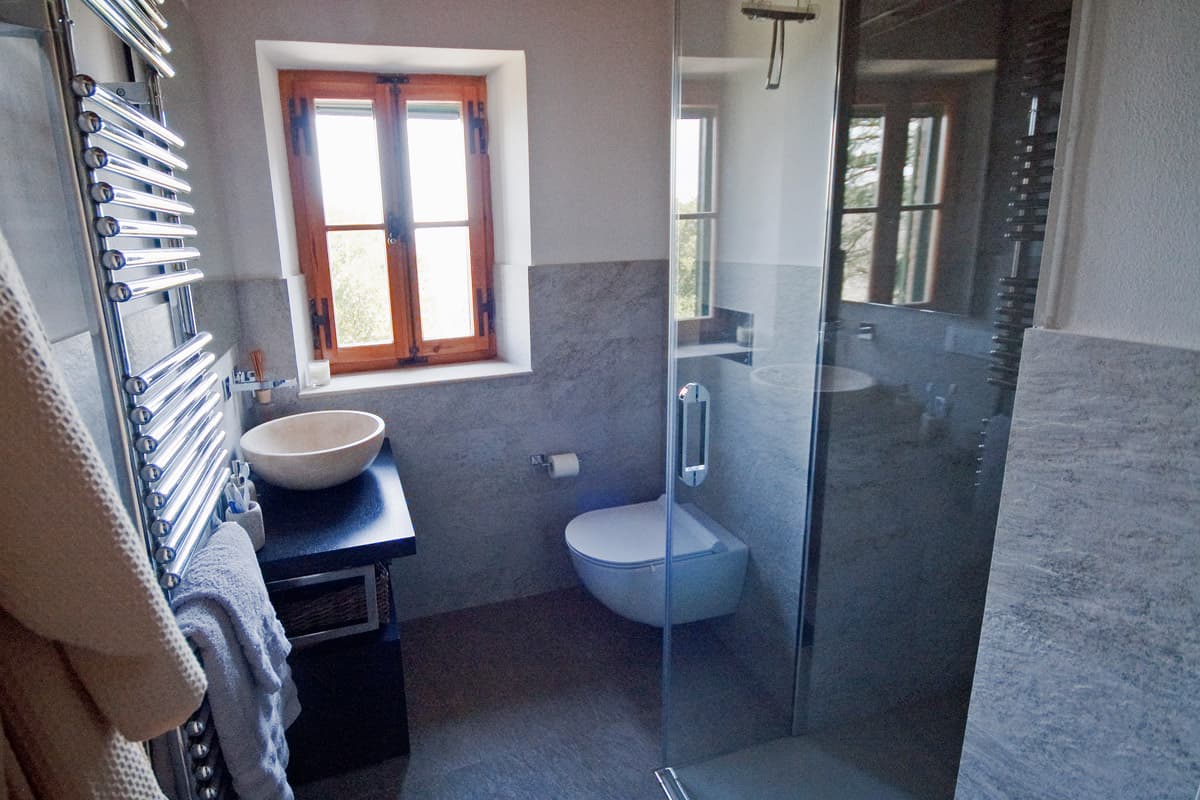 Both upper floor shower rooms are fitted with sculpted sinks, stylish stone wall treatment and roomy showers.