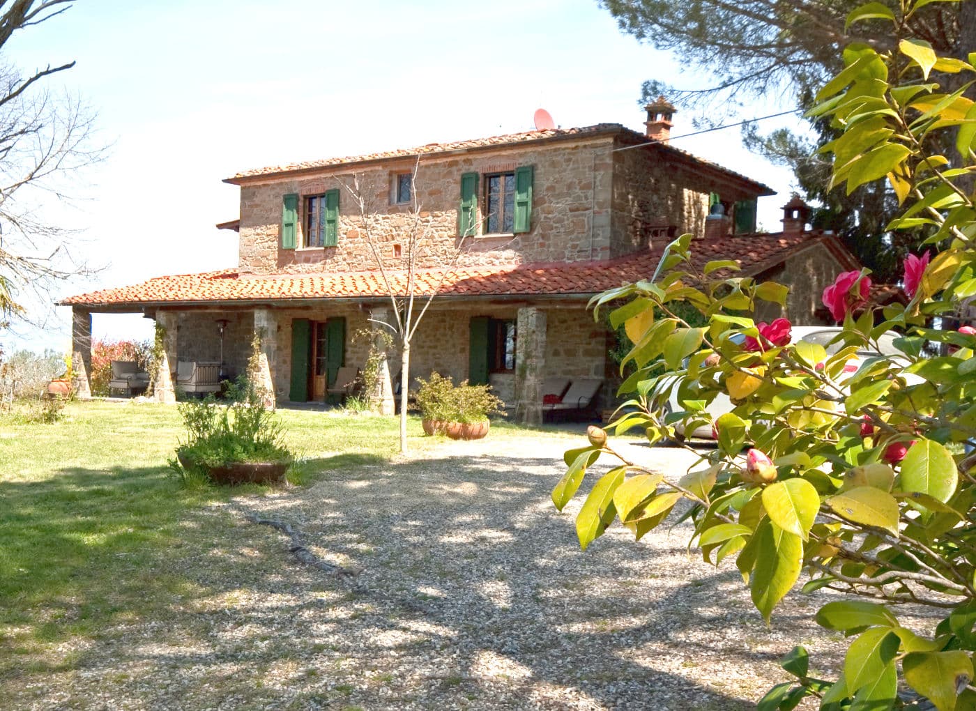 This very special house was originally built around 1820 to celebrate the safe return of a soldier from Russia, whose family had feared him lost in the Napoleonic wars. The stone-built villa, on a hilltop 450 m above sea level, has wonderful views across the surrounding hills of the Casentino and is surrounded by its own parkland with carefully tended rare roses, shrubs and trees, as well as irrigated lawns and fruit trees.