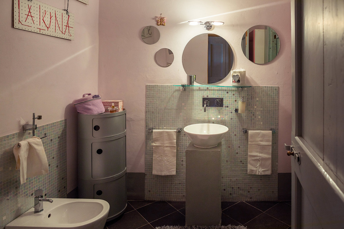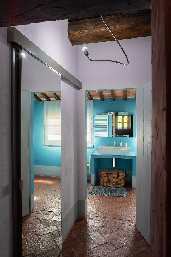 Villa Luminosa offers six bedrooms arranged across two independent apartments, each with its own entrance and an interconnecting door. The ground-floor apartment is full of Tuscan warmth and vivid colour, while the first floor is serene and elegant, with pastel tones, antique furniture, and a sunny balcony that catches the morning light. A pool sits on a terrace next to the villa.