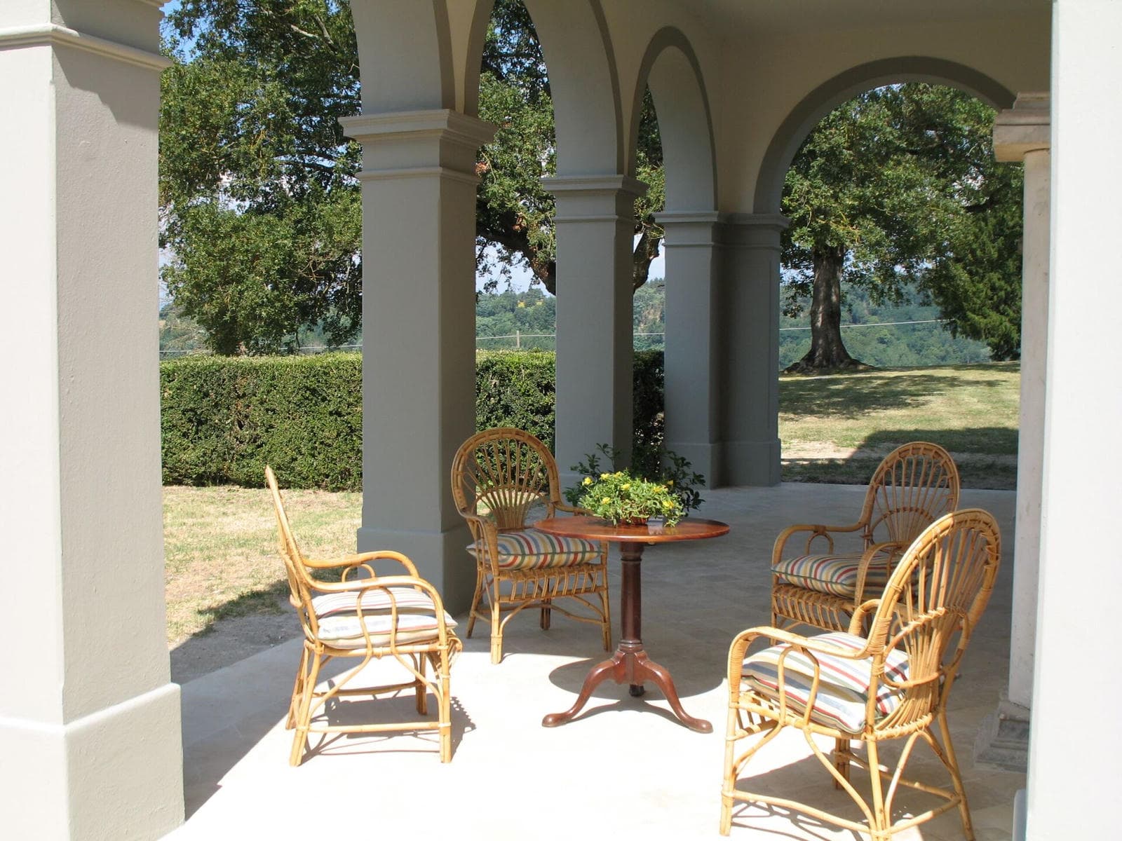 Enclosed within a park, and complete with a chapel and a majestic grove of century-old trees, the outdoor area consists of a swimming pool and a portico furnished with a table and chairs for al fresco dining.