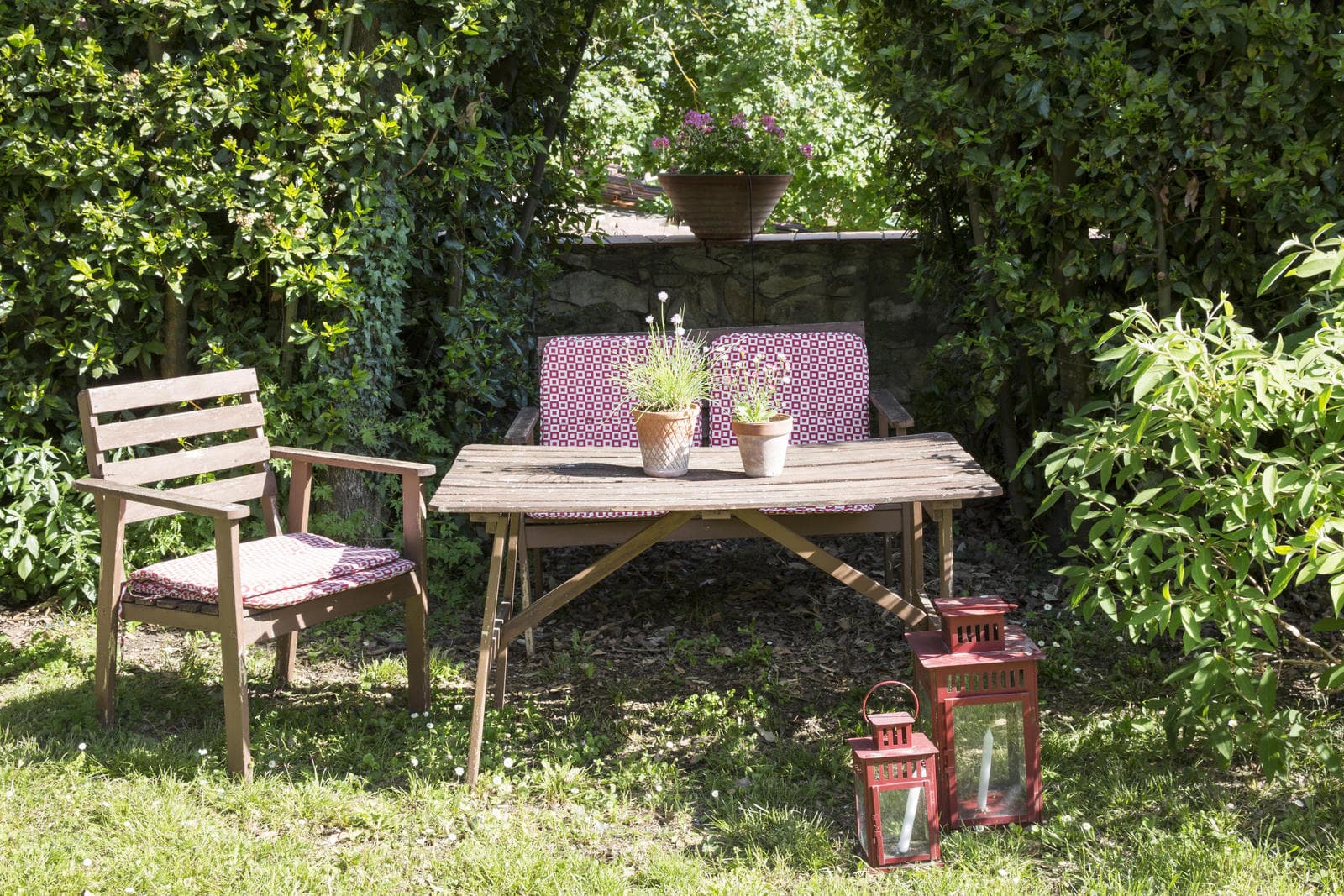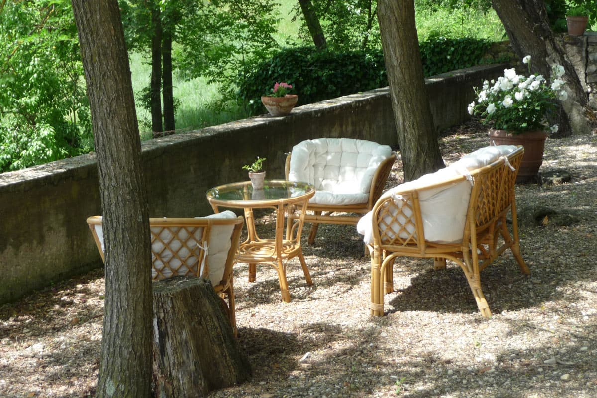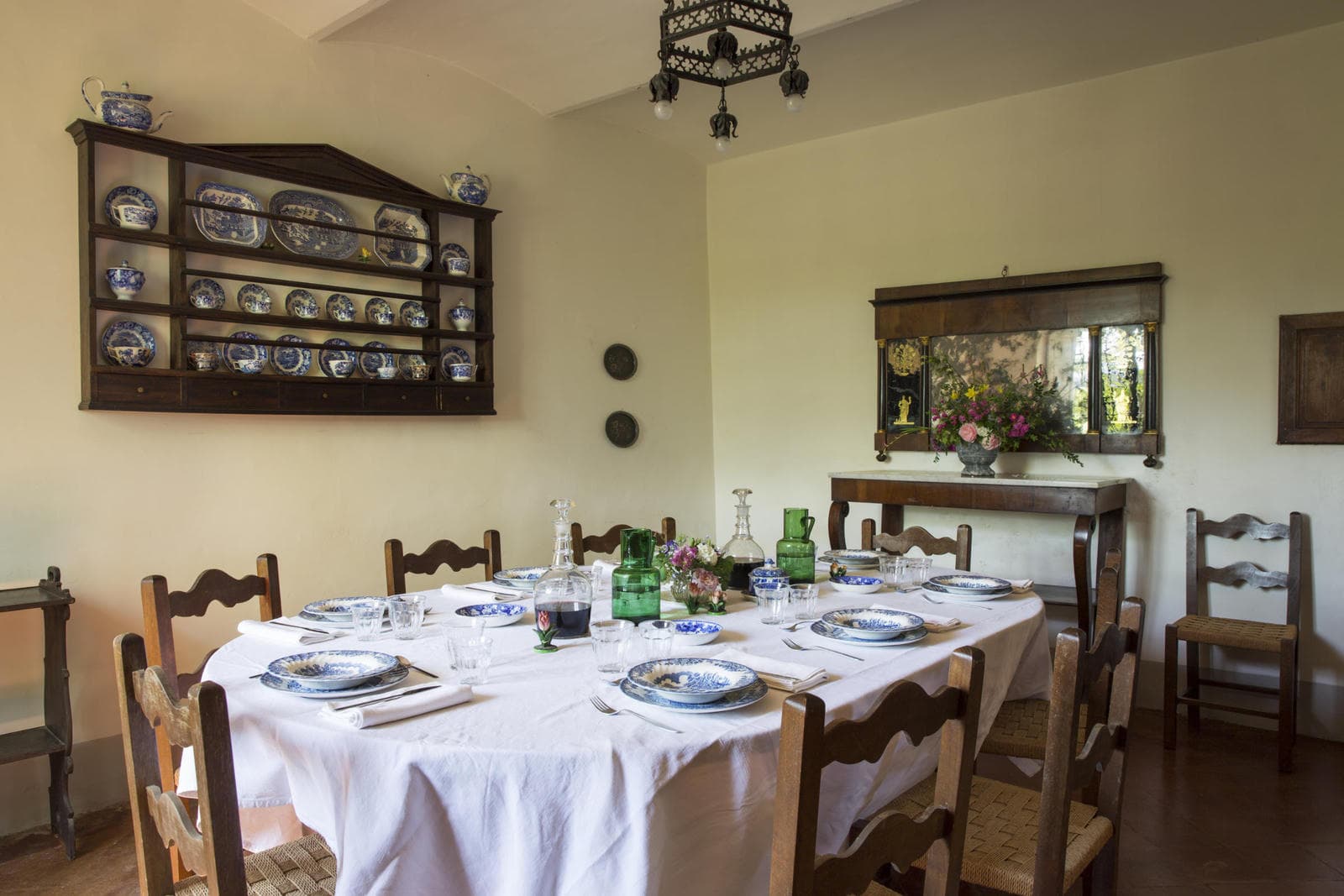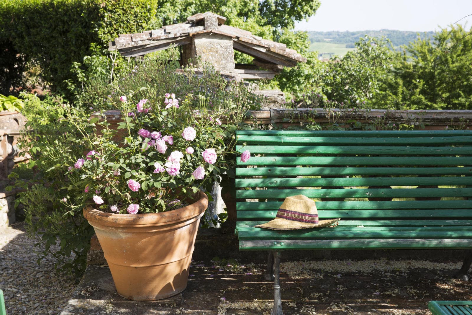 As the villa was built to enjoy the pleasures of summer, the outdoors has received its due and there are a number of spots to savour the view and the warmth of the day. Tables are set in the natural shade of trees for meals al fresco, while benches, bistro tables and cushioned chairs invite one to share a cup or a glass and a moment's delight. The fenced swimming pool, approached through flower-draped arbor, sits on a slightly lower level and has room on a side patio and the nearby lawn for sun beds.