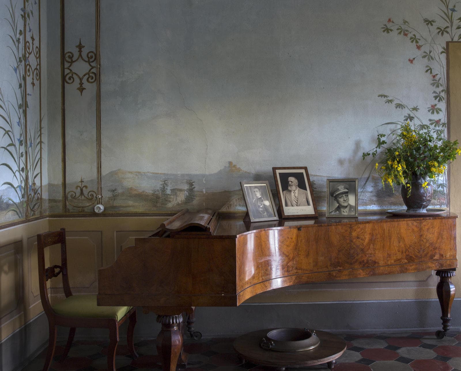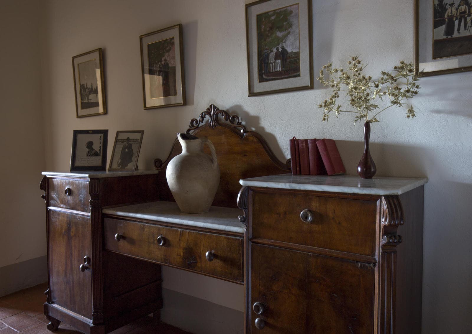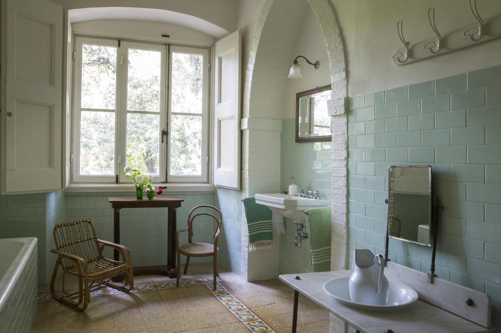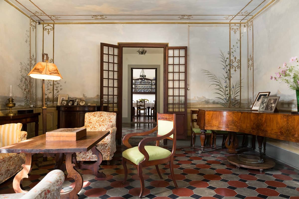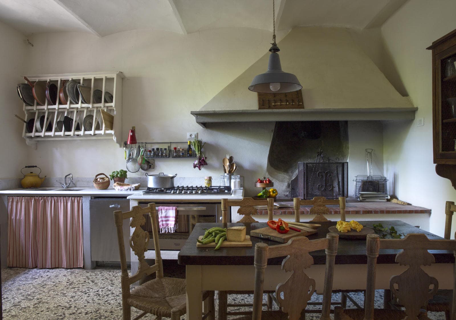 To the right of the ground floor hall is the delicately frescoed living room, whose original tiled flooring and pastel landscapes, as well as its lovely piano, have been preserved with care. This room leads directly into an old world study whose broad desk may come to hold a laptop or two, for this room has the best WiFi coverage in the villa. Also off the entry hall is the charming dining room with a table for 10 and a handy 'dumb waiter' that allows dishes to be passed directly from the kitchen pantry. The pantry, which is reached up a few stairs from the entry hall is adjacent to a large country kitchen that provides necessary modern appliances yet, with its corner fireplace and over-the-sink drying rack retains its traditional look. Also on this level, to the left of the staircase to the upper floors, is a guest WC/wet room and a laundry room.