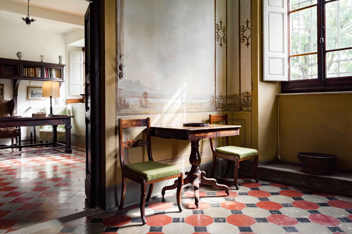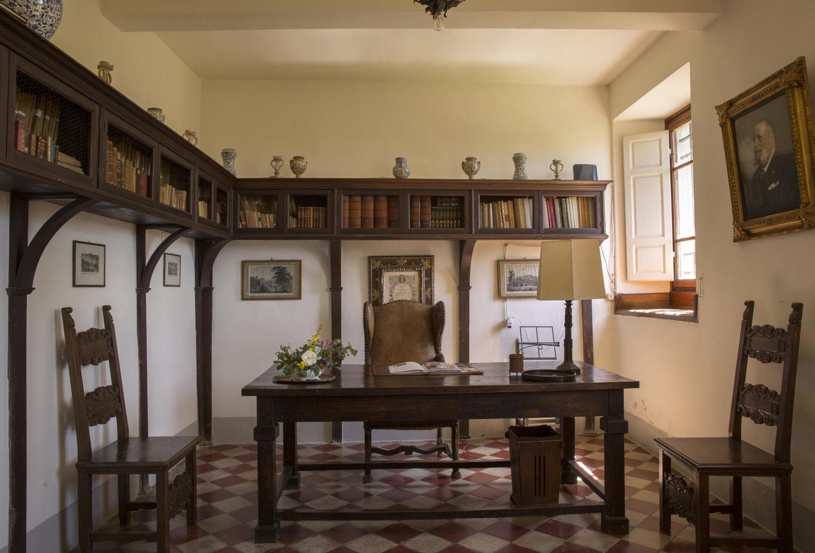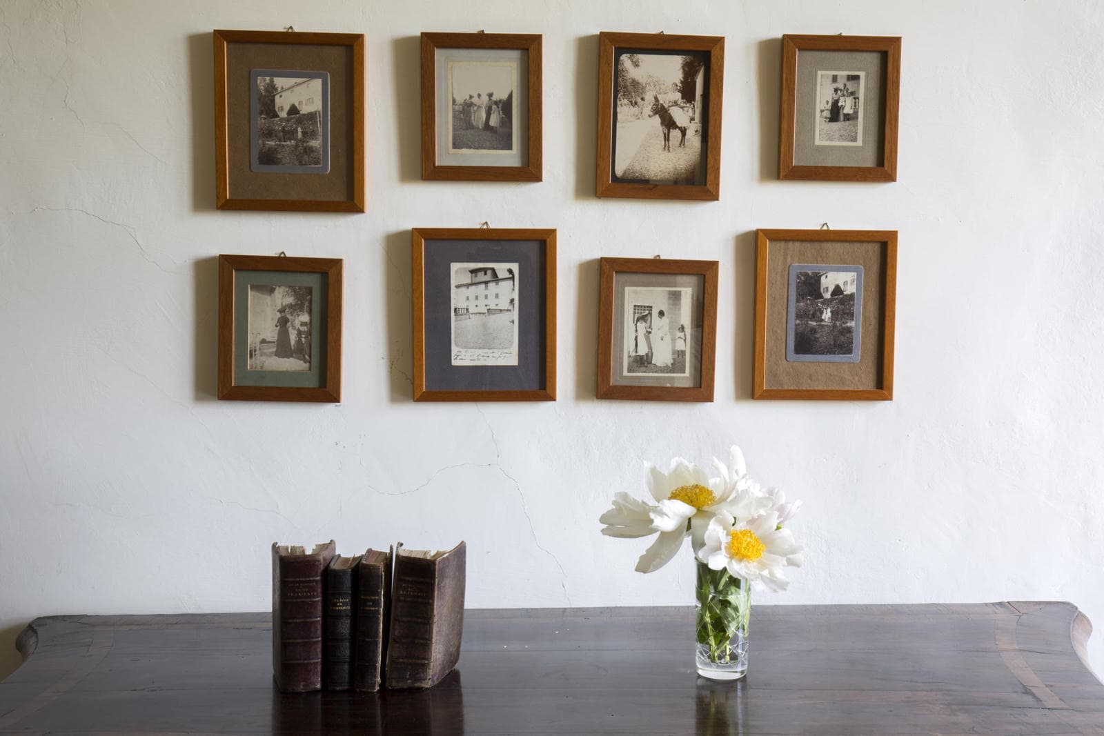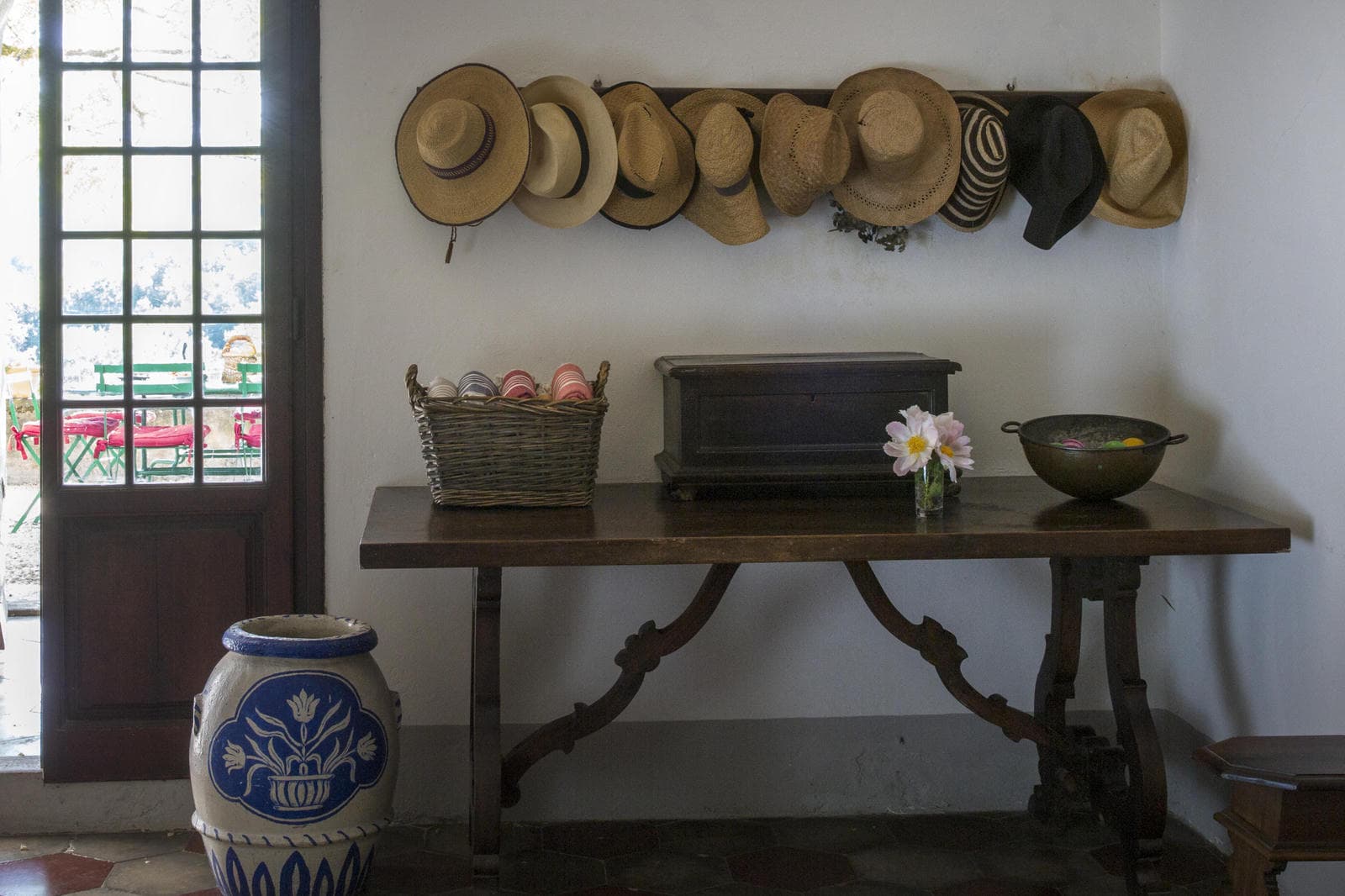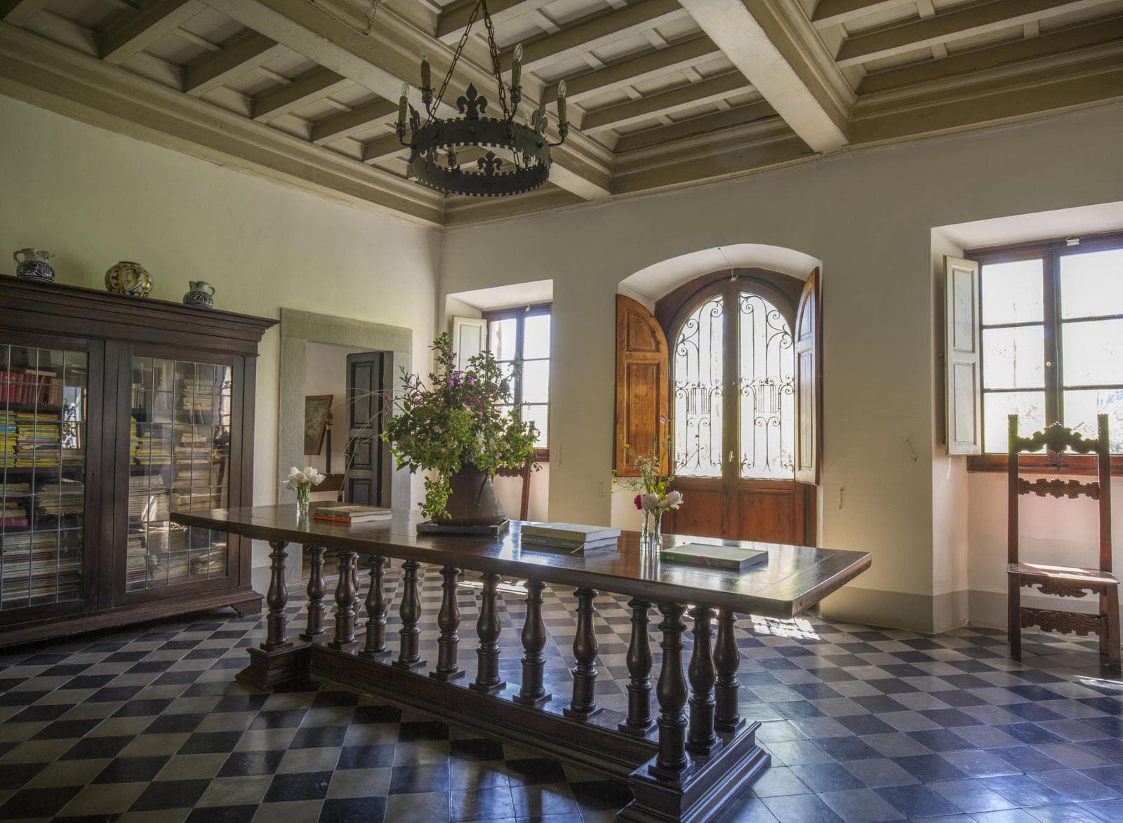 On the first floor, accessed via interior or exterior stairways, is the entry hall with patrician dimensions, a coffered ceiling and furnishings that relate its age, be it a grandfather clock, beautifully glazed ceramics or reminders of the villa's day as a hunting lodge.