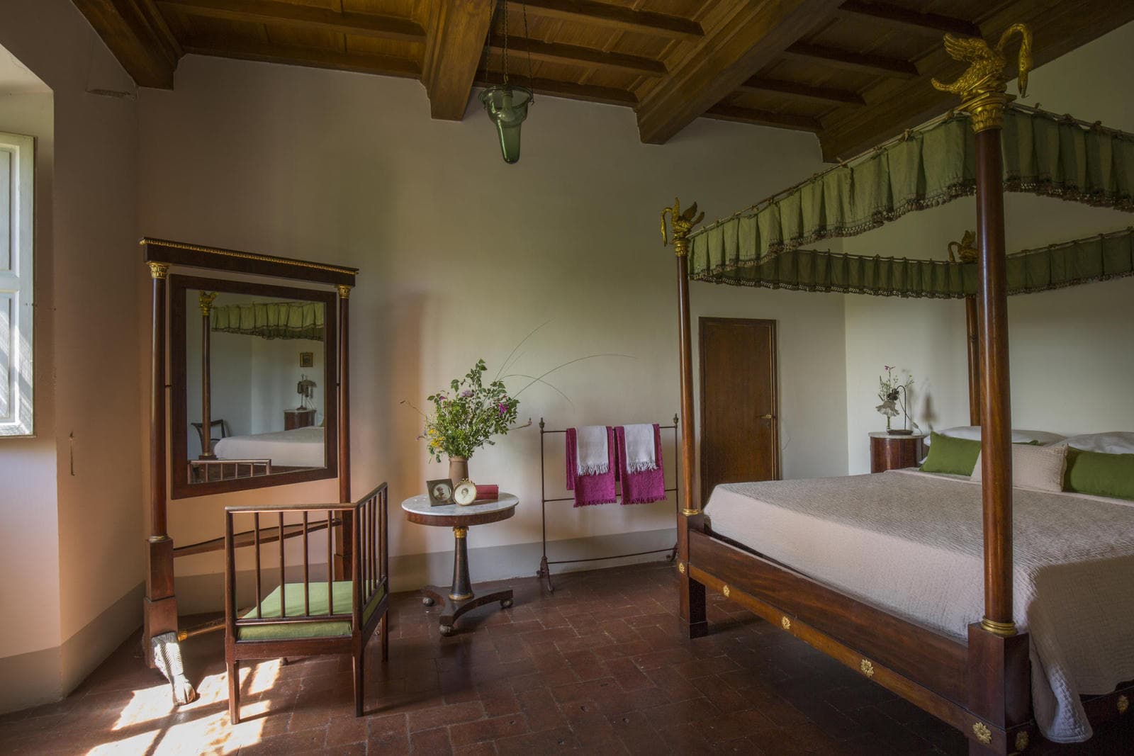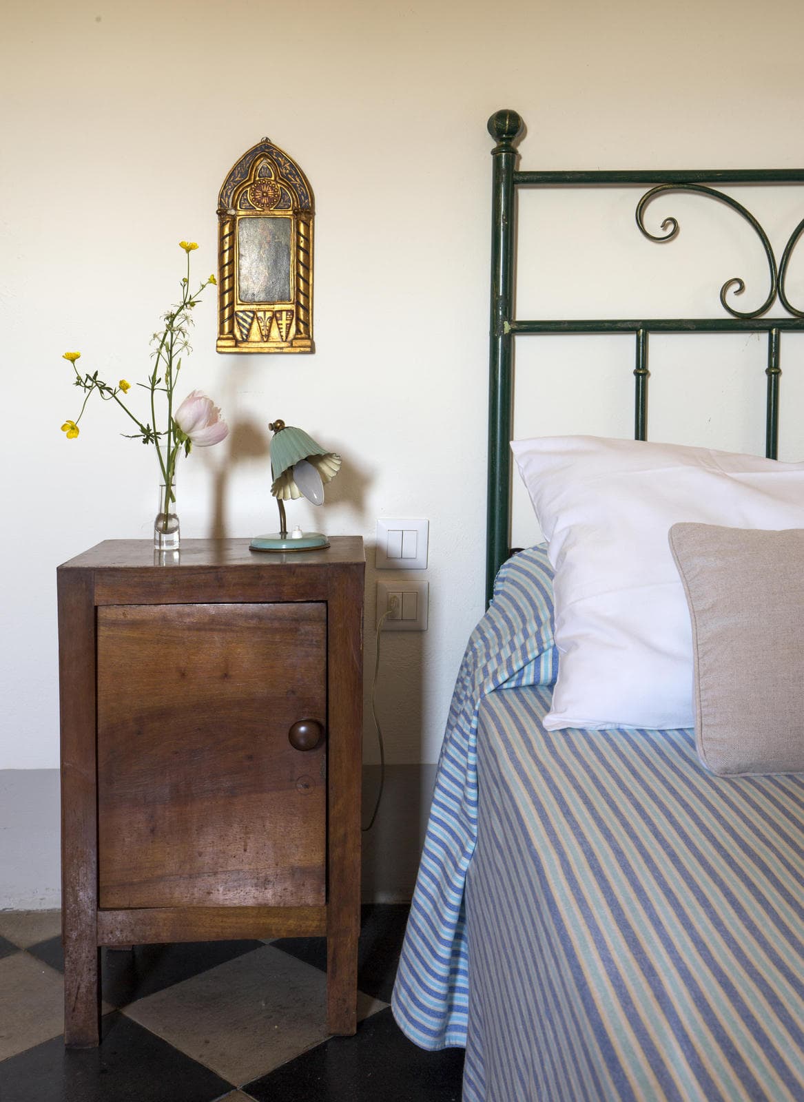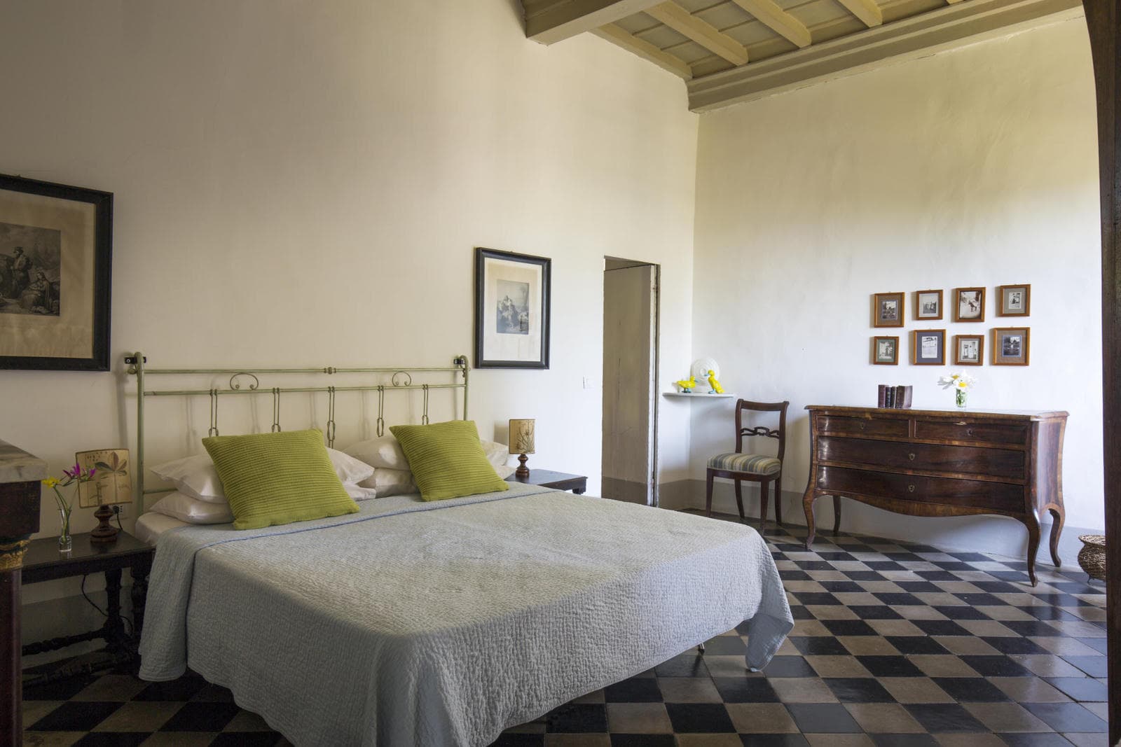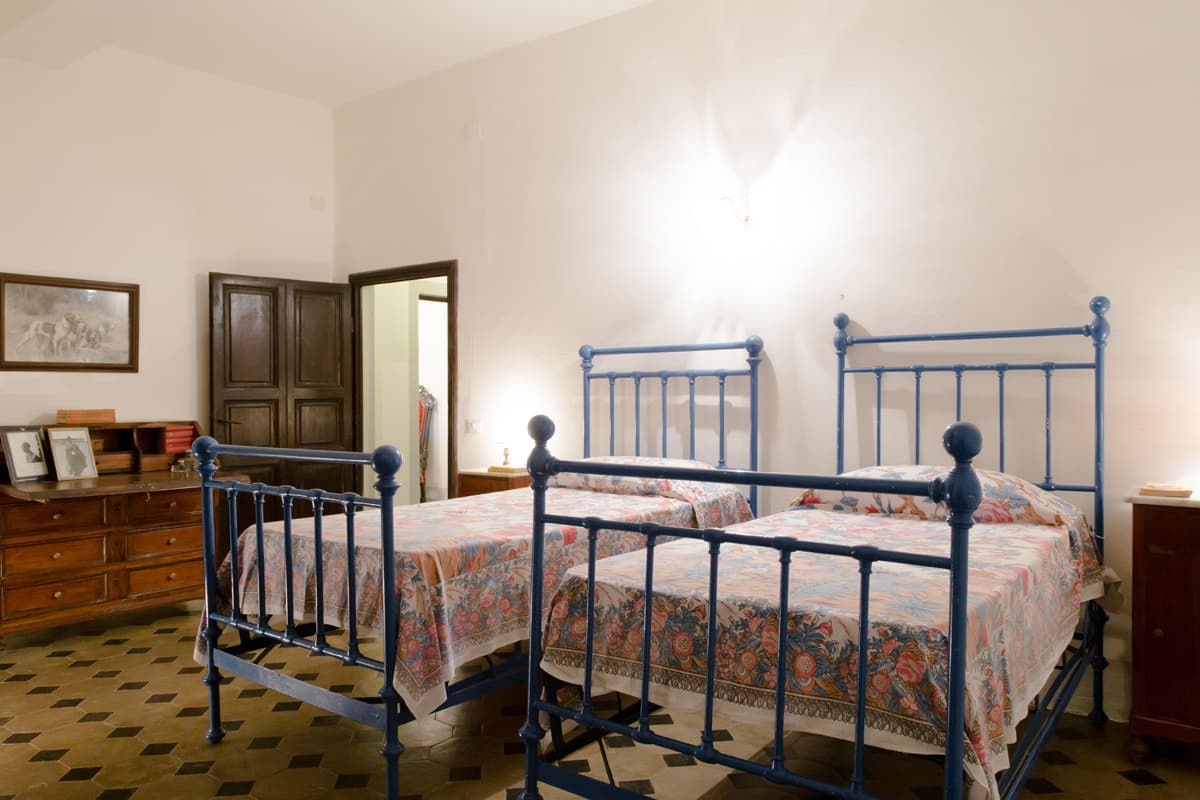 Also on this side of the house is a twin bedroom with an ensuite shower room whose window looks to the trees in the side garden. On the other side of the entry hall is a sitting room that leads to a large double bedroom off of which is a smaller room furnished with a baby bed, the ideal set up for parents wanting to have their young one close by. Adjacent to this suite is another double bedroom with hand-painted bedstead and adjoining small sitting area.