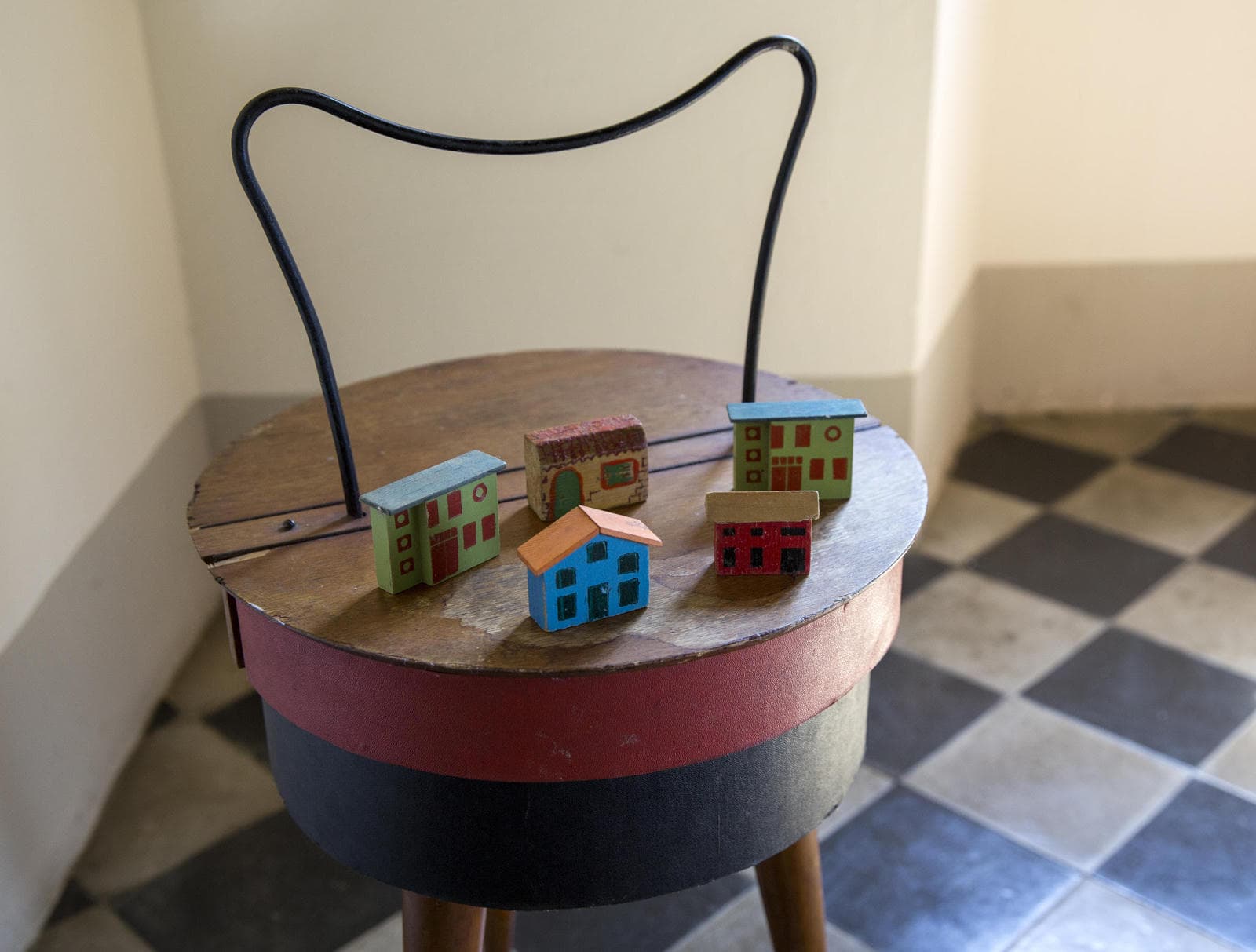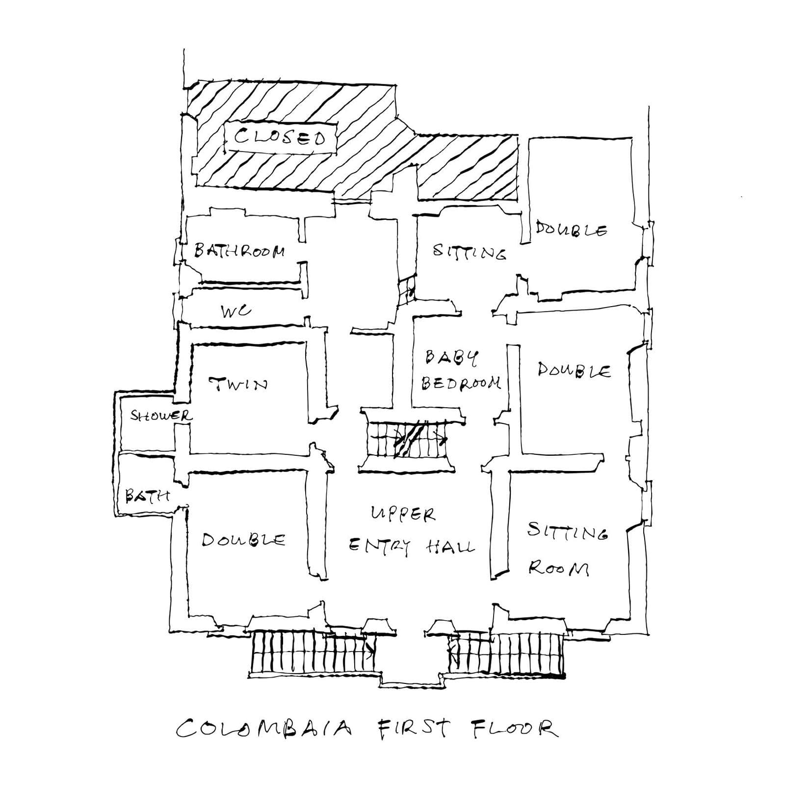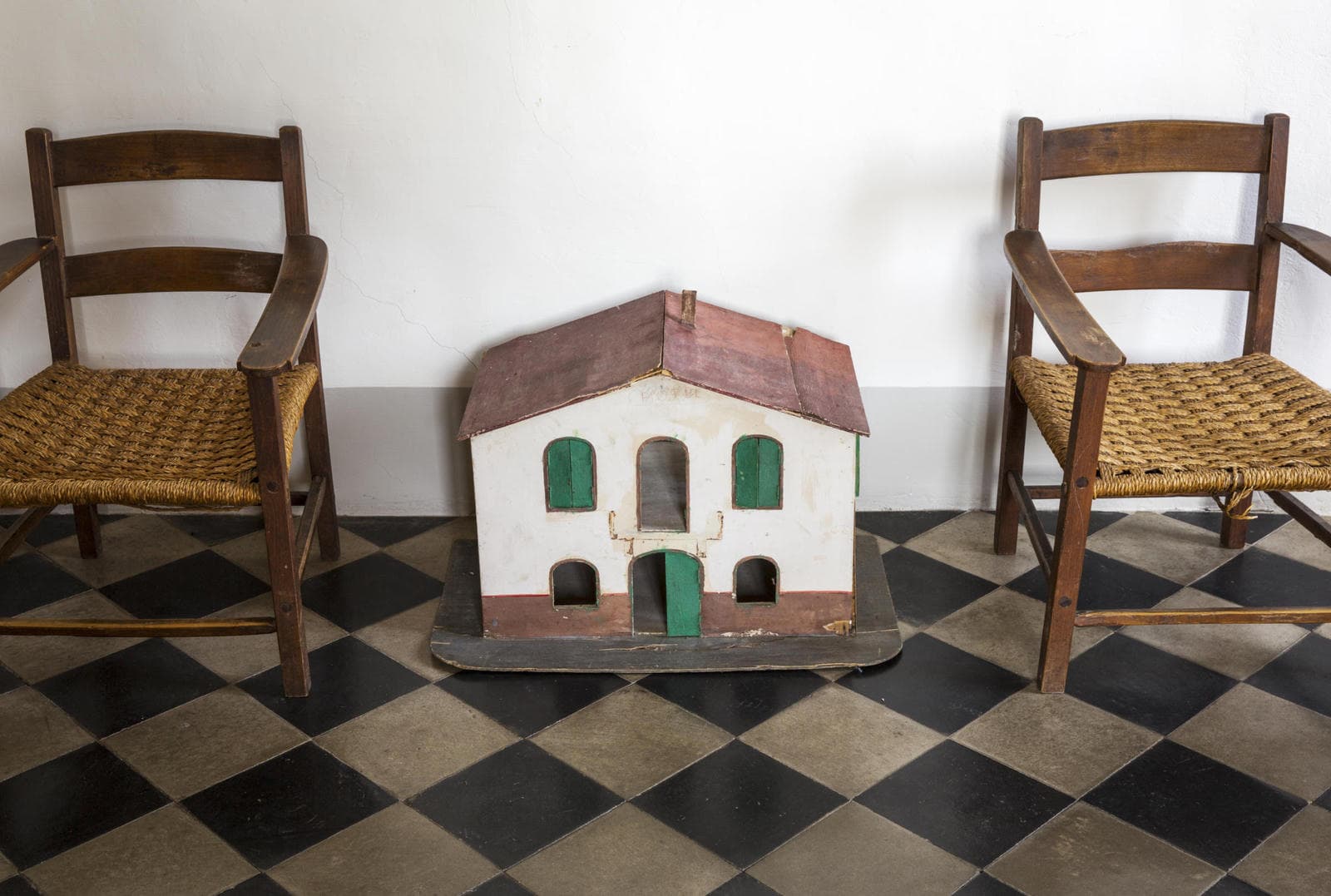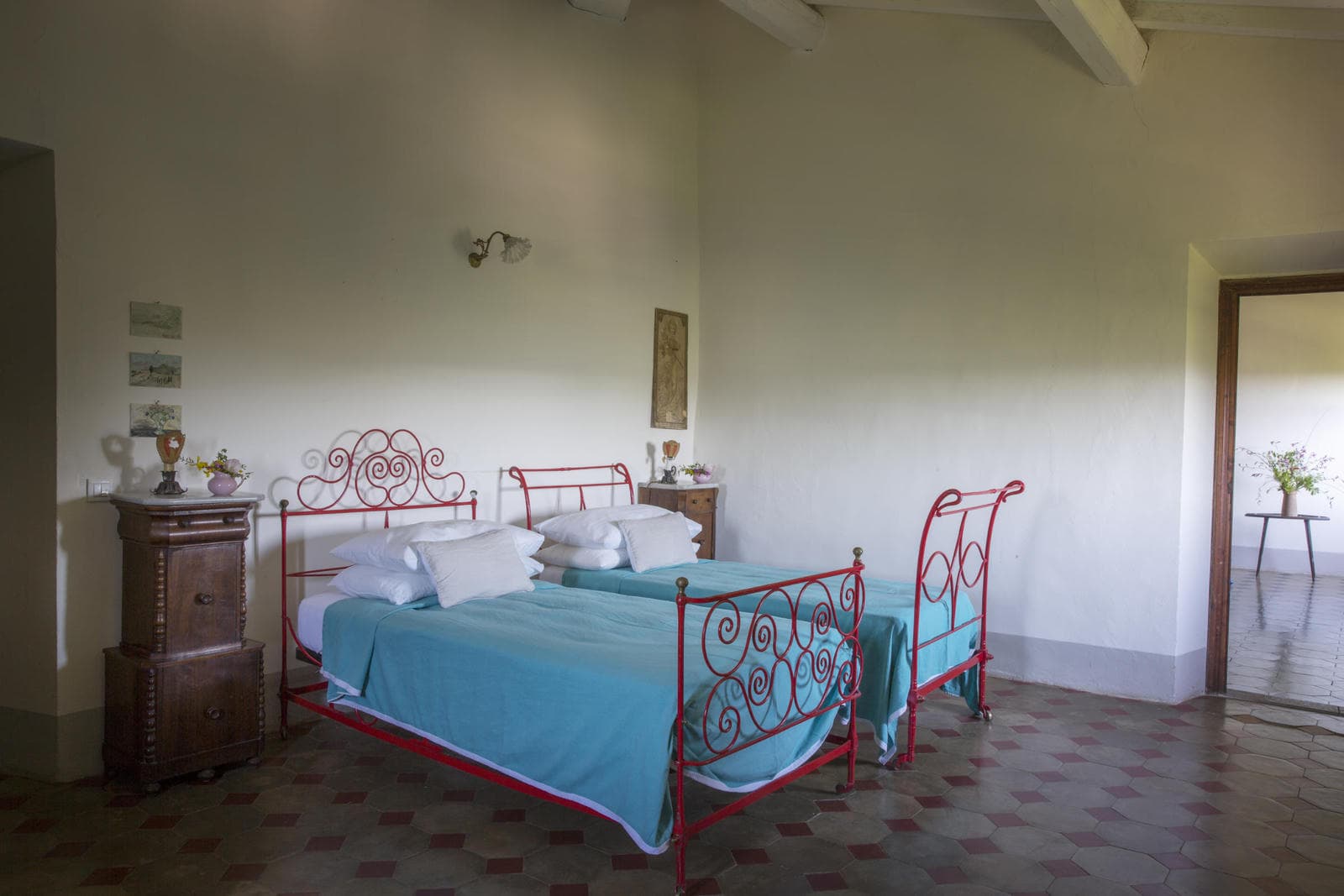 Also on this side of the house is a twin bedroom with an ensuite shower room whose window looks to the trees in the side garden. On the other side of the entry hall is a sitting room that leads to a large double bedroom off of which is a smaller room furnished with a baby bed, the ideal set up for parents wanting to have their young one close by. Adjacent to this suite is another double bedroom with hand-painted bedstead and adjoining small sitting area.