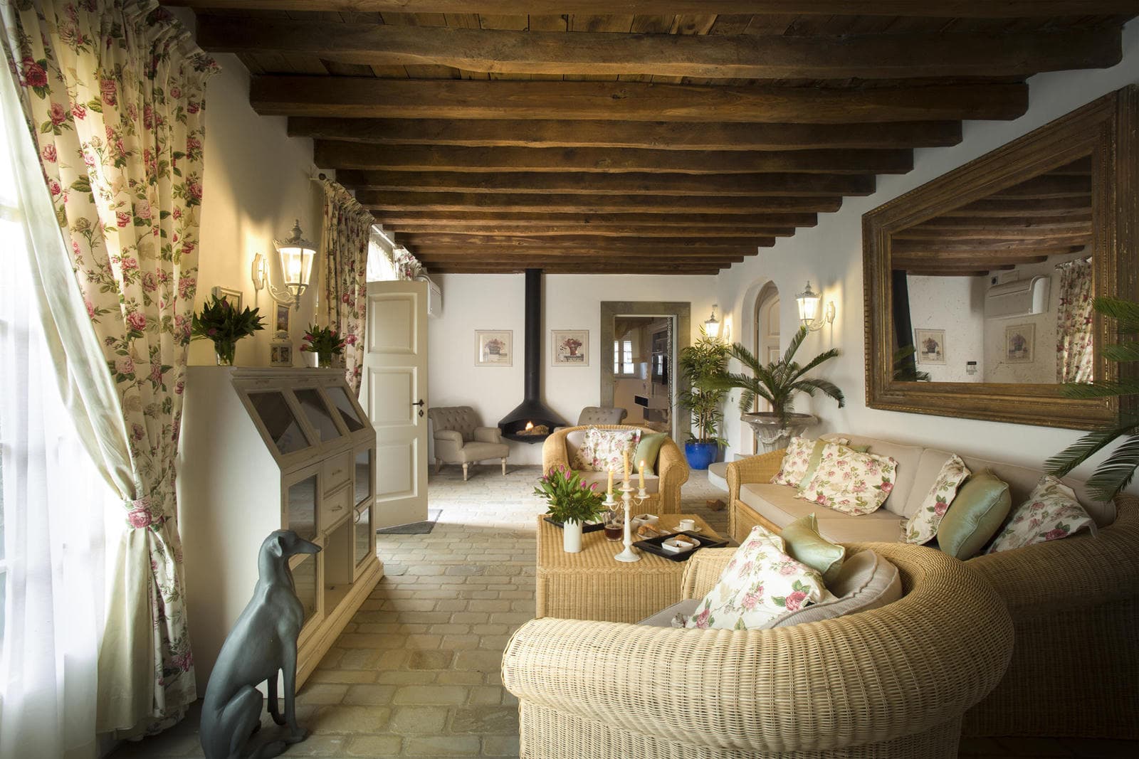 Ascending to the first floor, a stone staircase guides you to an expansive living room graced by a fireplace and sofas. The ambiance is elevated by a wooden beam ceiling, combining traditional charm with contemporary amenities. This floor accommodates four bedrooms, each thoughtfully equipped with built-in wardrobes and en-suite bathrooms that include both a bathtub and a shower. Among these bedrooms, three boast double beds, while one is furnished with two single beds. The bedrooms are tastefully decorated and offer captivating vistas of the surrounding countryside. Additionally, the bathrooms are elegantly adorned with travertine marble.