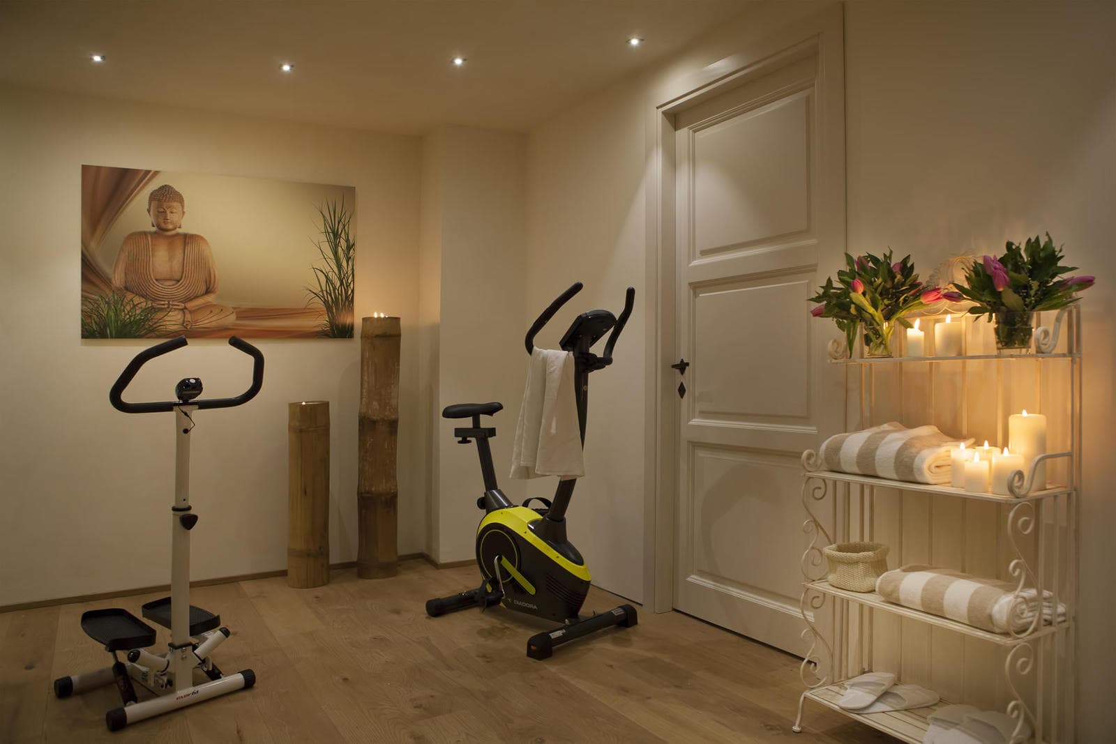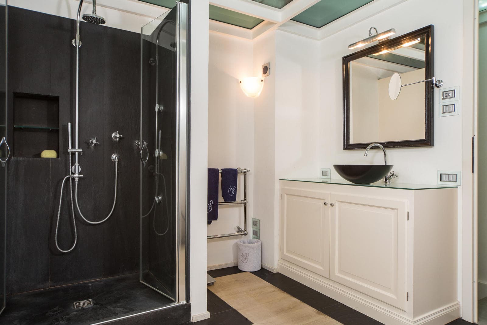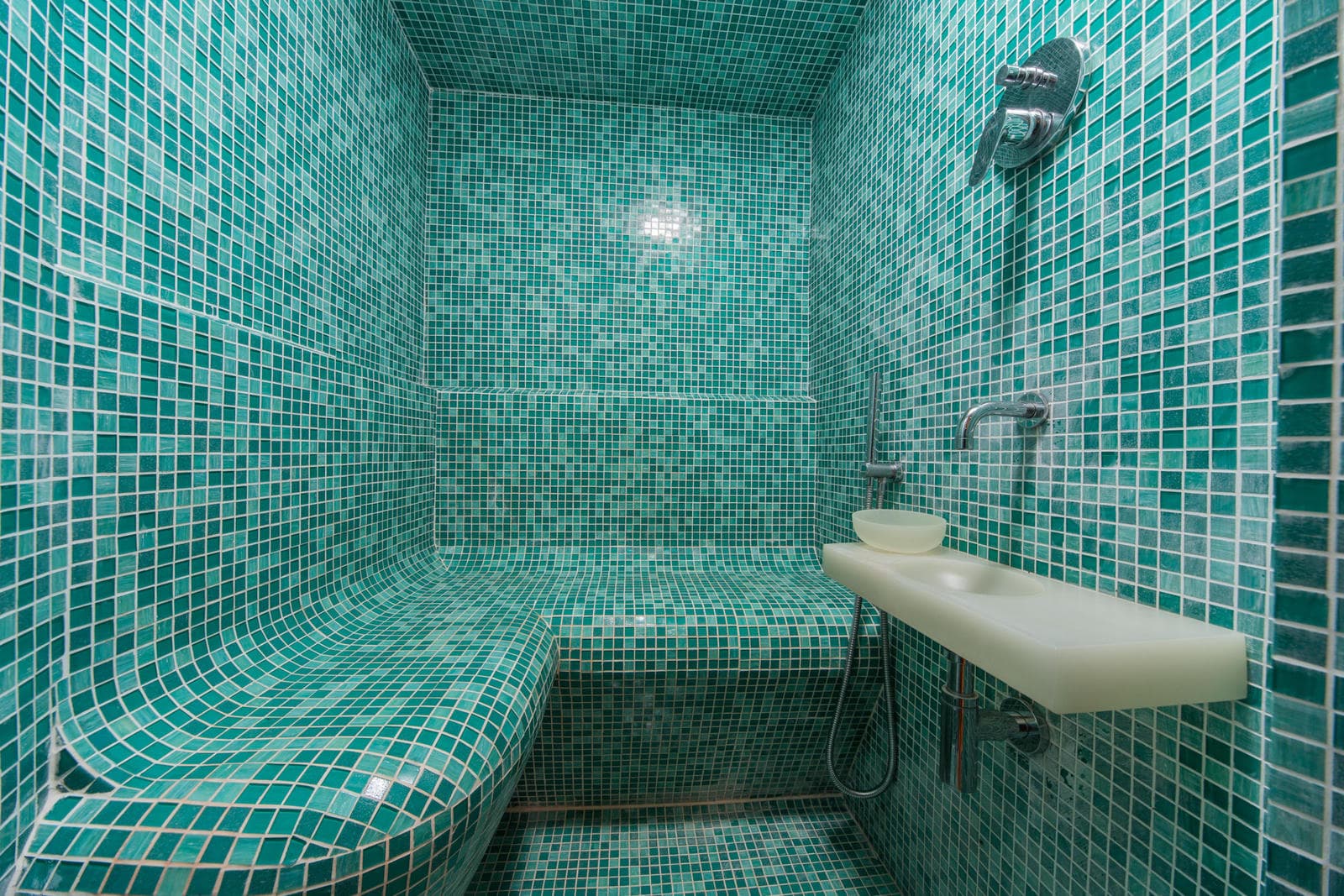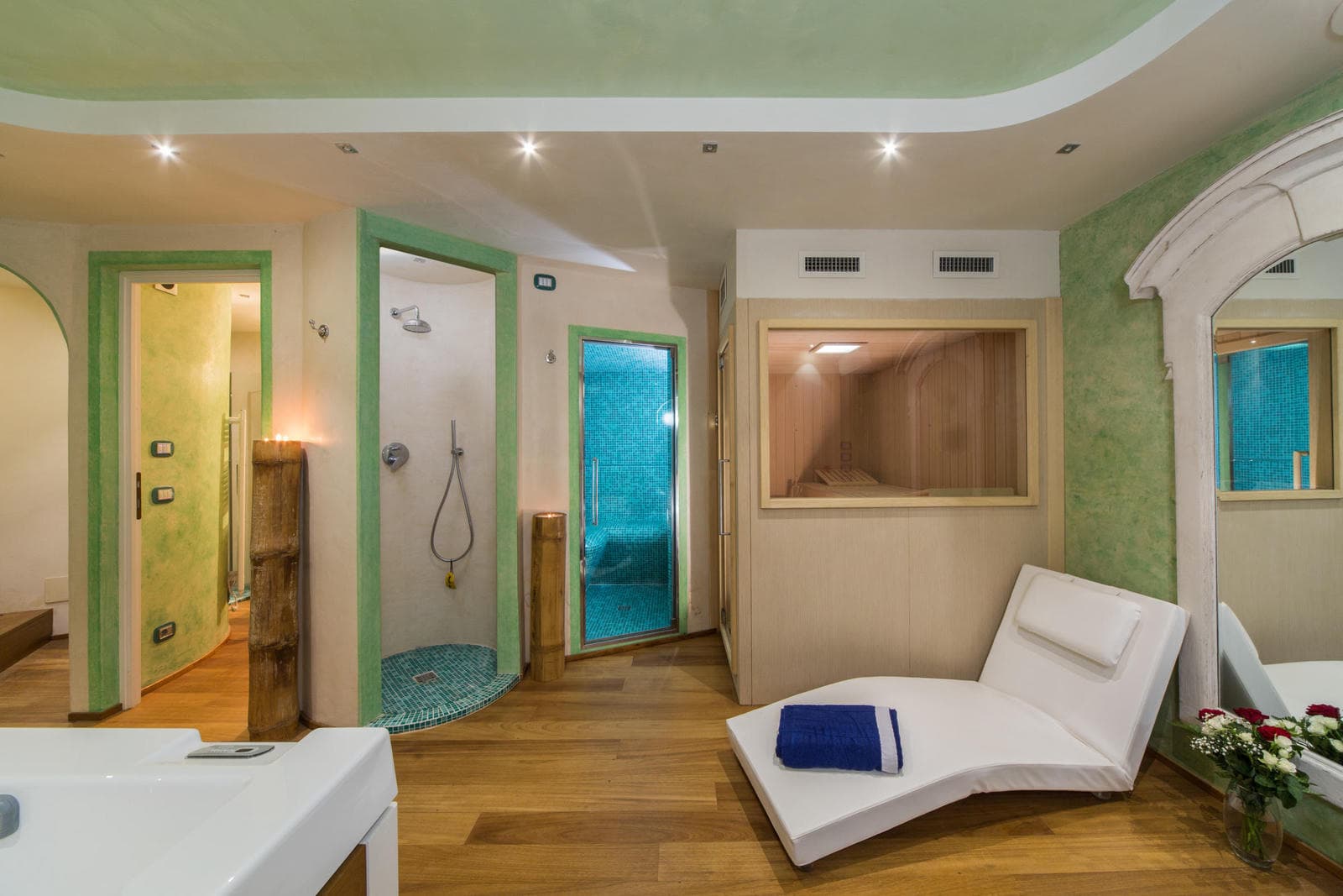 The lower level of the villa is dedicated to the spa facilities, comprising a Turkish bath, sauna, and jacuzzi. Access to the spa is located at the rear of the villa.