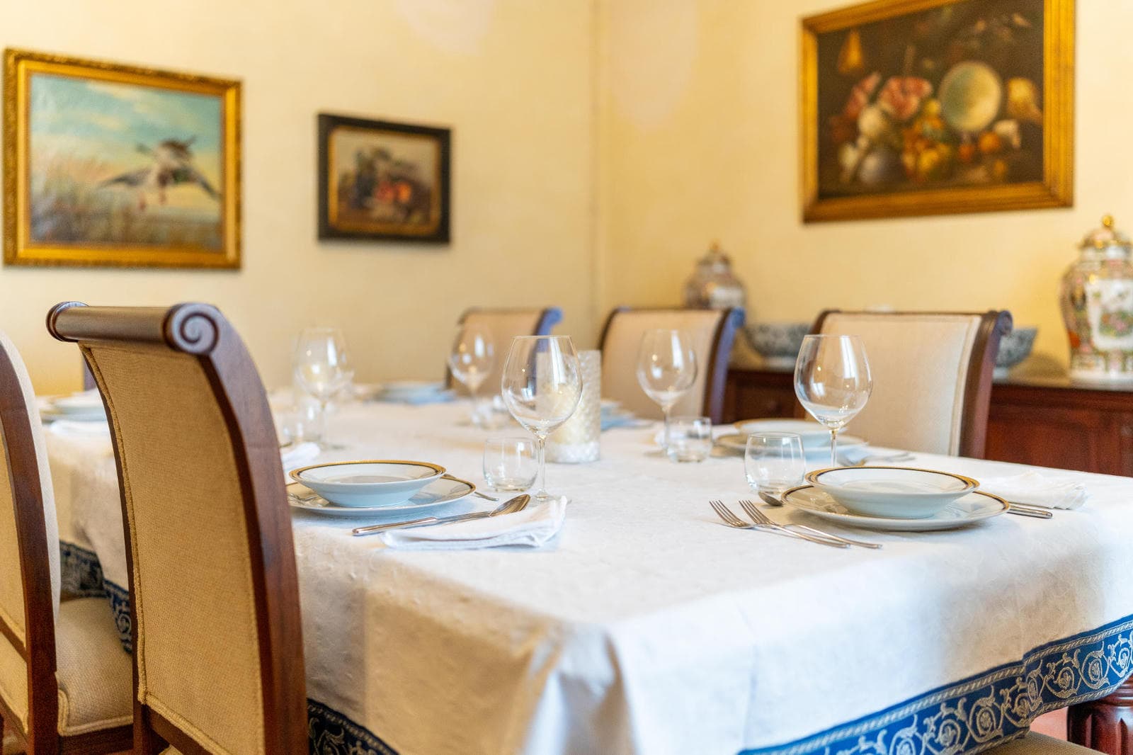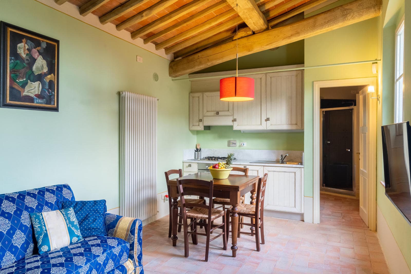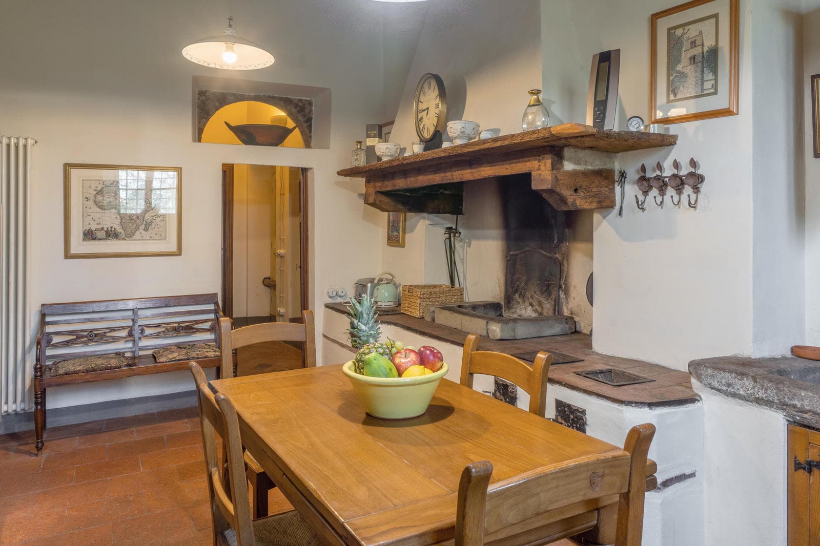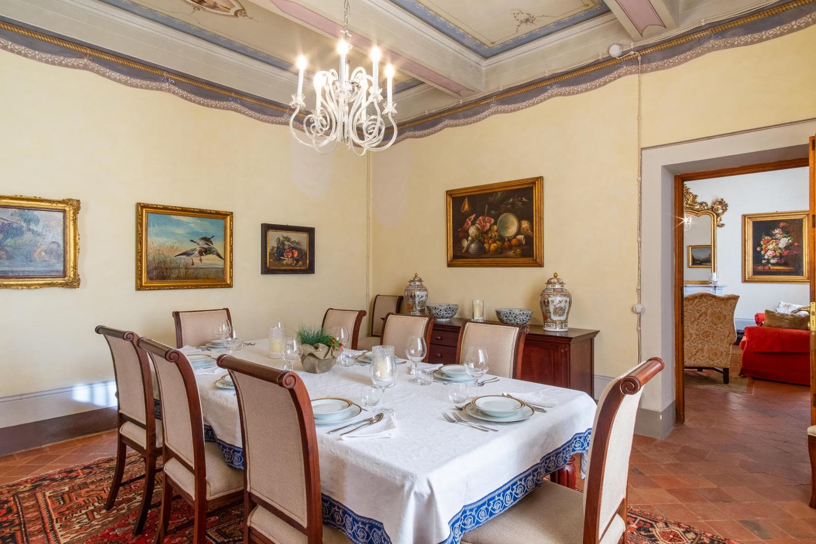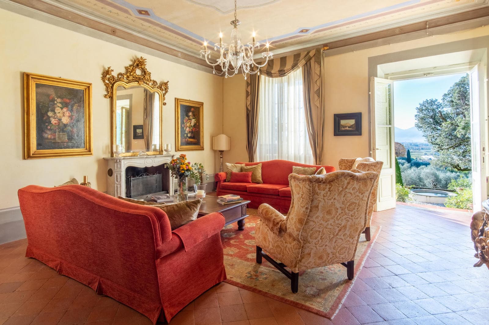 This historic villa has elegant and spacious rooms throughout, with high painted vaulted ceilings and antique furniture. One enters the villa into a beautiful living room with tall windows that face a long-reaching view towards the Tuscan countryside and Lucca. The room is centred on a fireplace and furnished with comfortable sofas. On the other side of the entrance hall a spacious dining room is ready for those few days you might not wish to dine outside, al-fresco, under the furnished and shaded pergola.