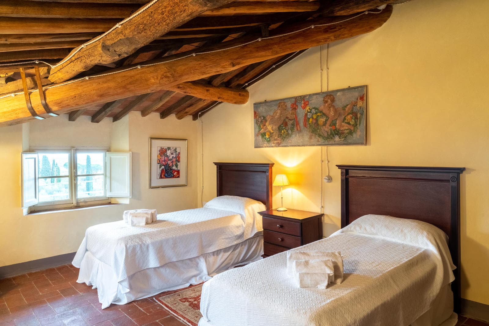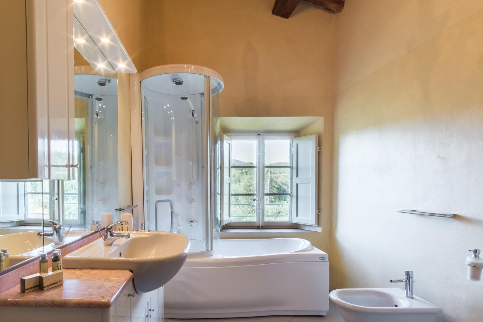 There is also a lift to reach the further two floors with ease. On the first floor the master bedroom is a vast bedroom with windows facing the view towards Lucca, and a large bathroom with a claw-footed bathtub and a large shower. An ensuite double bedroom as well as an ensuite twin bedroom complete this floor. On the second and last floor the vaulted ceilings of the lower floors change to impressive ceilings of wooden beams and rafters, sloping down from the central ridge. On this floor there are two doubles with ensuite bathroom, as well as two twin bedrooms which share a bathroom.