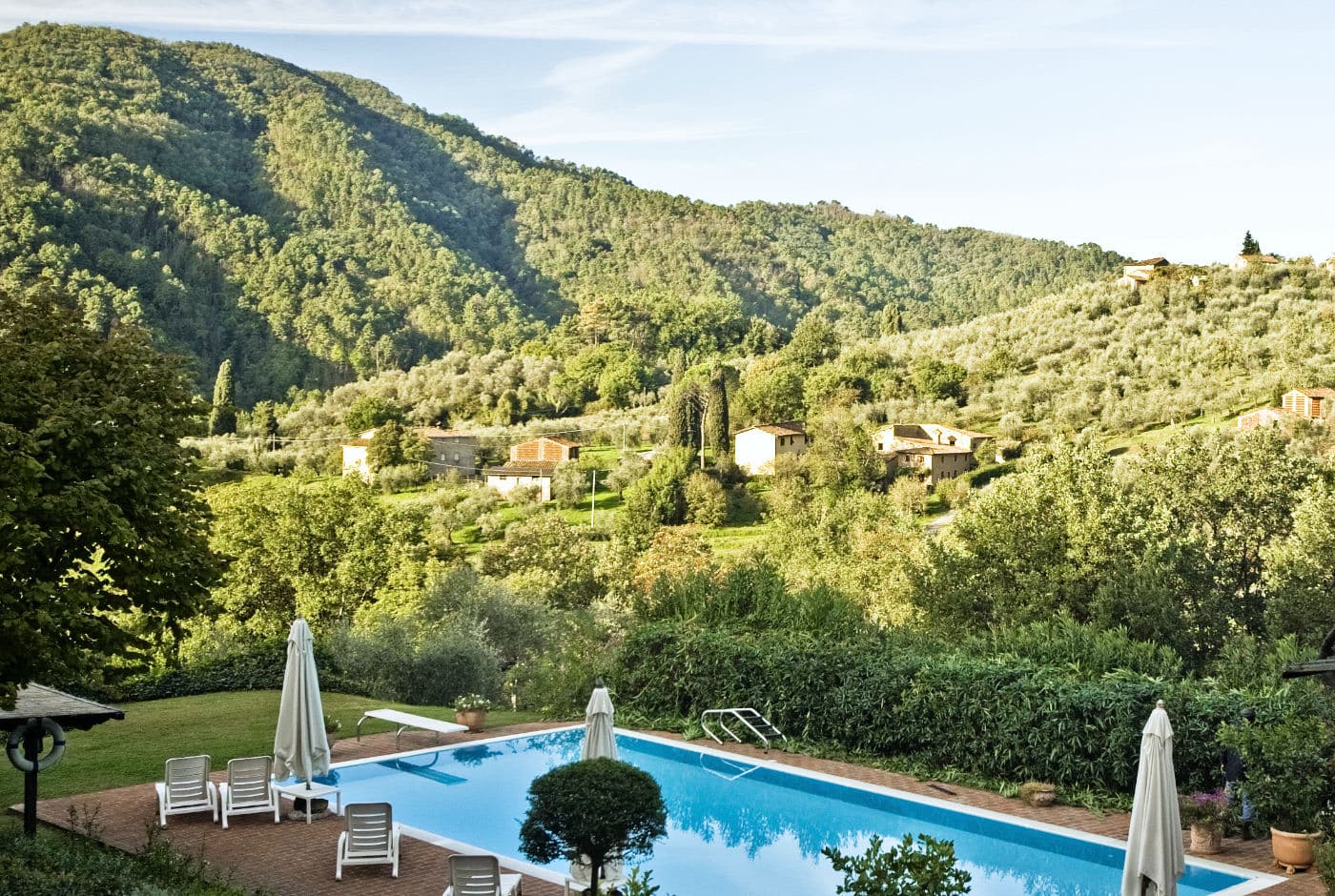 Ten minutes drive from Lucca, on the road that leads towards the marble mountains of the Apuane and Camaiore, a small drive leads to an idyllic hidden valley, where La Casina nestles snugly beneath its parent house.