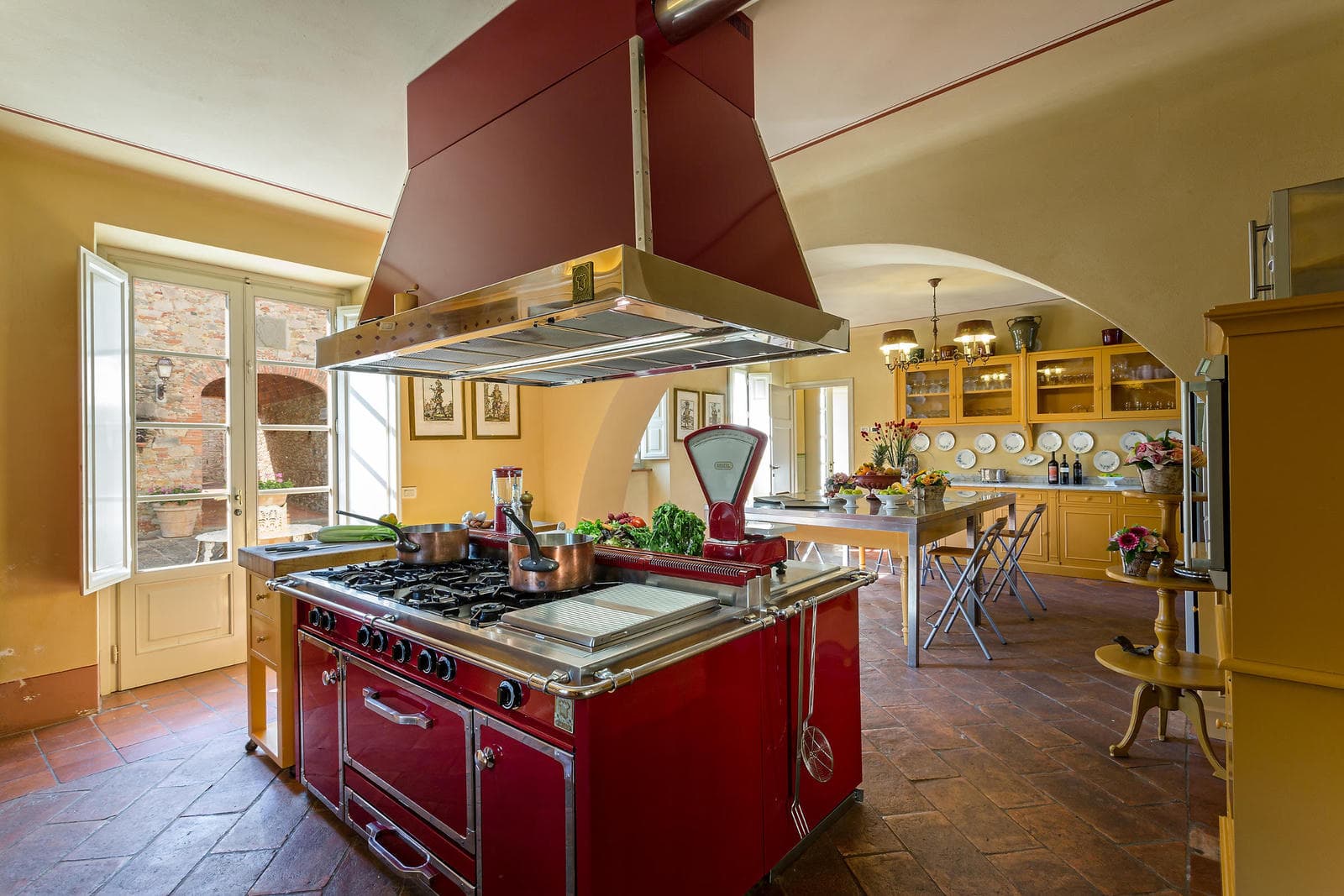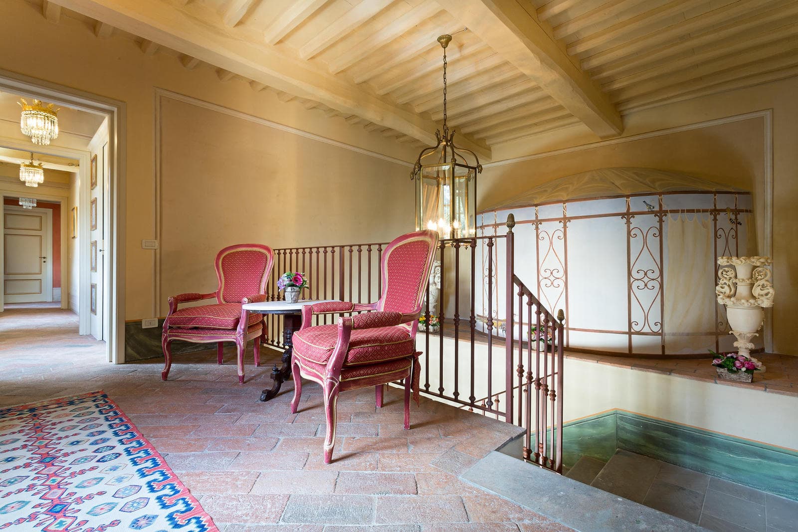The ground floor features a large dining area for 24 people, an elegant and spacious living room with a fireplace, a fully equipped kitchen in traditional Tuscan style, a laundry room, four guest bathrooms, and a gym. From the kitchen you can access the "Peschiera" courtyard, the alfresco dining area and a patio with tables.