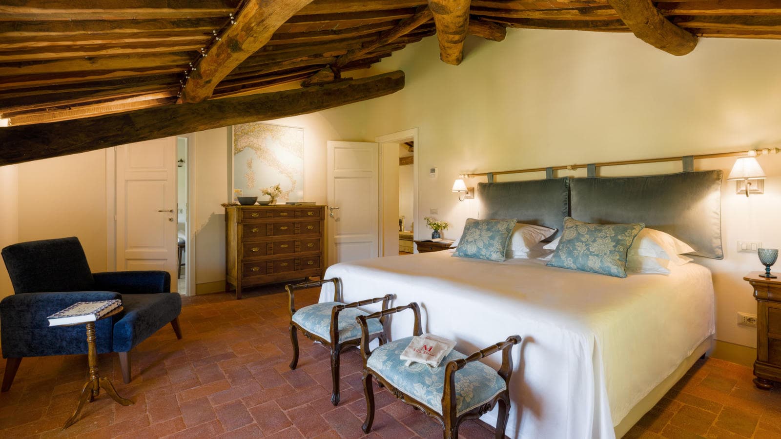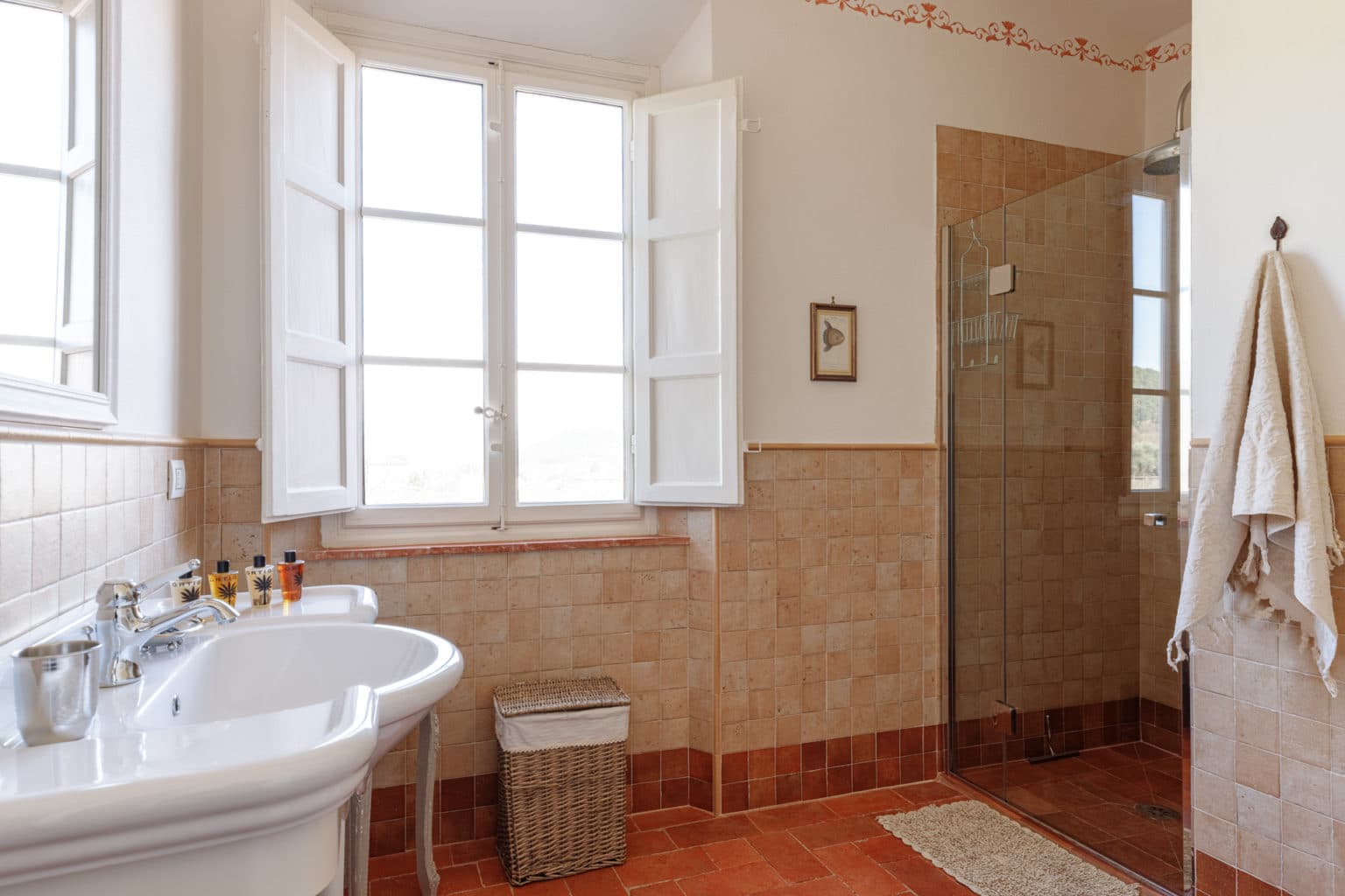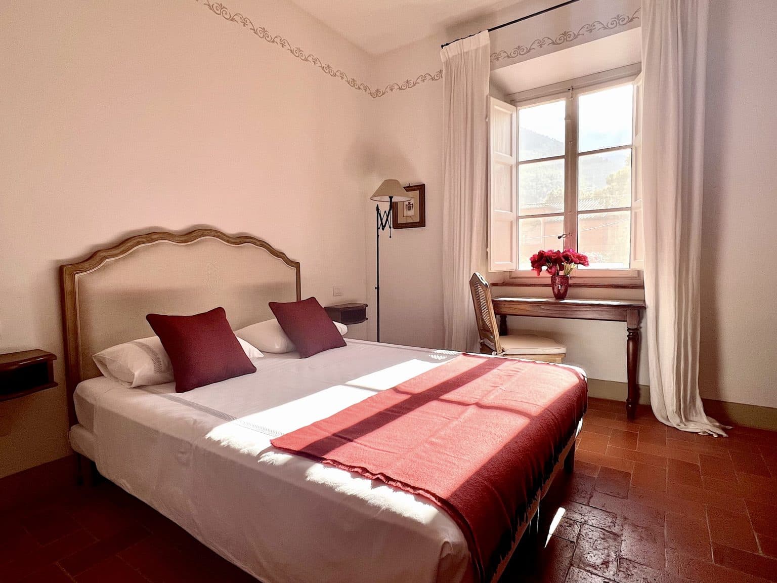 Today this beautiful Tuscan building has three ensuite doubles upstairs, with a well-equipped kitchen and a living room on the ground floor, and can be booked together with the main villa, bringing the total occupancy to 18 guests. While the villa outshines the podere, this is a wonderful building in its own right and has been decorated and designed with the same attention to detail accorded to the main villa.