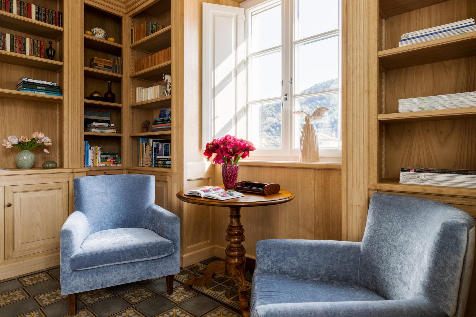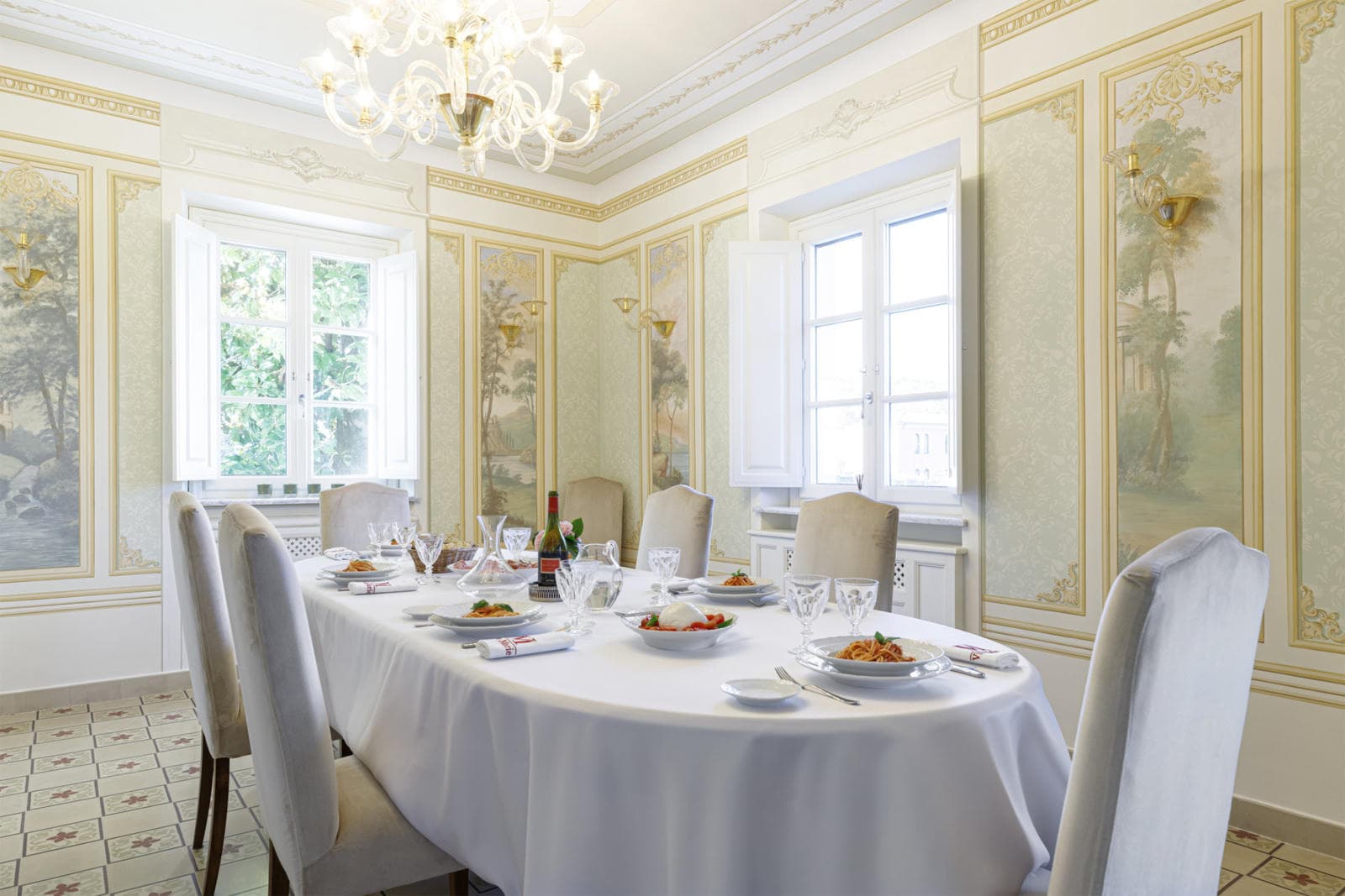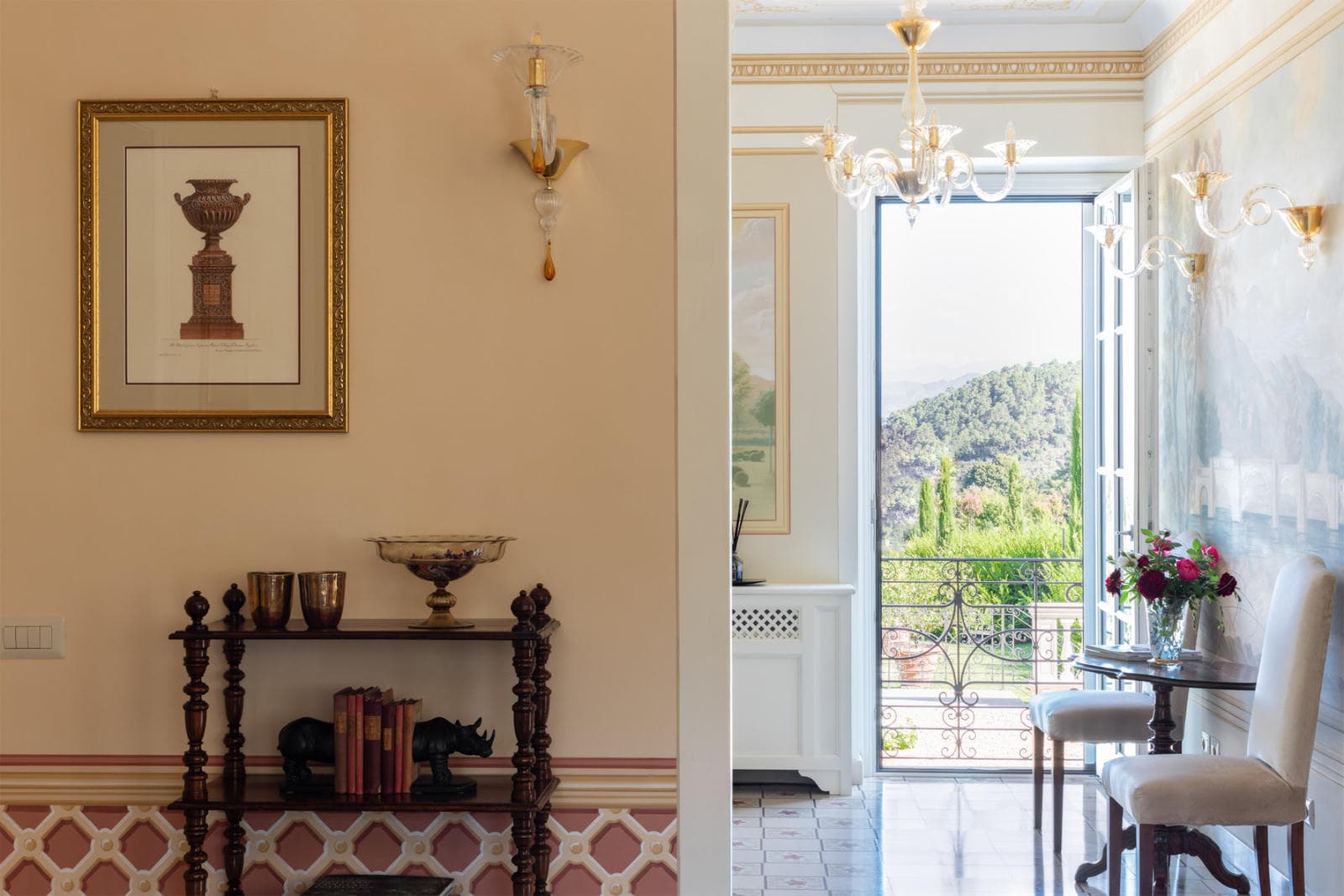 An entrance hall leads into the living room which is at the heart of the villa, spacious, light-filled and beautifully decorated. Around the living room you will find a well-equipped kitchen, a dining room with beautiful wall paintings and a charming studio with a TV, books, and a bar. From this floor a lift can relieve you of the need to use the stairs, making the other floors easy to reach.