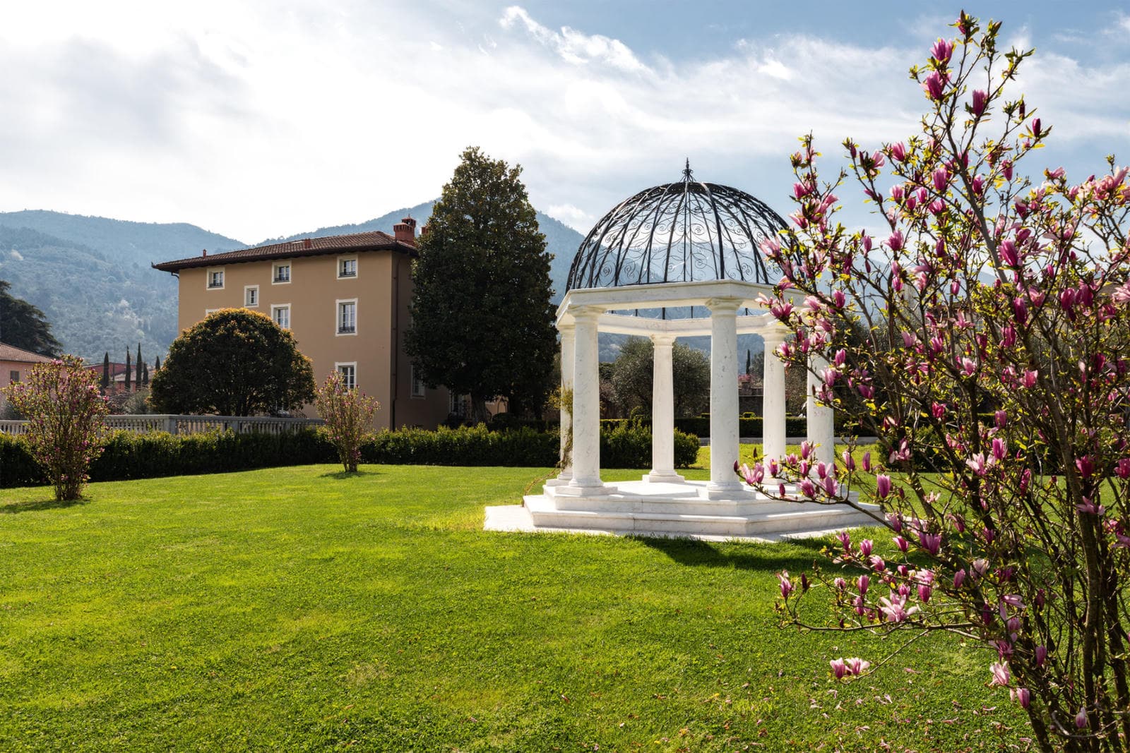 To the left, looking out from the Villa, a white gazebo marks the wedding garden, the perfect setting for wedding photos, draped in white wysteria and framed by magnolia.