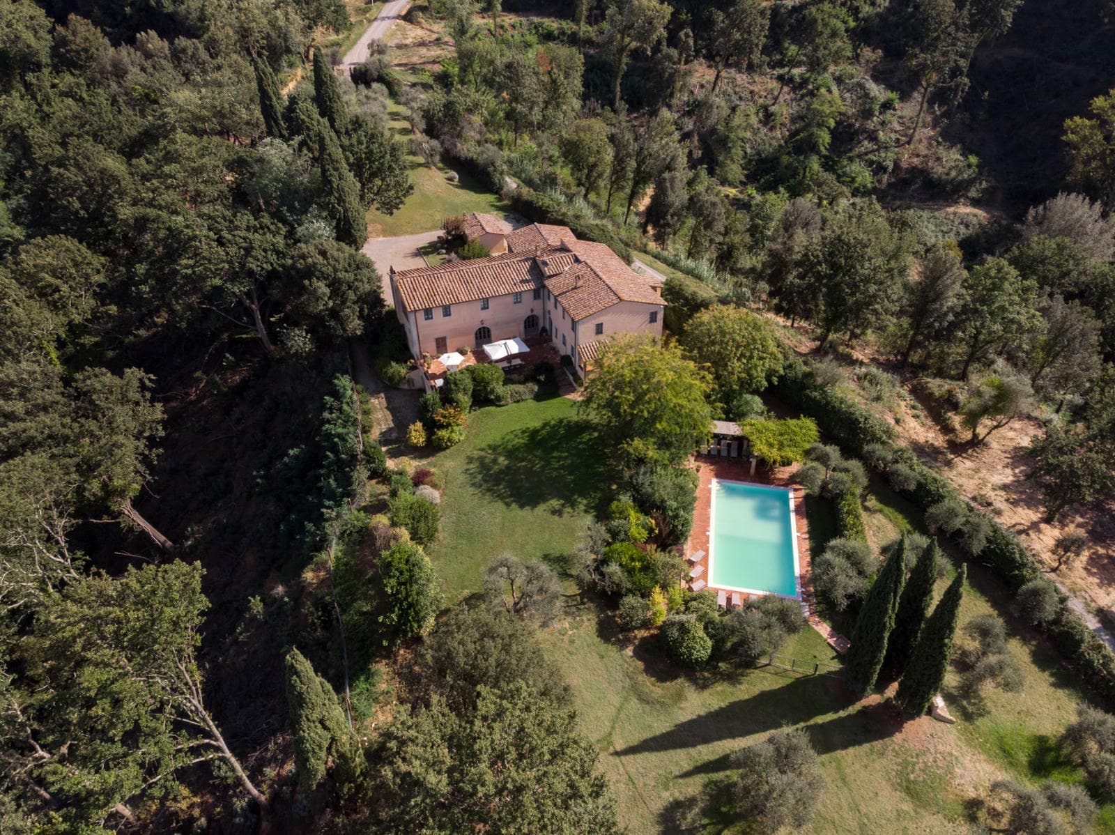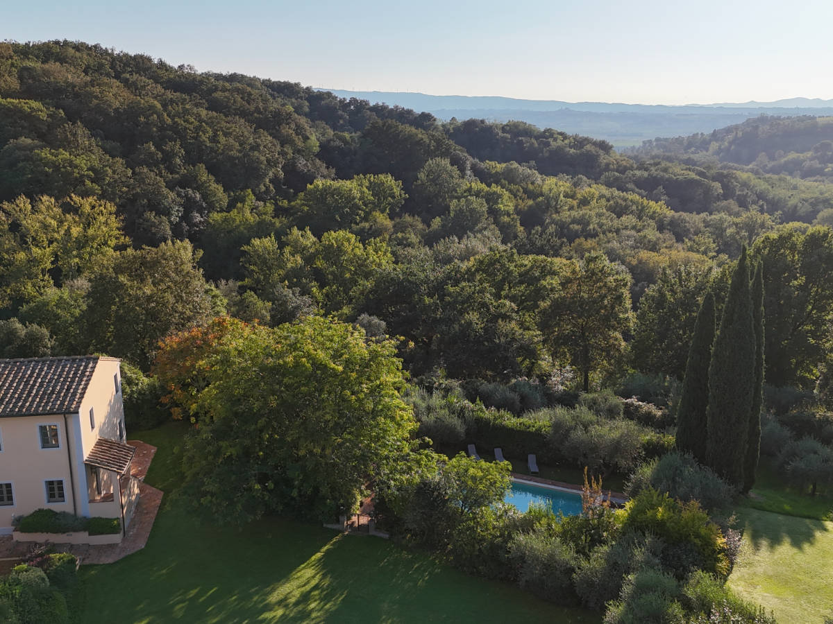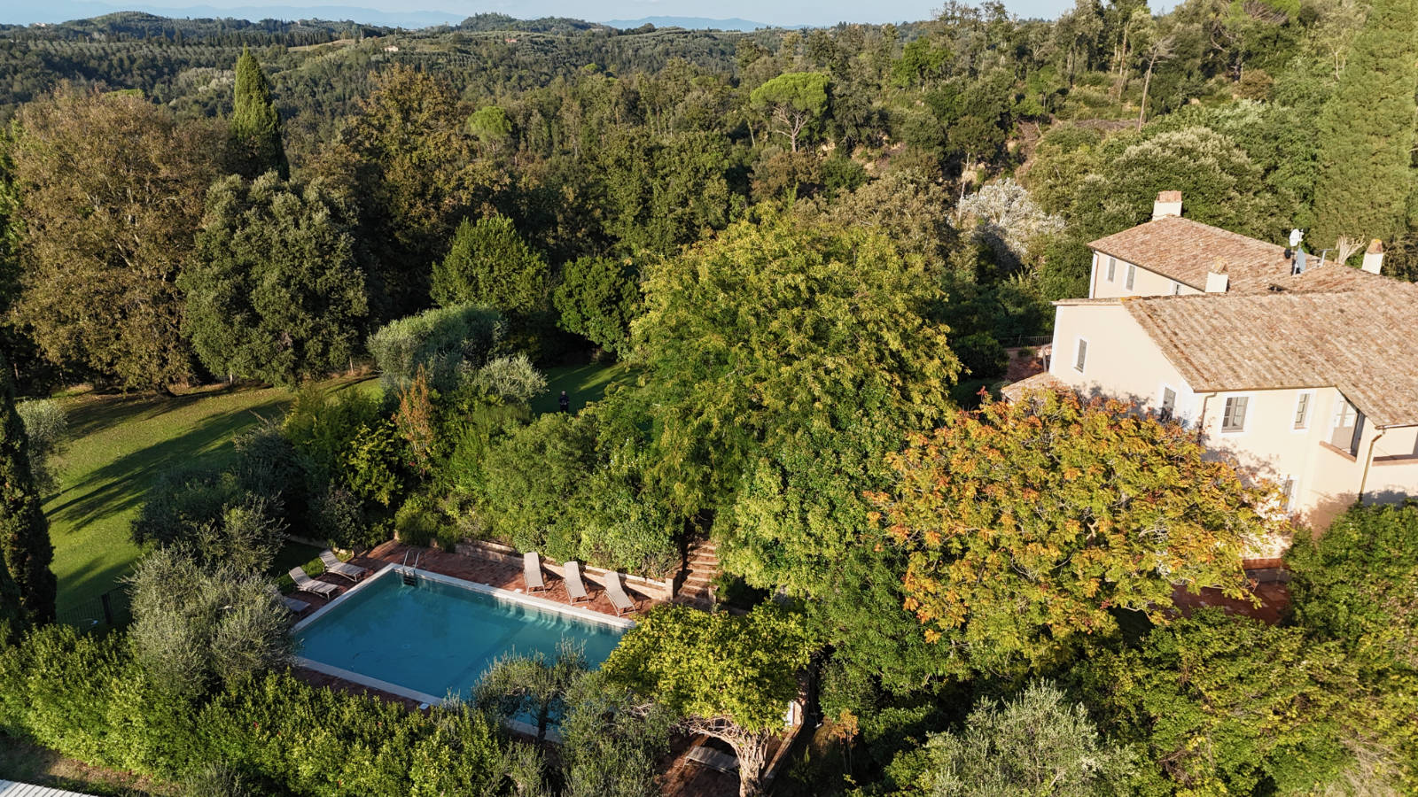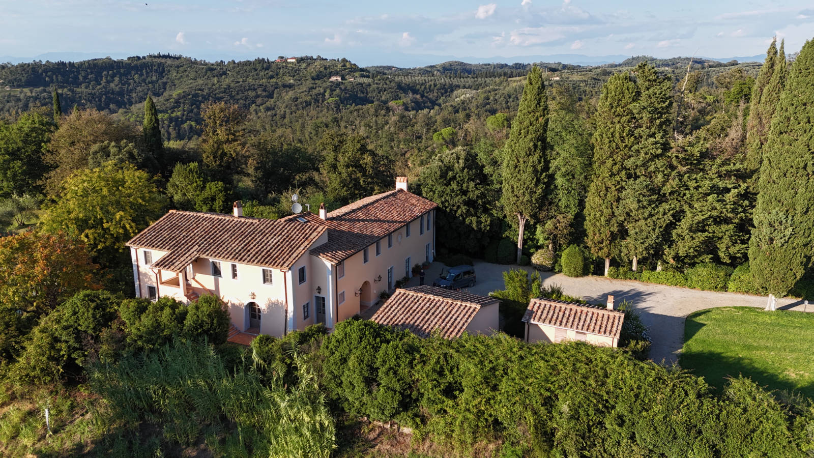 Outside, the villa offers landscaped gardens, a private swimming pool and shaded seating area, all set in a secluded hillside position with panoramic views. With the estate’s vineyards and olive groves forming the backdrop, the setting is tranquil yet accessible: the historic towns of Pisa, Volterra and Florence are within easy reach for day trips.