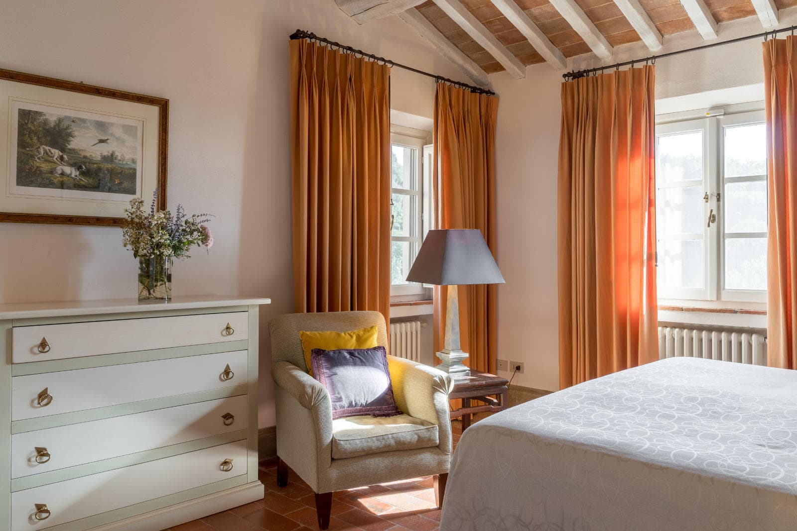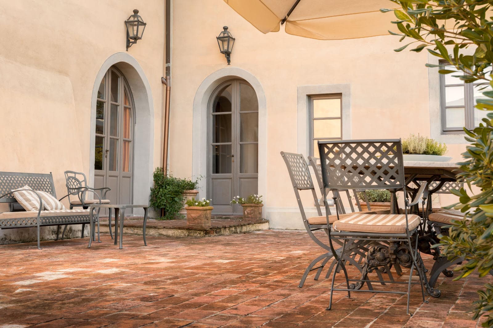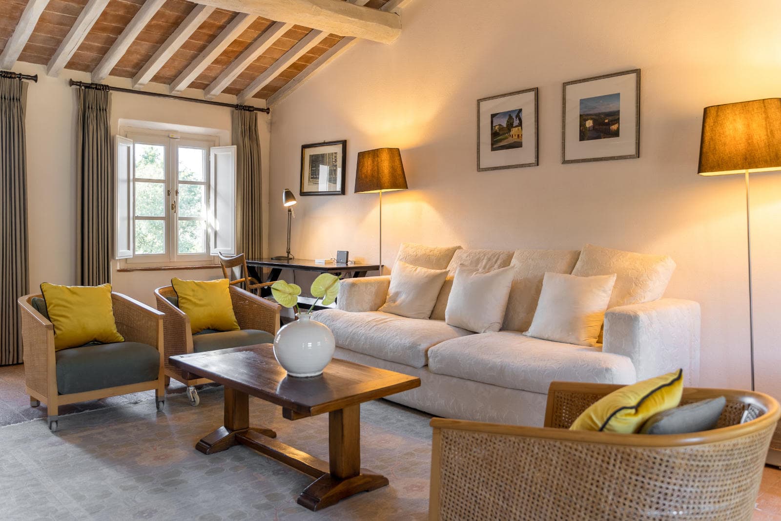 The villa accommodates up to 14 guests across 8 elegantly furnished bedrooms (with 7 bathrooms) arranged in the main house and a separate annex (“Limonaia”) for additional privacy. Inside, traditional features such as terracotta floors, high beamed ceilings, and soft Tuscan-hued walls combine with top-tier amenities: a fully equipped modern kitchen, living/dining spaces that flow to outdoor terraces, air conditioning and heating throughout, WiFi, Bose music system and more.