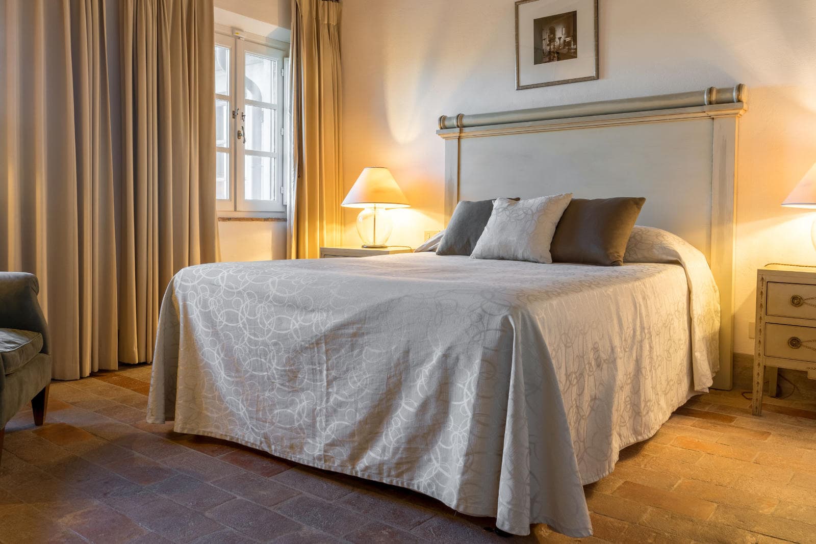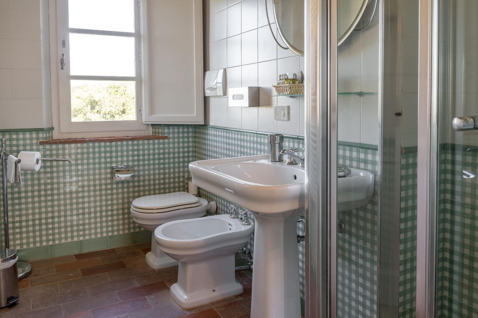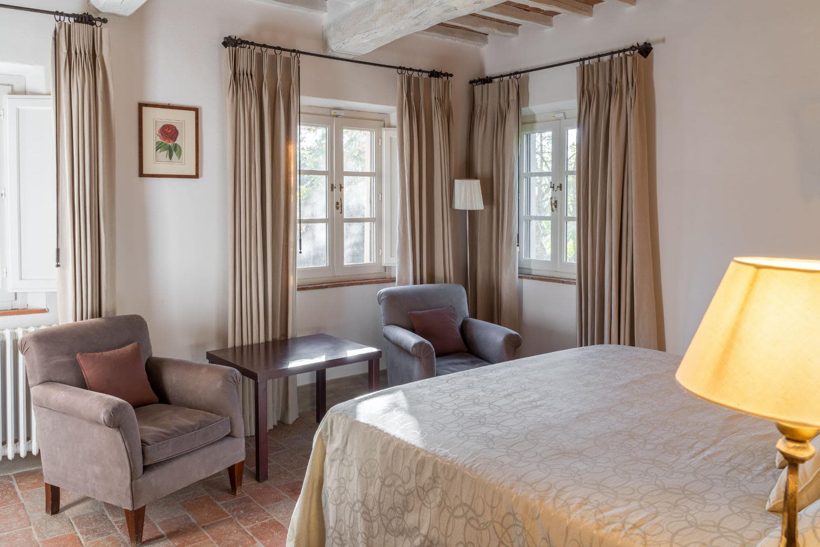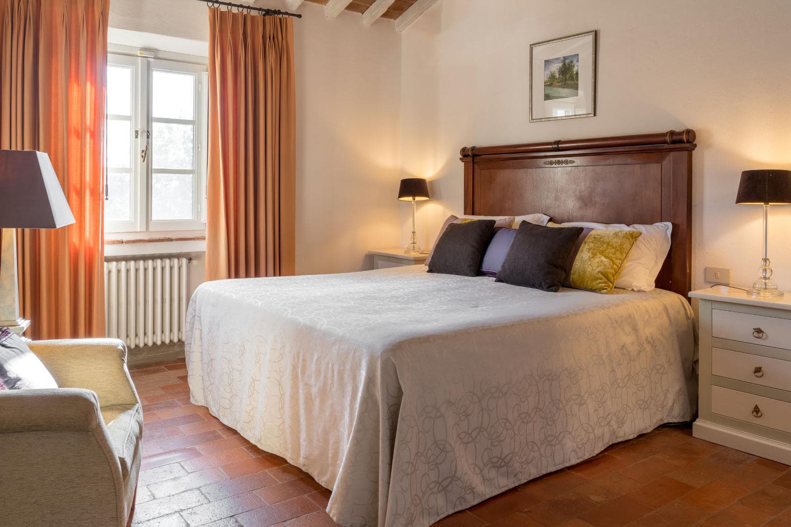 The villa accommodates up to 14 guests across 8 elegantly furnished bedrooms (with 7 bathrooms) arranged in the main house and a separate annex (“Limonaia”) for additional privacy. Inside, traditional features such as terracotta floors, high beamed ceilings, and soft Tuscan-hued walls combine with top-tier amenities: a fully equipped modern kitchen, living/dining spaces that flow to outdoor terraces, air conditioning and heating throughout, WiFi, Bose music system and more.